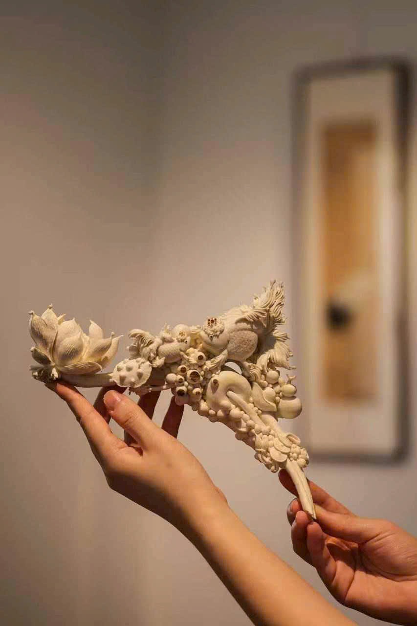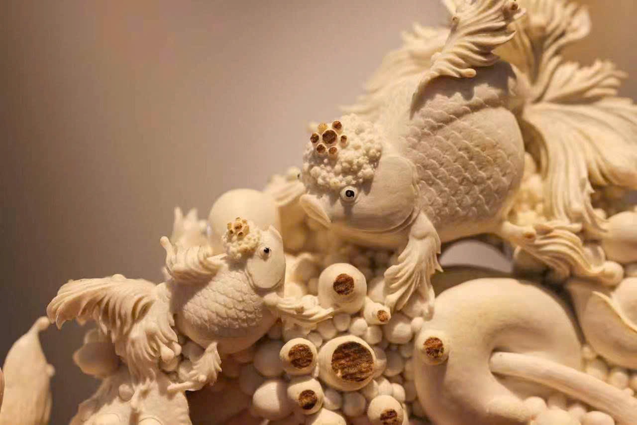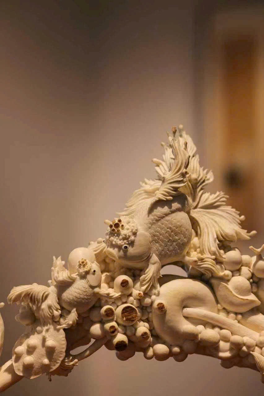Chọn lọc sừng hươu tự nhiên làm chất liệu, chạm khắc hình ảnh cá vàng bơi lội sinh động, bên cạnh là những thỏi vàng nguyên bảo.