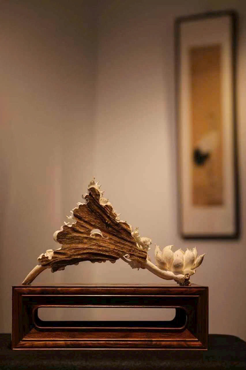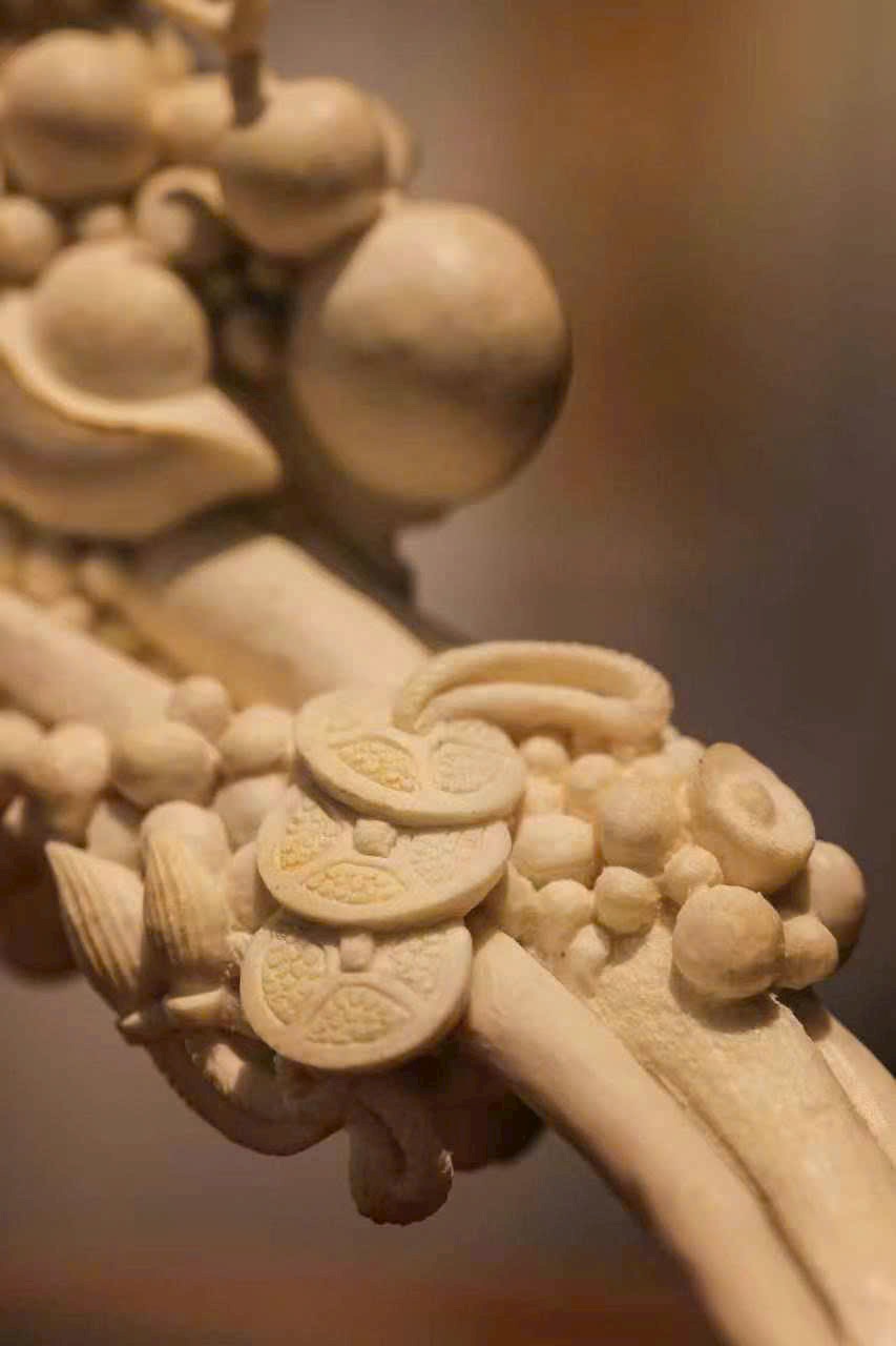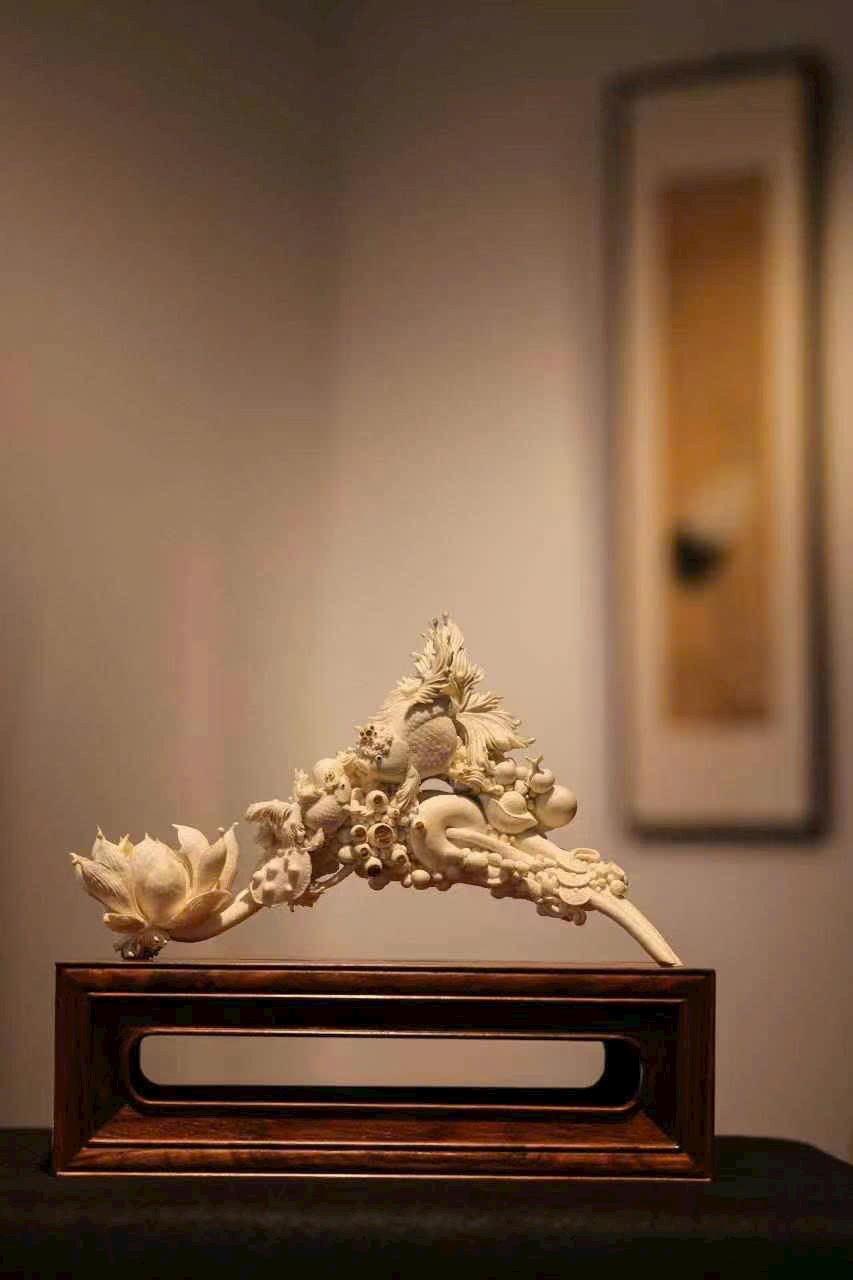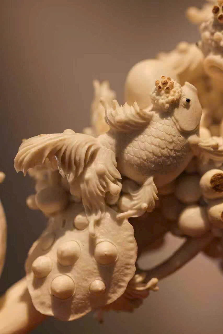 Chọn lọc sừng hươu tự nhiên làm chất liệu, chạm khắc hình ảnh cá vàng bơi lội sinh động, bên cạnh là những thỏi vàng nguyên bảo.