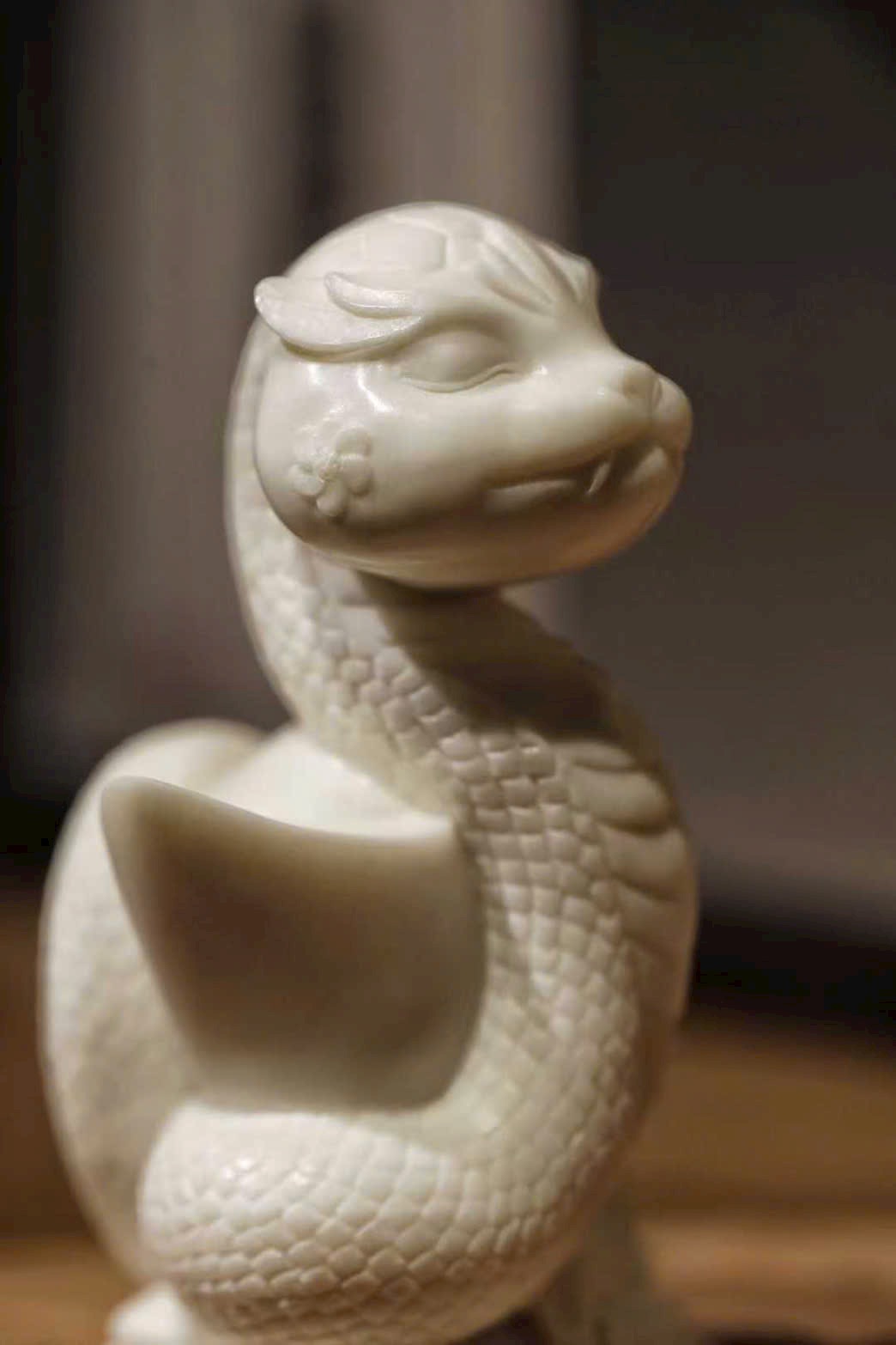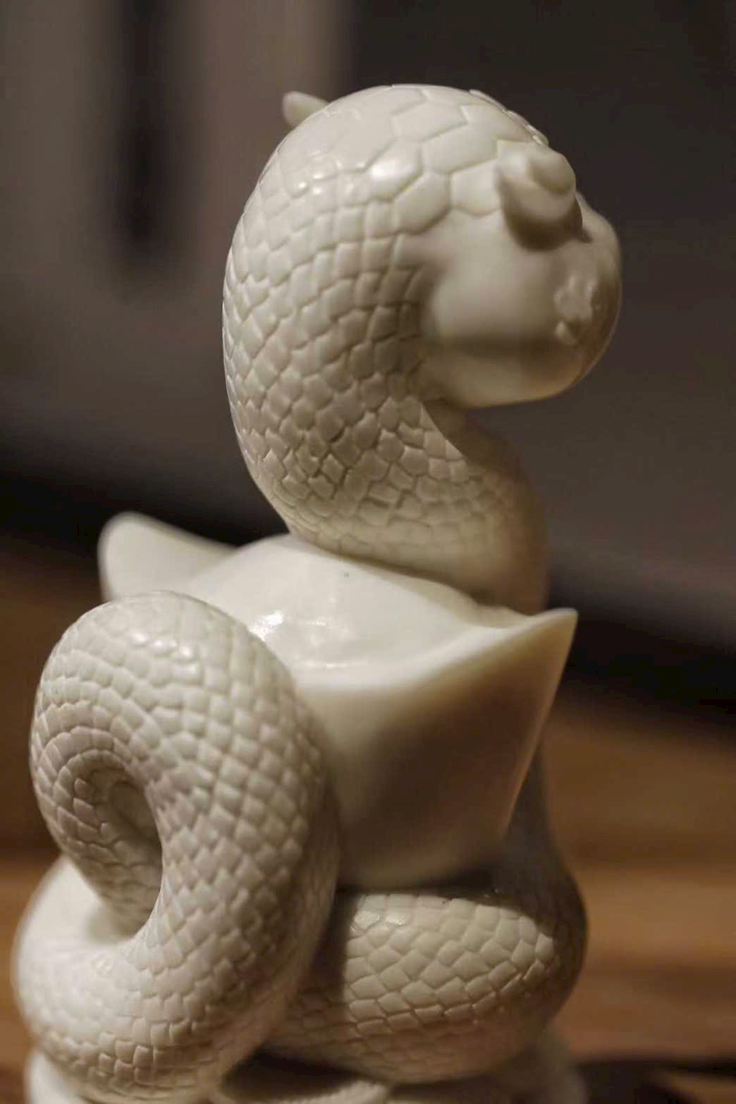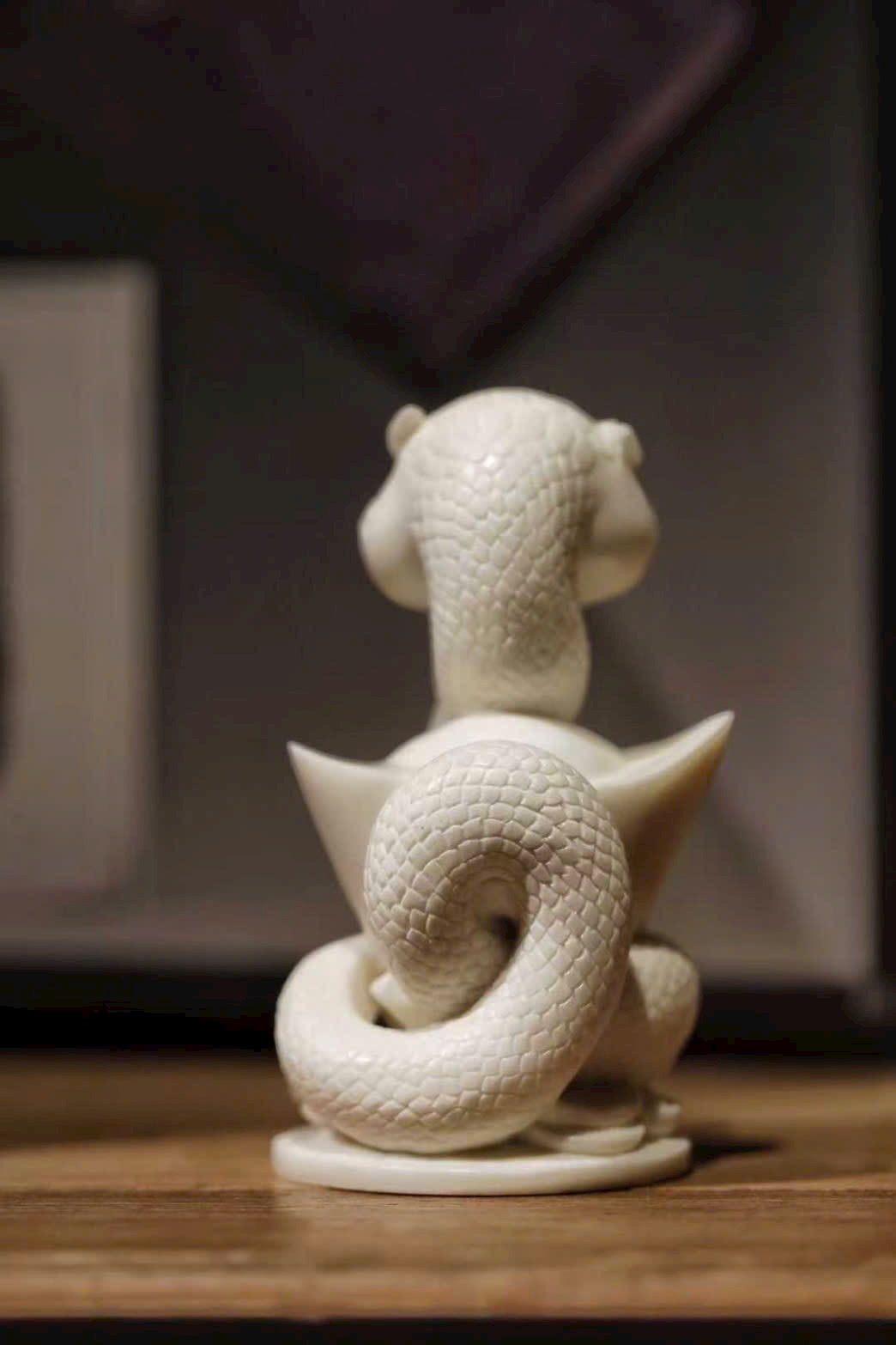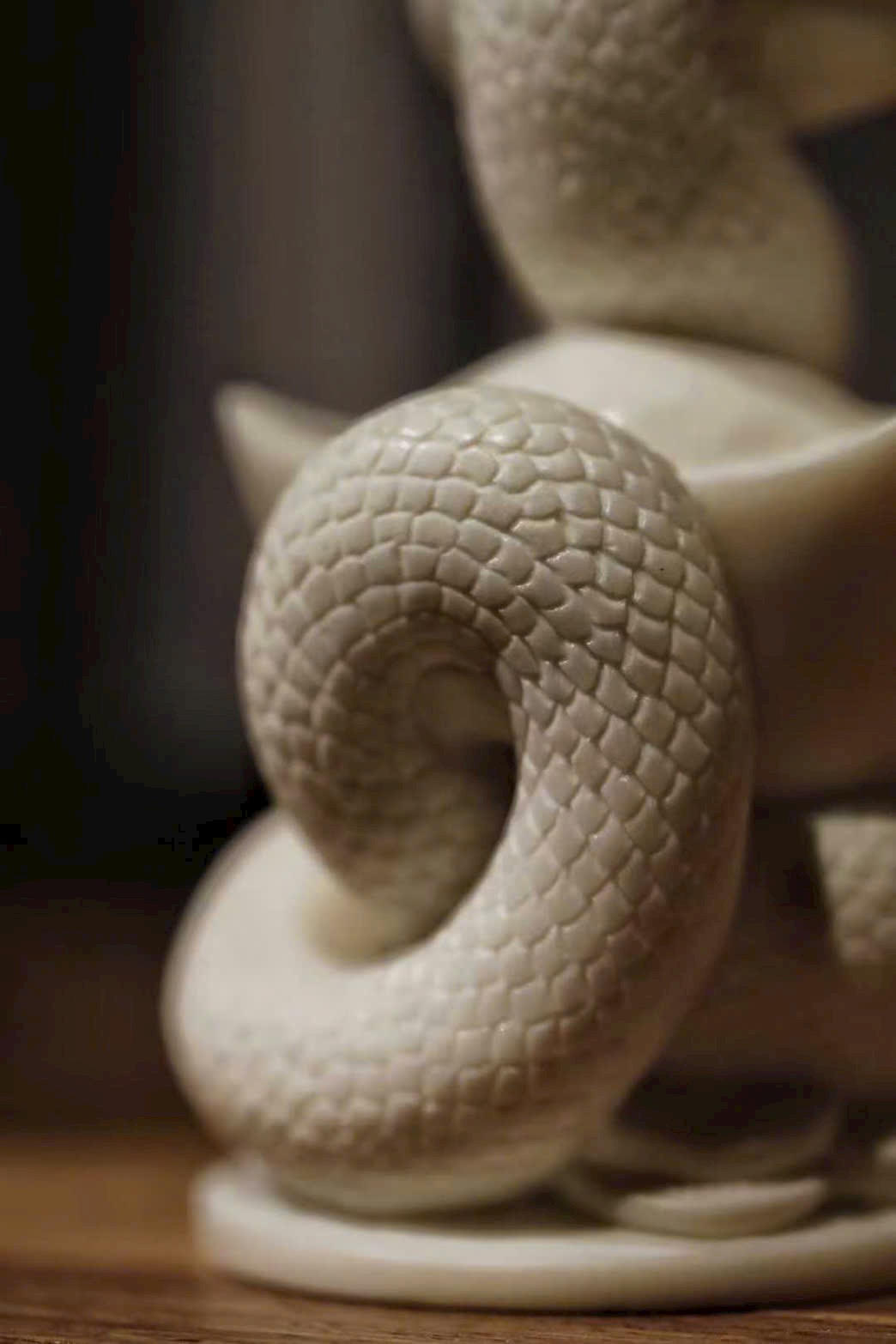 Lộc giác có chất ngọc óng mịn như ngọc, chạm khắc hình linh xà quấn quanh thỏi nguyên bảo. Vảy rắn được khắc họa dày đặc, sống động như thật; thỏi nguyên bảo tròn đầy, thần thái đáng yêu nhưng vẫn ẩn chứa vẻ linh khí. Tác phẩm mang hàm ý “phú quý quấn thân”, tài lộc sinh sôi.