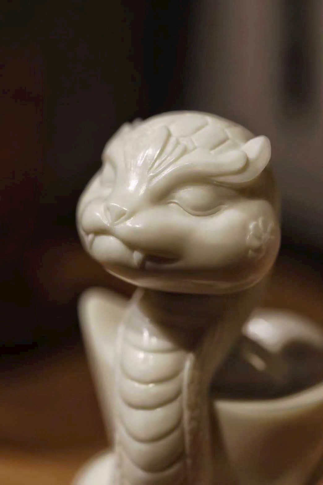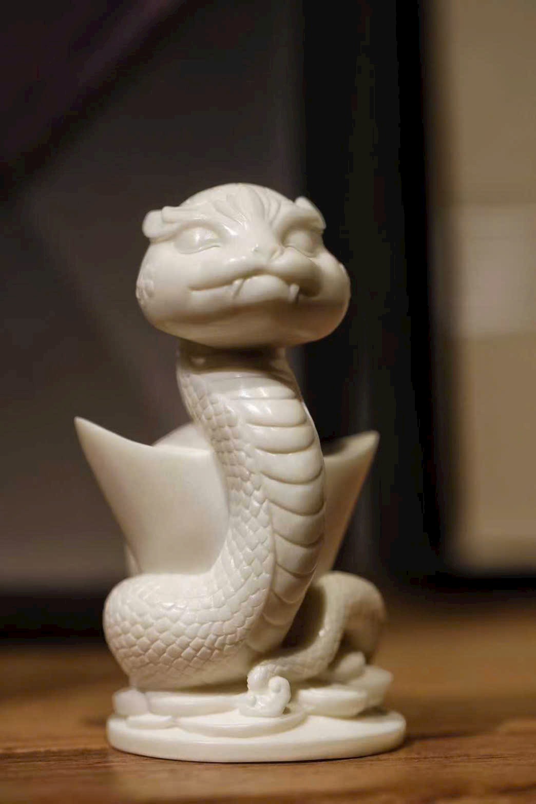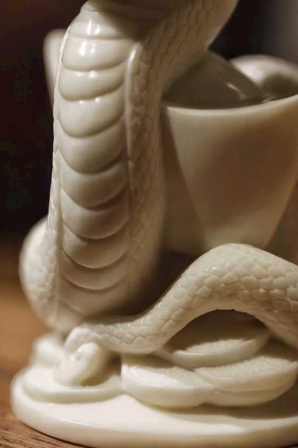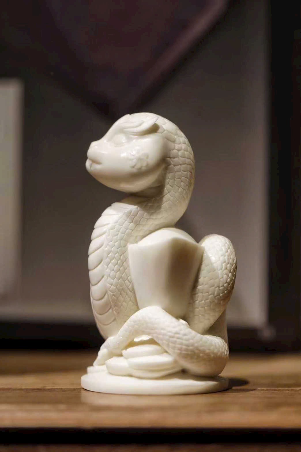 Lộc giác có chất ngọc óng mịn như ngọc, chạm khắc hình linh xà quấn quanh thỏi nguyên bảo. Vảy rắn được khắc họa dày đặc, sống động như thật; thỏi nguyên bảo tròn đầy, thần thái đáng yêu nhưng vẫn ẩn chứa vẻ linh khí. Tác phẩm mang hàm ý “phú quý quấn thân”, tài lộc sinh sôi.