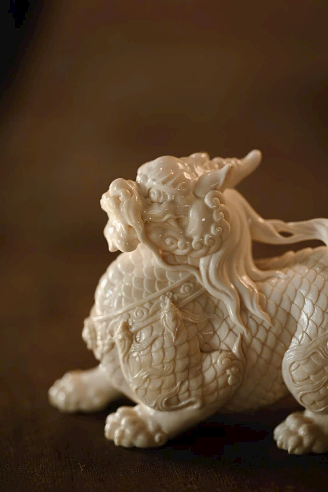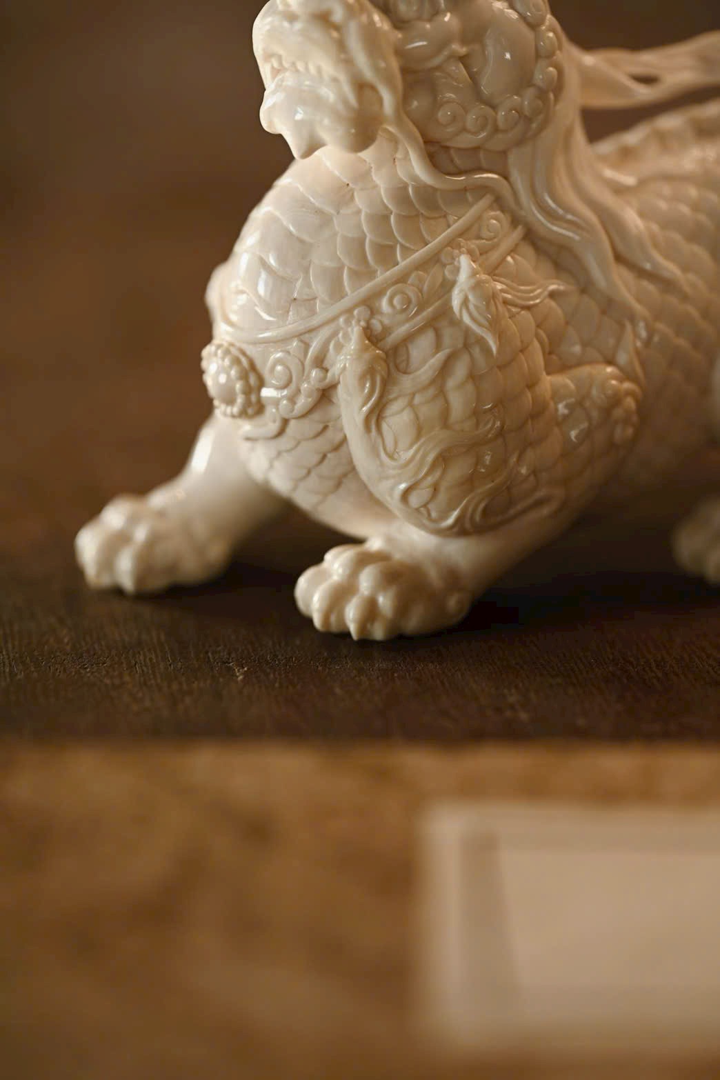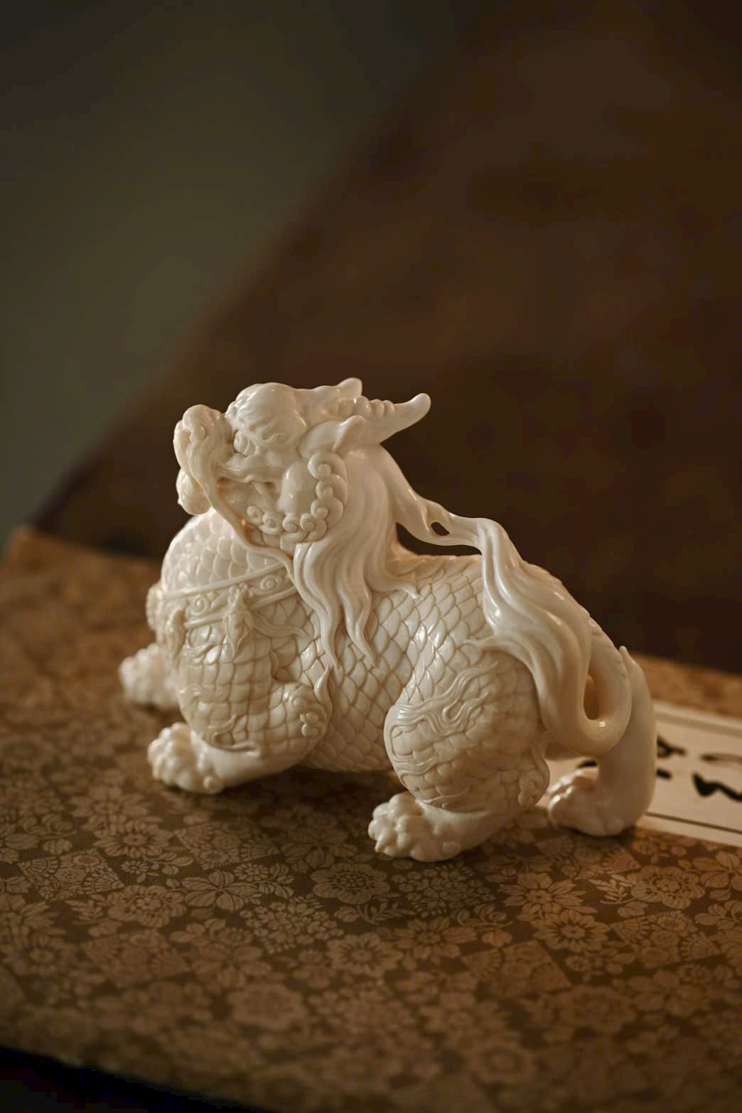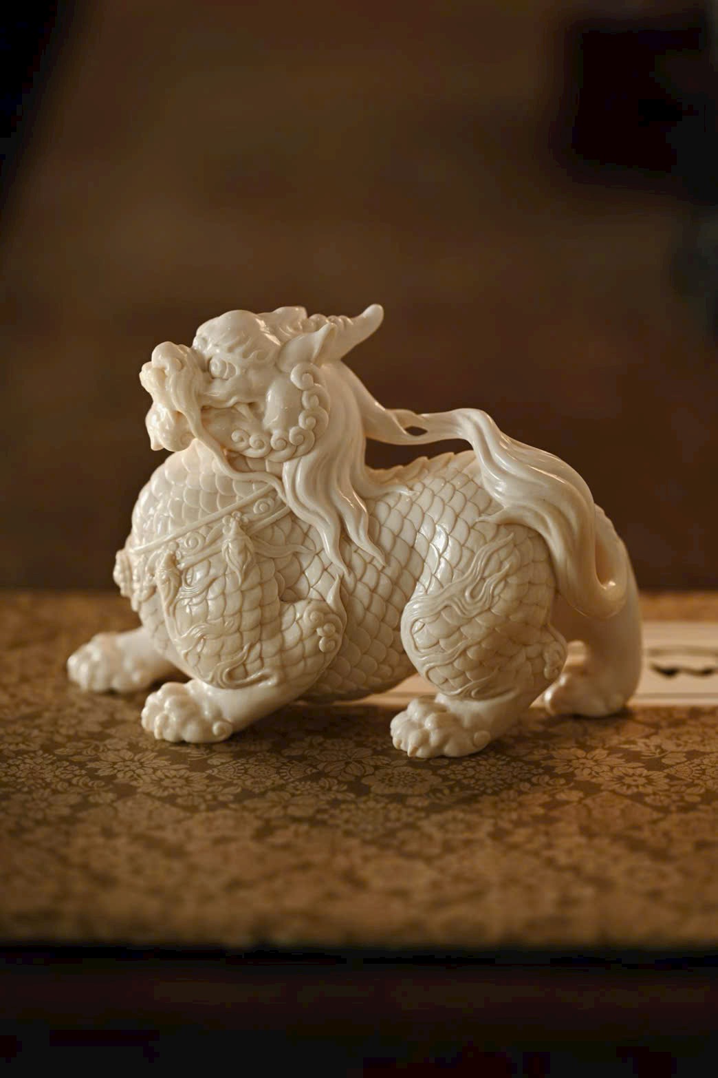 Tác phẩm sử dụng nhiều nguyên liệu, thể hiện dáng thế sống động của kỳ lân. Thân mình uốn chuyển linh hoạt, vảy giáp biến hóa theo thế, khí vận sinh động và toát lên vẻ cao quý. Toàn khối được chạm khắc tinh xảo, chất liệu dày dặn hiếm có. Đặt trên bàn án, mang ý nghĩa cát tường, phúc lộc tràn đầy.