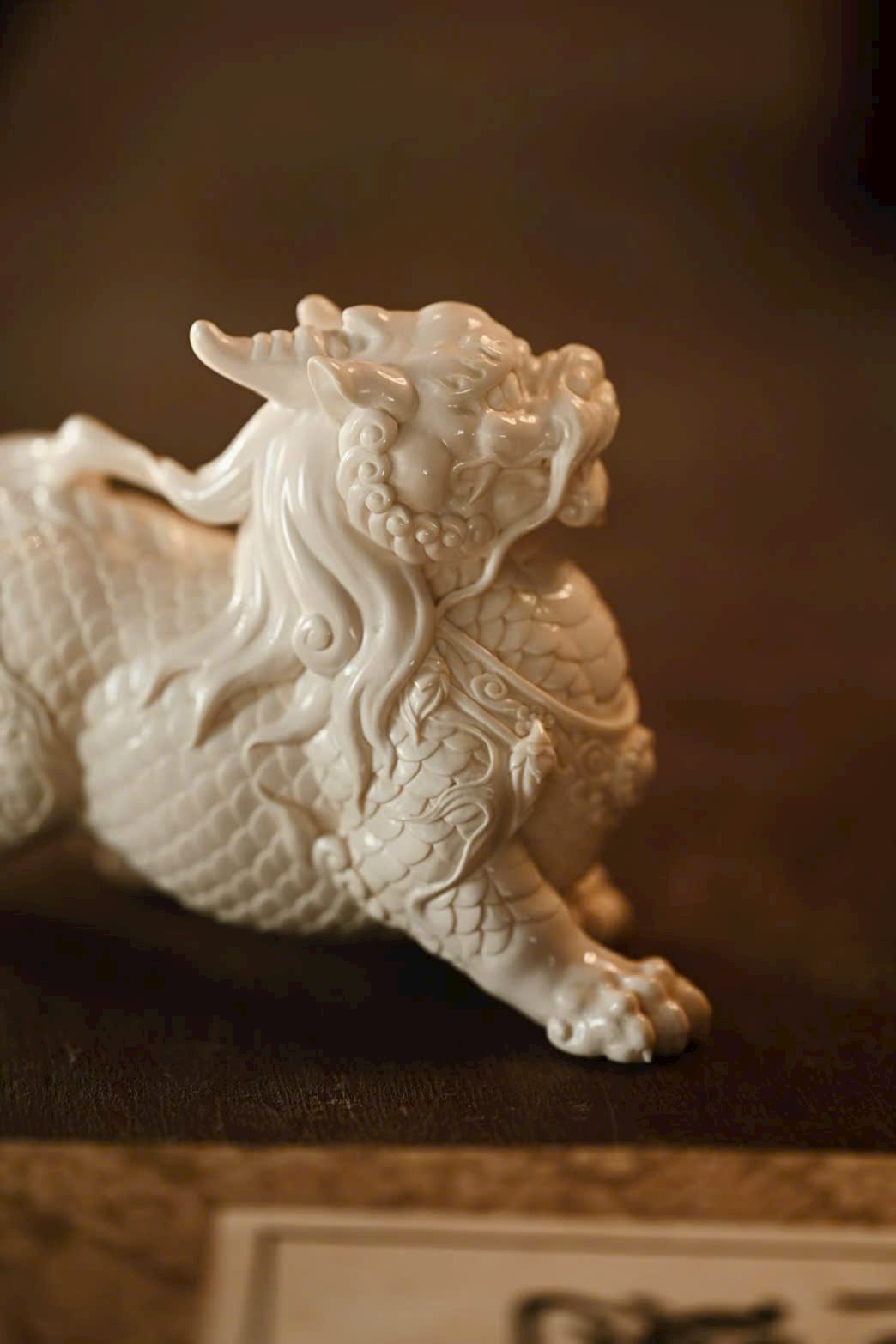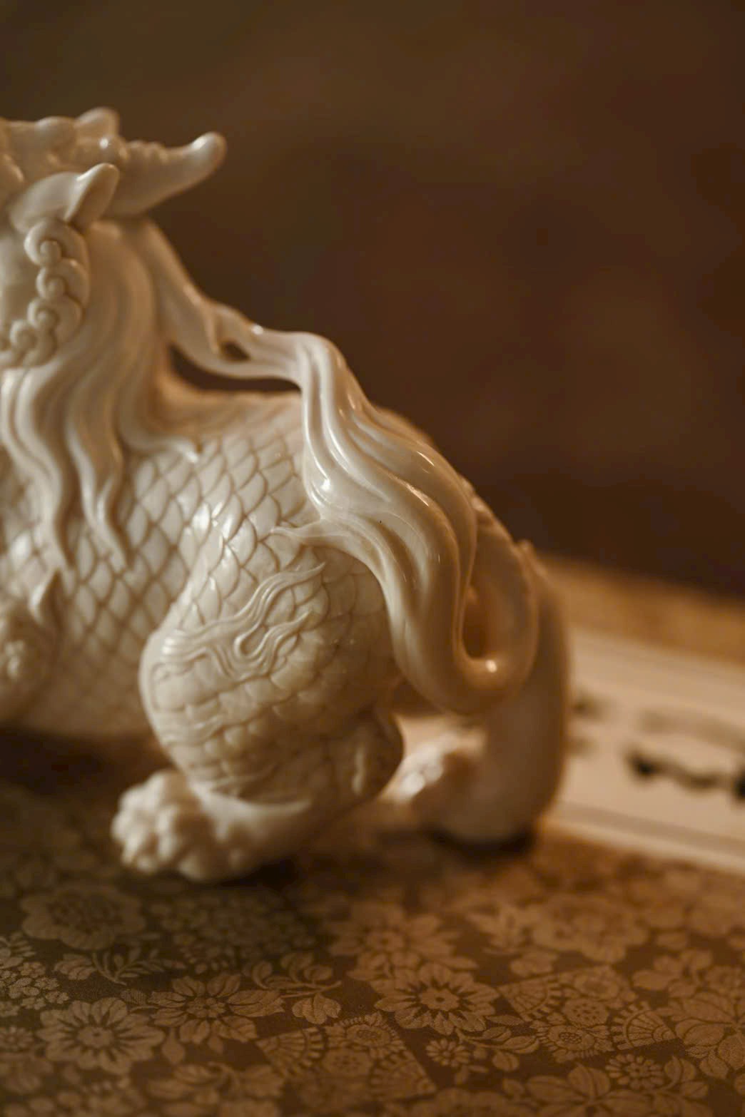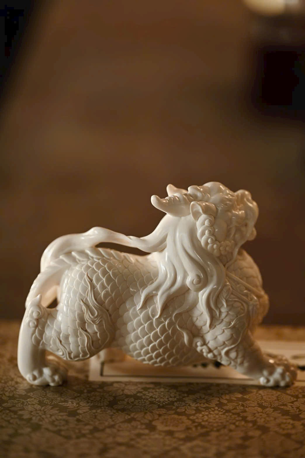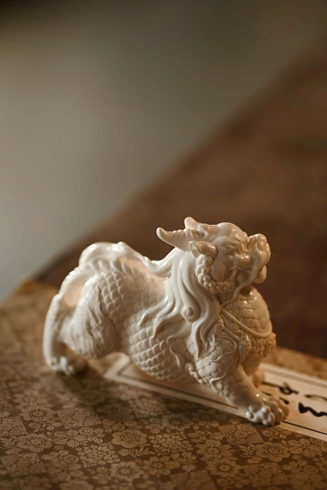 Tác phẩm sử dụng nhiều nguyên liệu, thể hiện dáng thế sống động của kỳ lân. Thân mình uốn chuyển linh hoạt, vảy giáp biến hóa theo thế, khí vận sinh động và toát lên vẻ cao quý. Toàn khối được chạm khắc tinh xảo, chất liệu dày dặn hiếm có. Đặt trên bàn án, mang ý nghĩa cát tường, phúc lộc tràn đầy.
