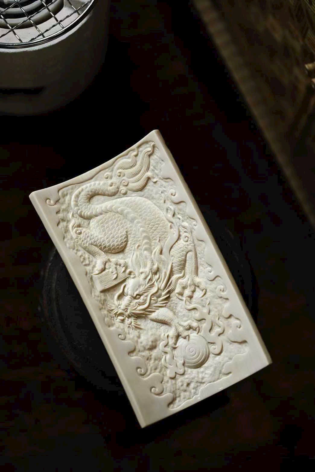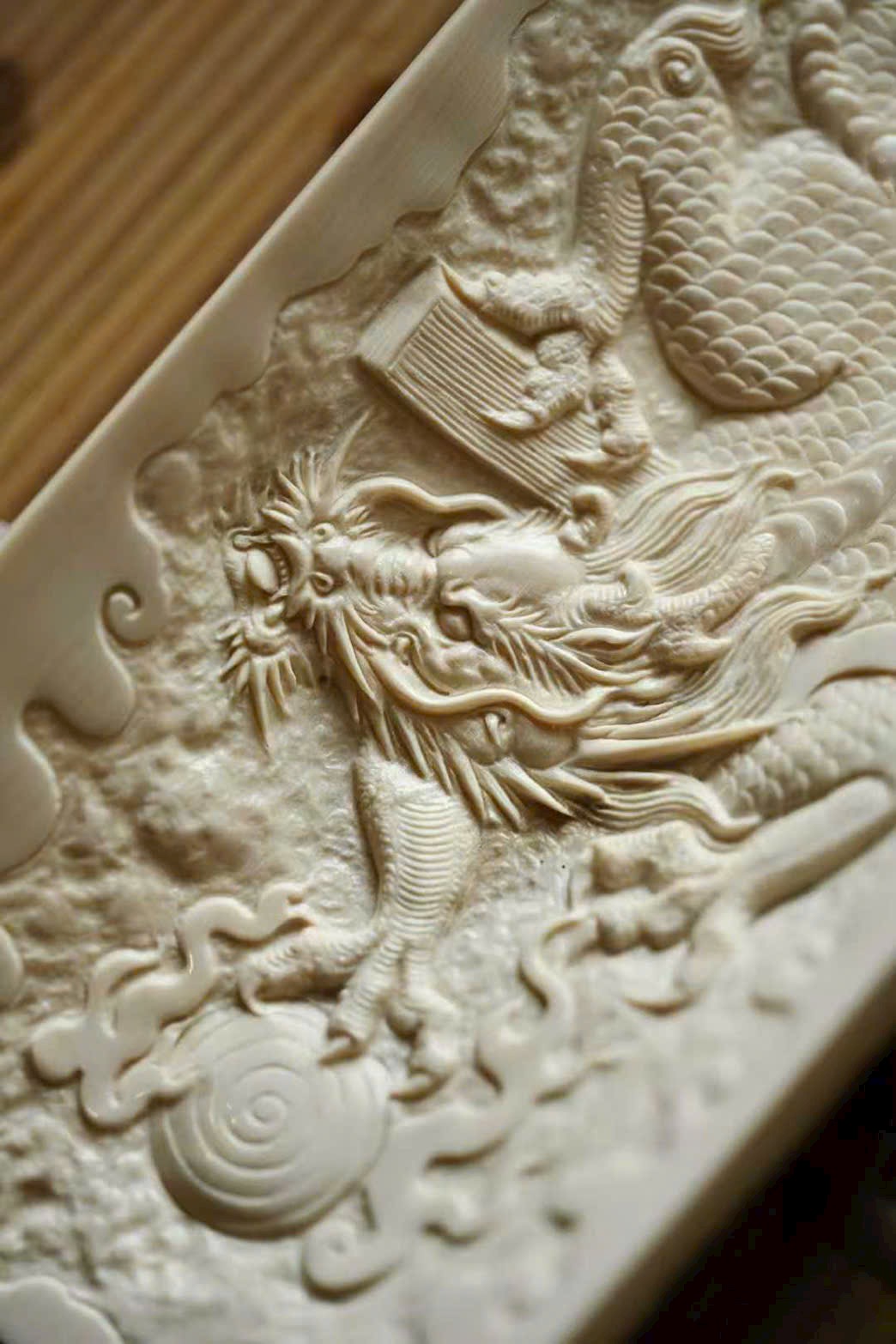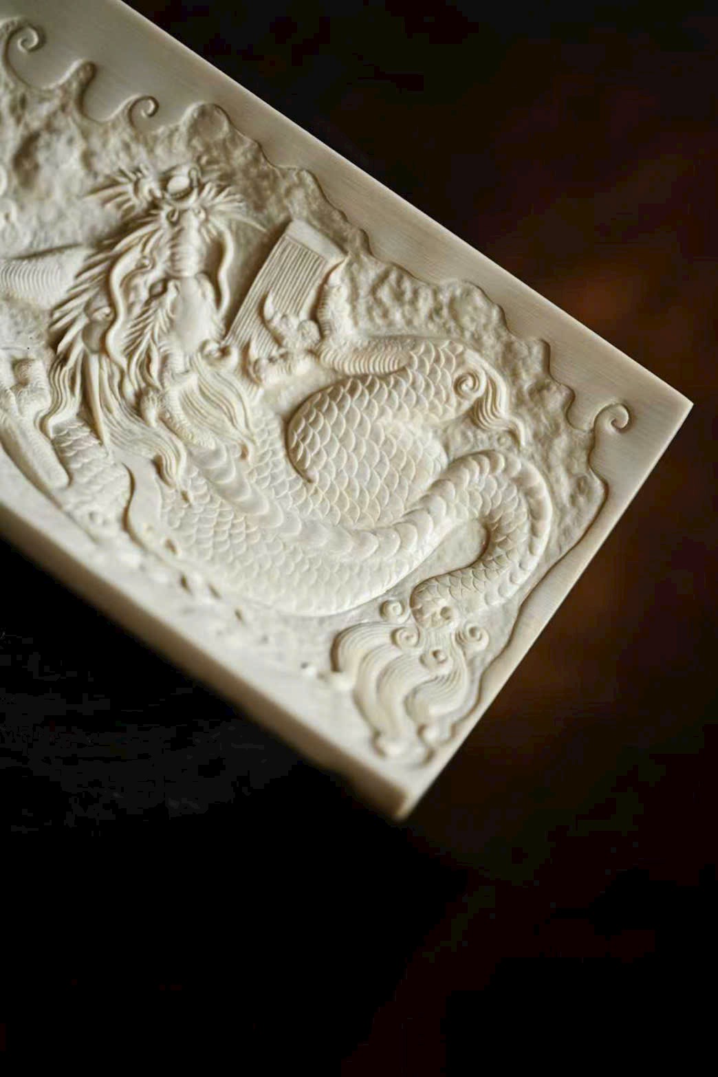 Dùng n.gà voi ma mút nguyên khối, mặt sau giữ nguyên lớp vỏ tự nhiên. Mặt chính chạm khắc kỳ lân dáng dấp uy mãnh – mắt sáng, bờm tung bay, thân khoác vảy giáp, mây lành bao quanh.