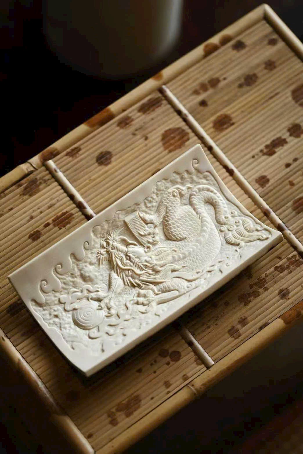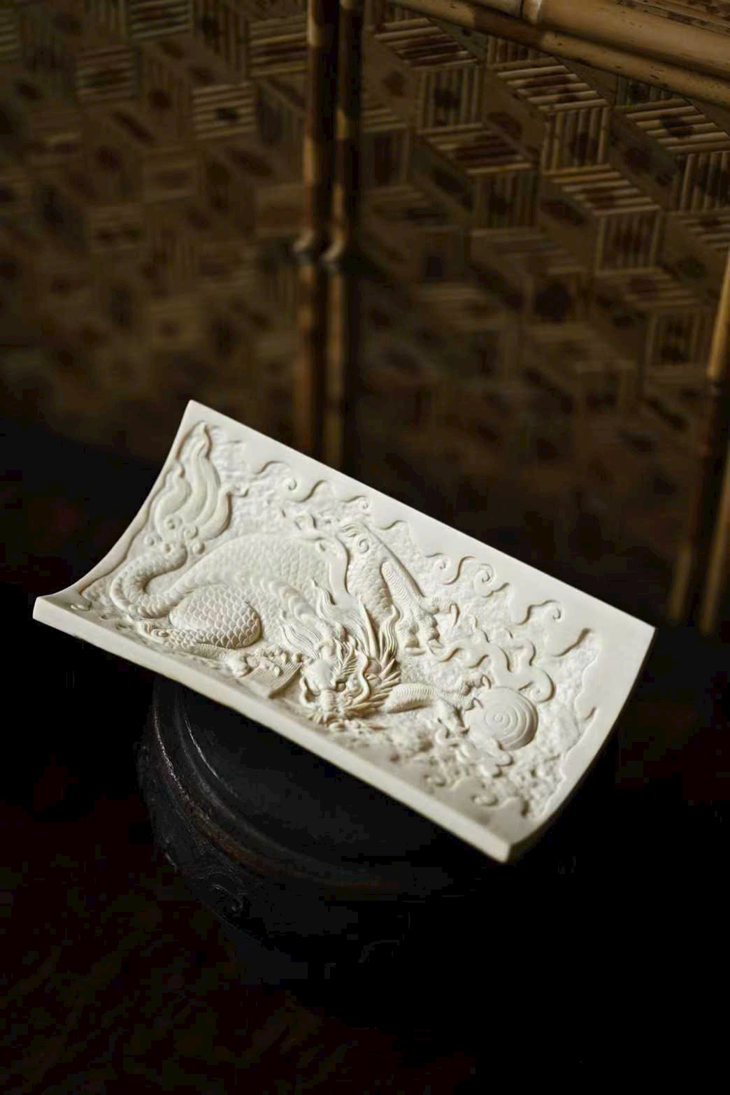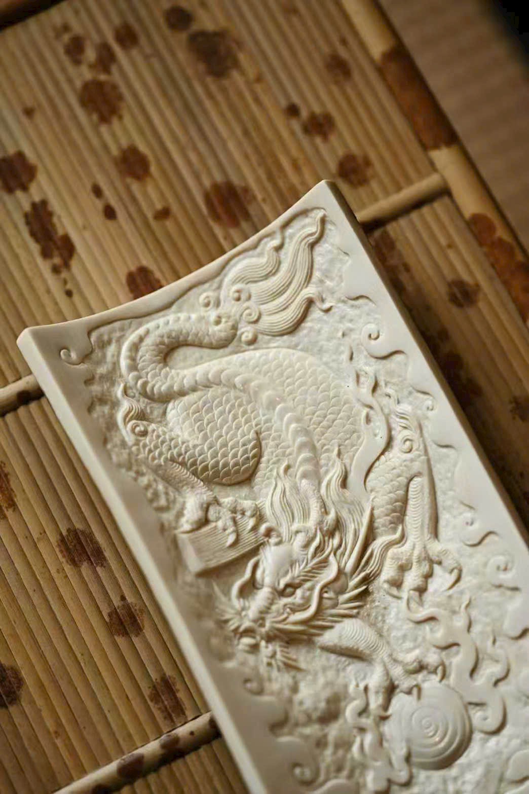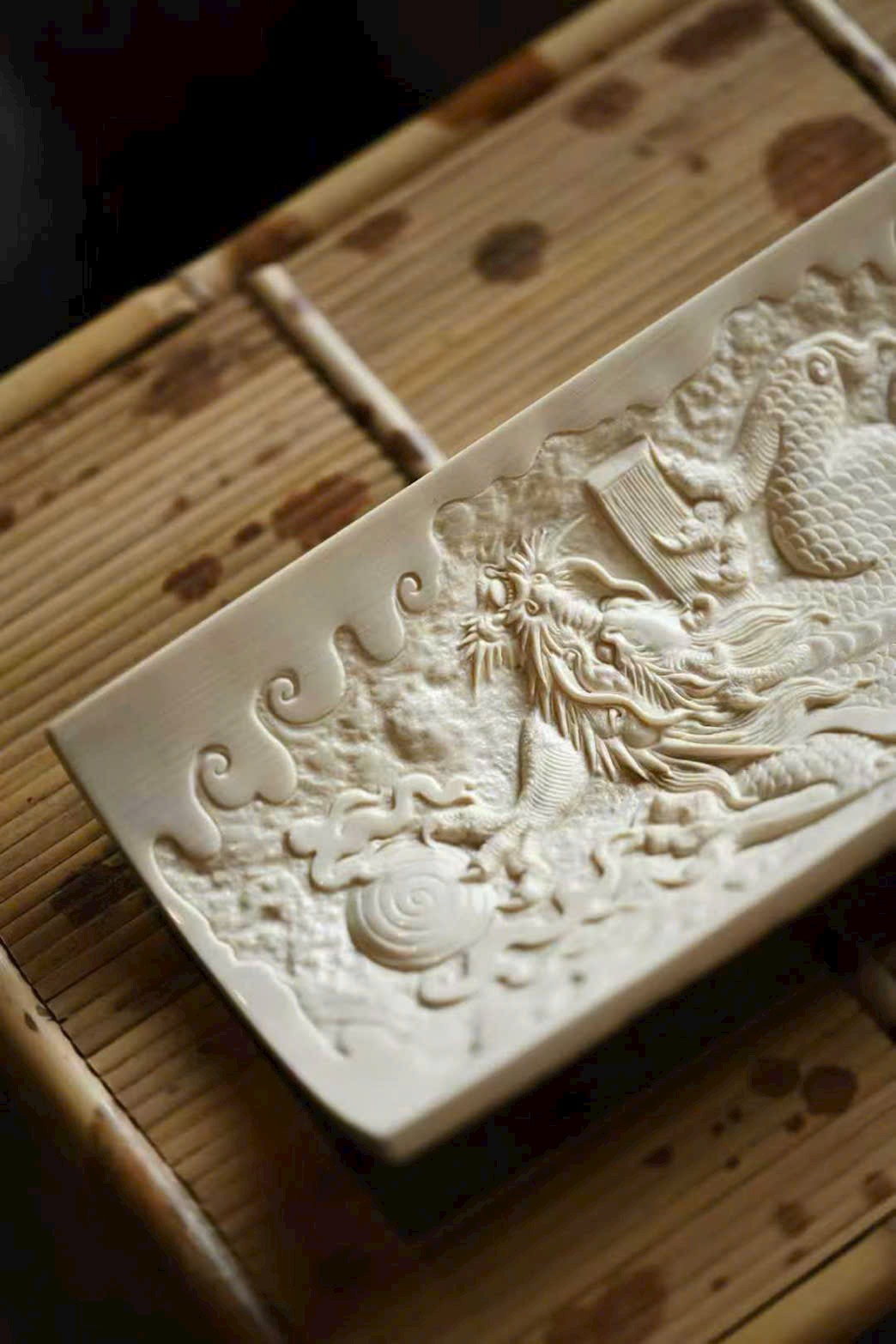 Dùng n.gà voi ma mút nguyên khối, mặt sau giữ nguyên lớp vỏ tự nhiên. Mặt chính chạm khắc kỳ lân dáng dấp uy mãnh – mắt sáng, bờm tung bay, thân khoác vảy giáp, mây lành bao quanh.