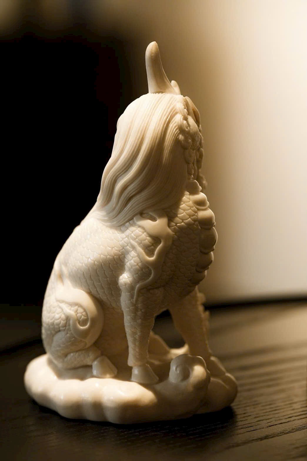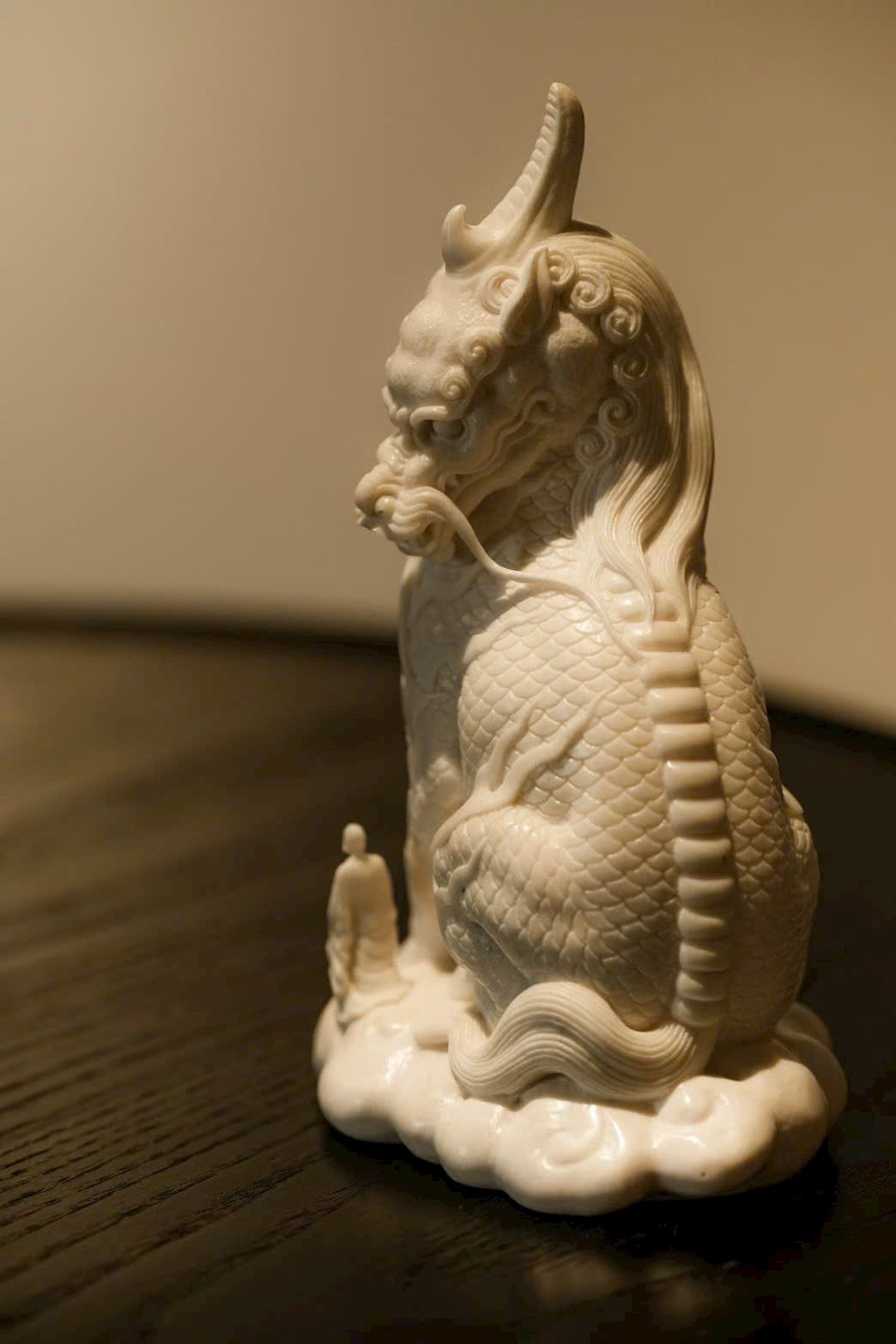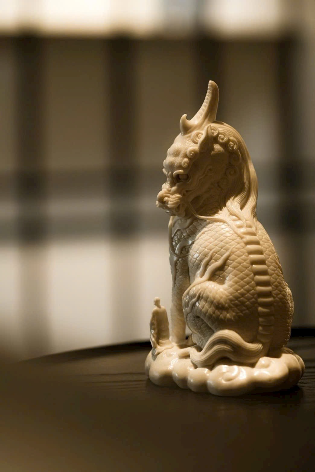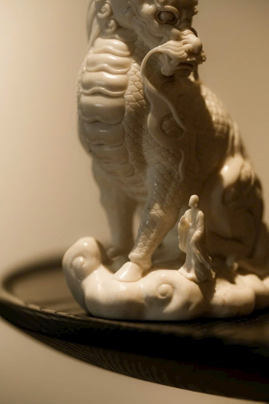 Lời sấm “Ứng Long tích lôi, Kỳ Lân dưỡng hỏa” được khắc họa hữu hình qua tác phẩm hoàn toàn thủ công, thấm đượm tinh hoa cổ kim. Đầu rồng hơi ngẩng, thân sư thu mình, nằm phục mà sống lưng cong vồng, cơ bắp sau gân guốc nổi rõ, văn phù điêu hình táo thiết giận dữ giương lên, móng vuốt chạm đất, khí thế dồn tụ như muốn đạp vỡ trần thế ô trọc. Trong dáng “vô tướng vấn đạo”, rồng và lân như đối thoại, khí vận văn nhã mà hồn hậu, công xảo tinh vi song không mất thần, đạt đến cảnh giới tuyệt diệu.
