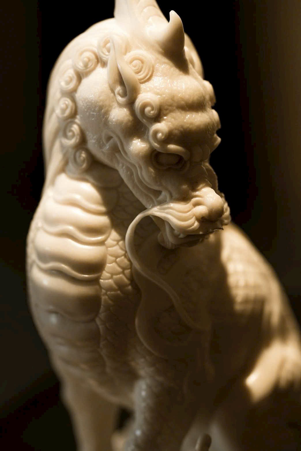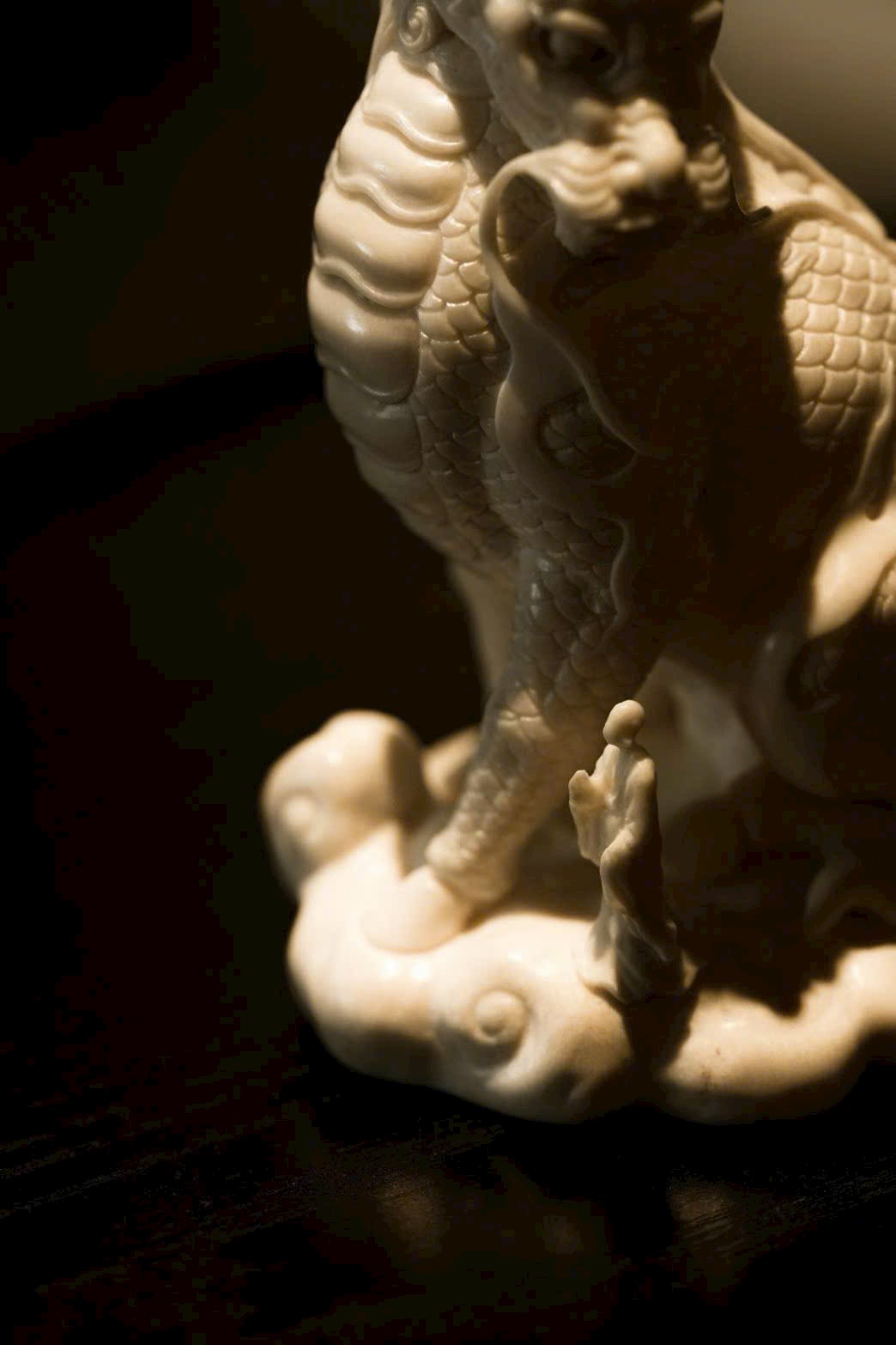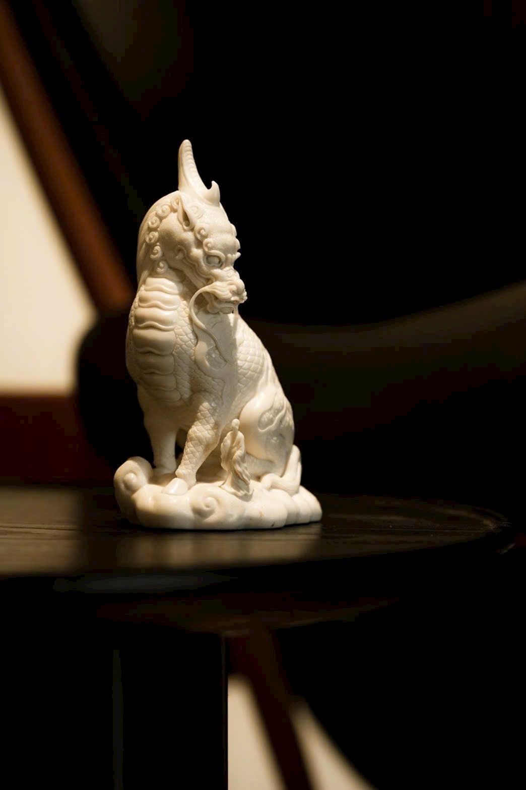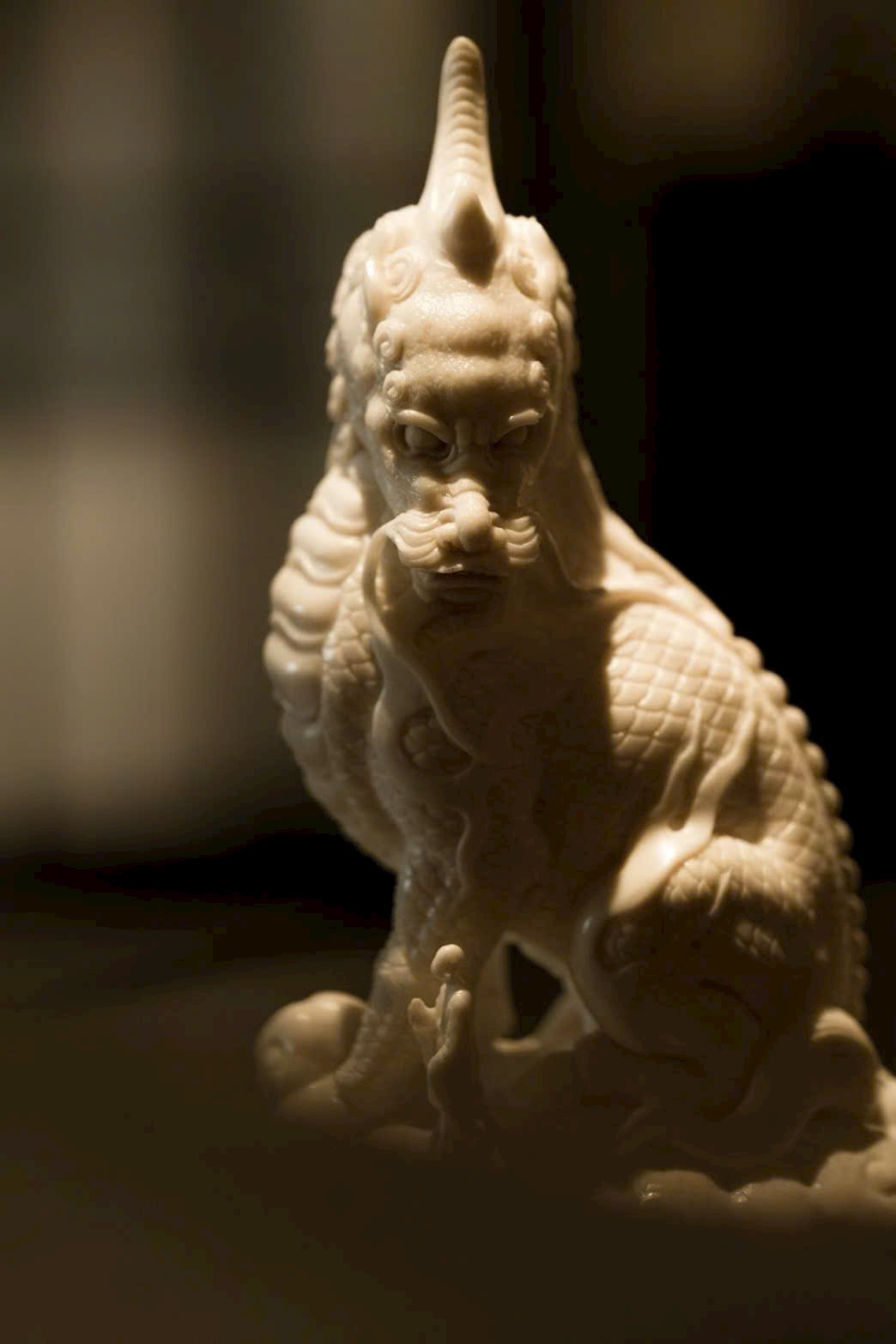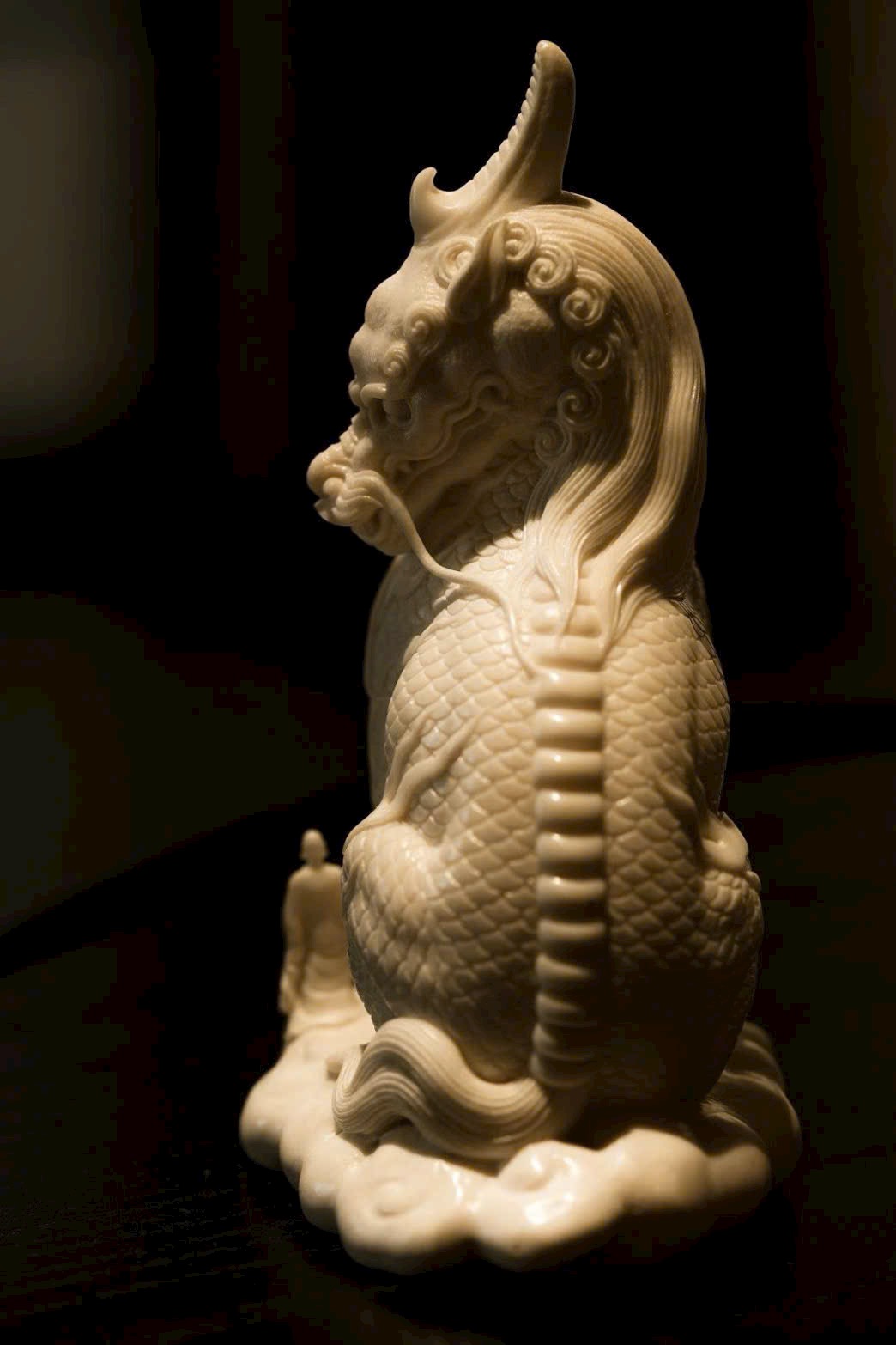 Lời sấm “Ứng Long tích lôi, Kỳ Lân dưỡng hỏa” được khắc họa hữu hình qua tác phẩm hoàn toàn thủ công, thấm đượm tinh hoa cổ kim. Đầu rồng hơi ngẩng, thân sư thu mình, nằm phục mà sống lưng cong vồng, cơ bắp sau gân guốc nổi rõ, văn phù điêu hình táo thiết giận dữ giương lên, móng vuốt chạm đất, khí thế dồn tụ như muốn đạp vỡ trần thế ô trọc. Trong dáng “vô tướng vấn đạo”, rồng và lân như đối thoại, khí vận văn nhã mà hồn hậu, công xảo tinh vi song không mất thần, đạt đến cảnh giới tuyệt diệu.