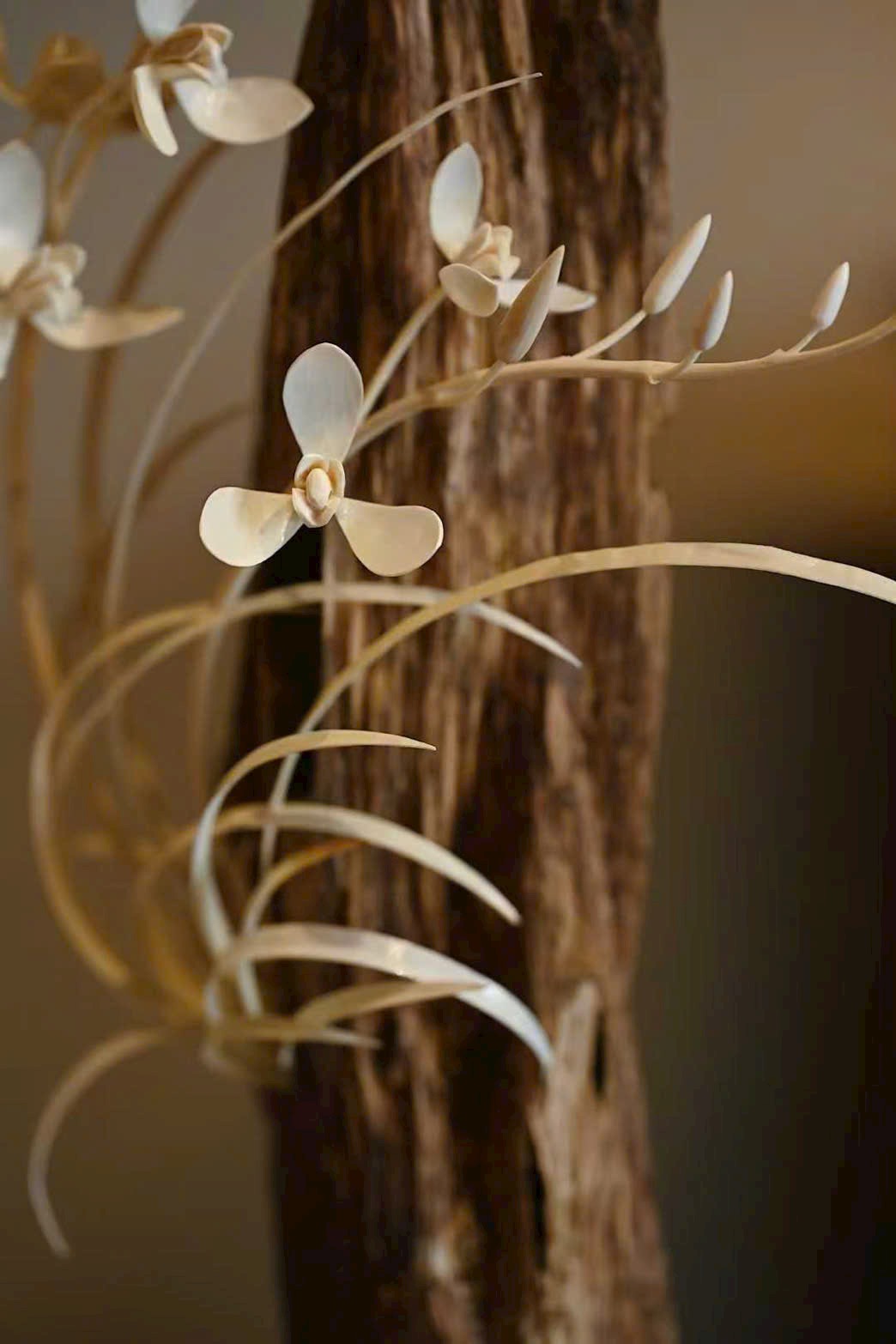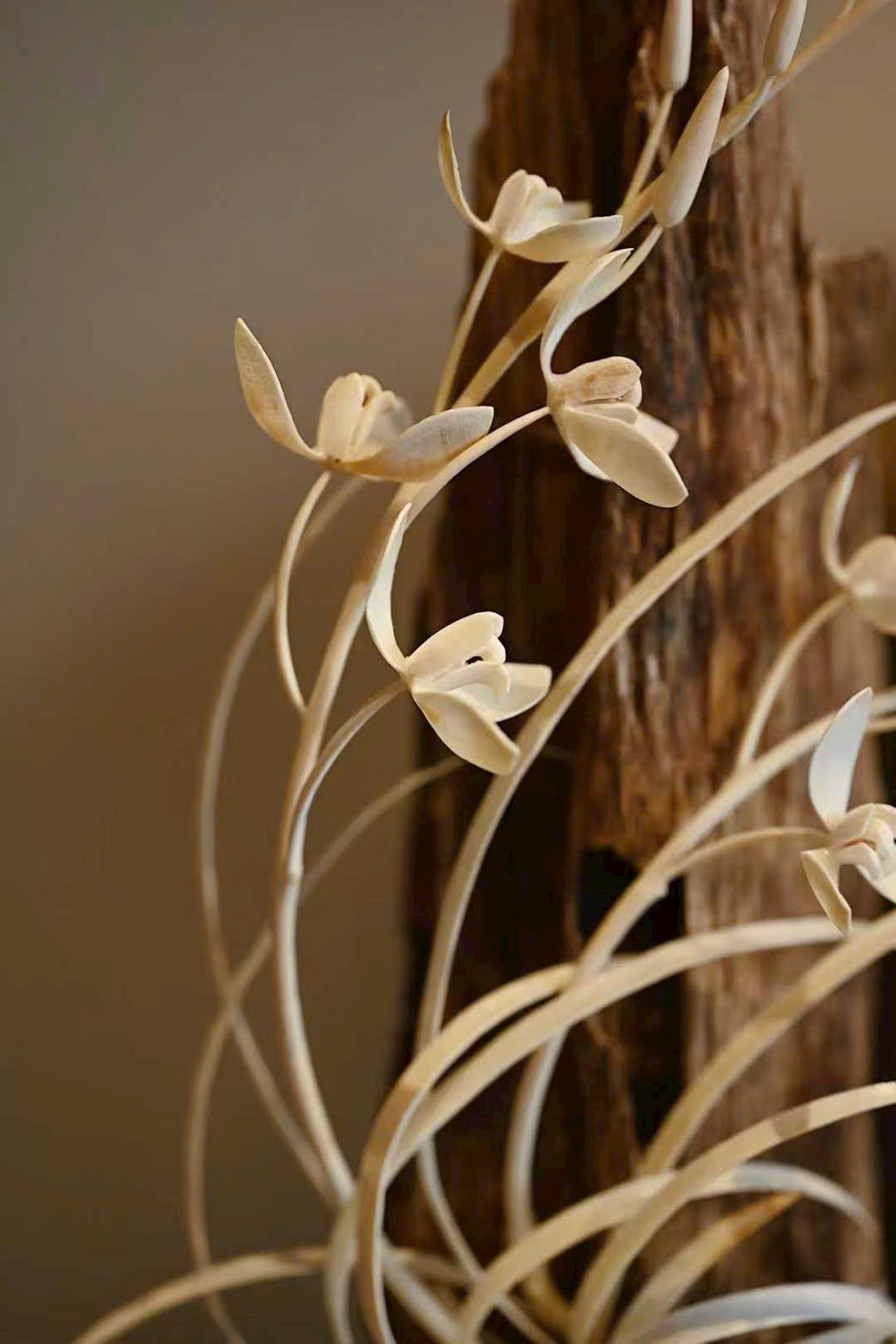 Tác phẩm khắc họa những đóa lan nụ căng tròn, búp thì e ấp chờ nở, hoa thì rực rỡ khoe hương.