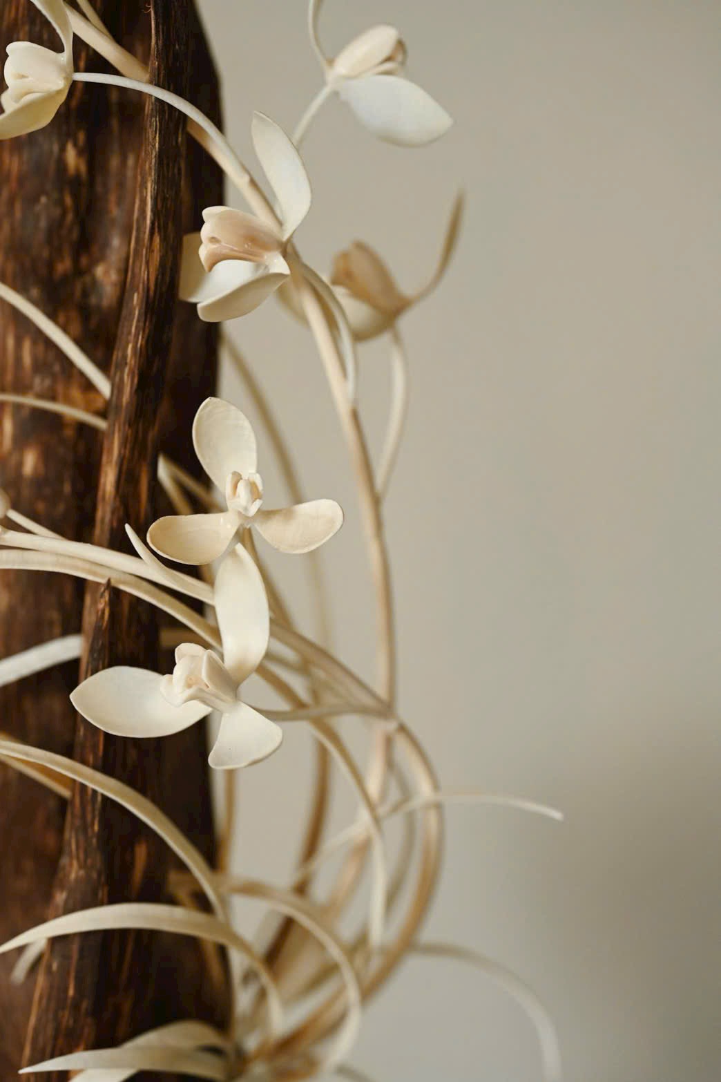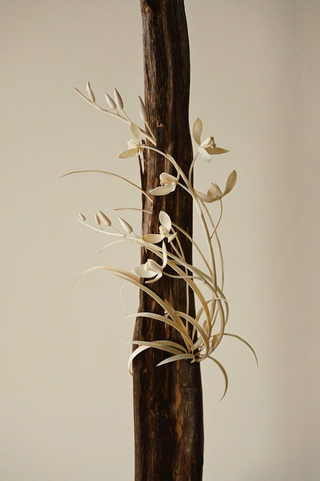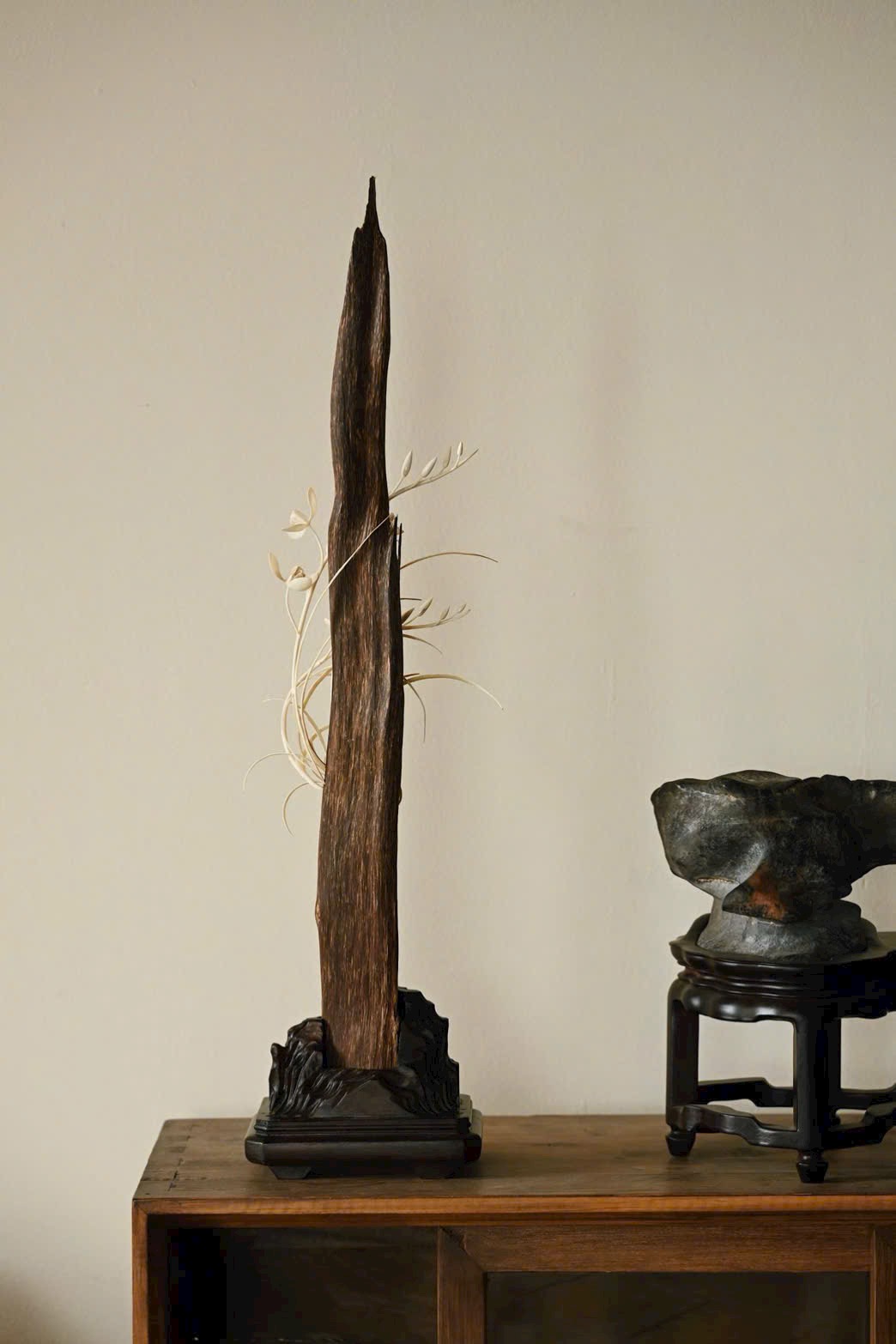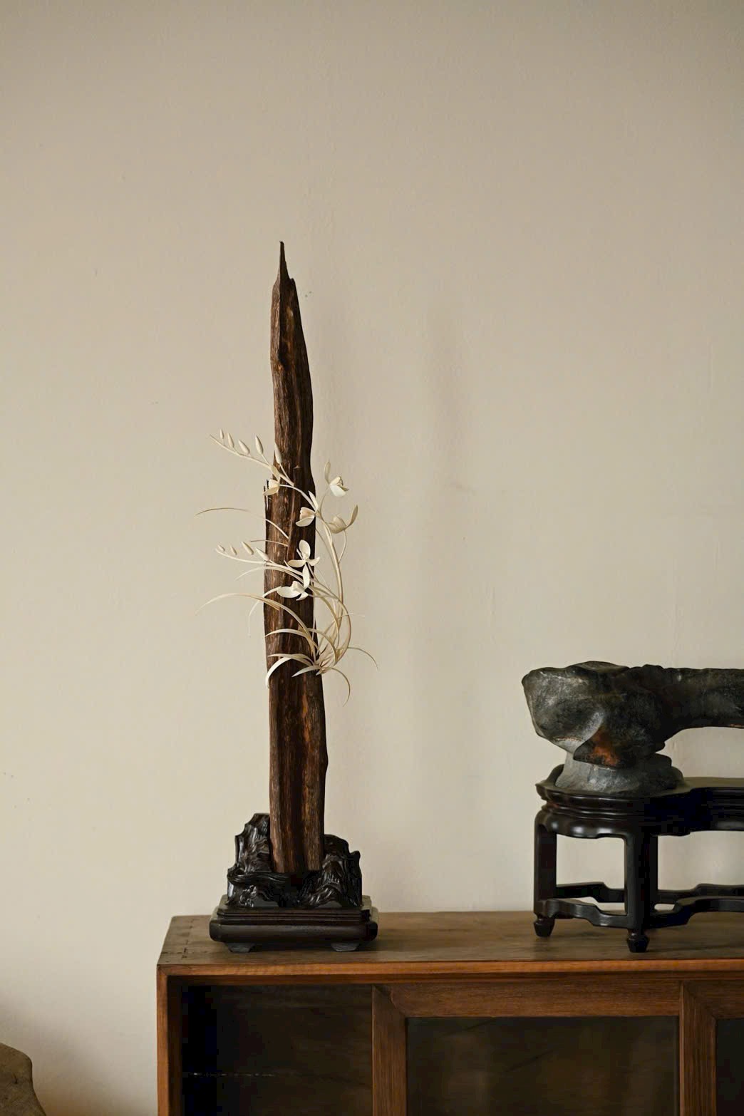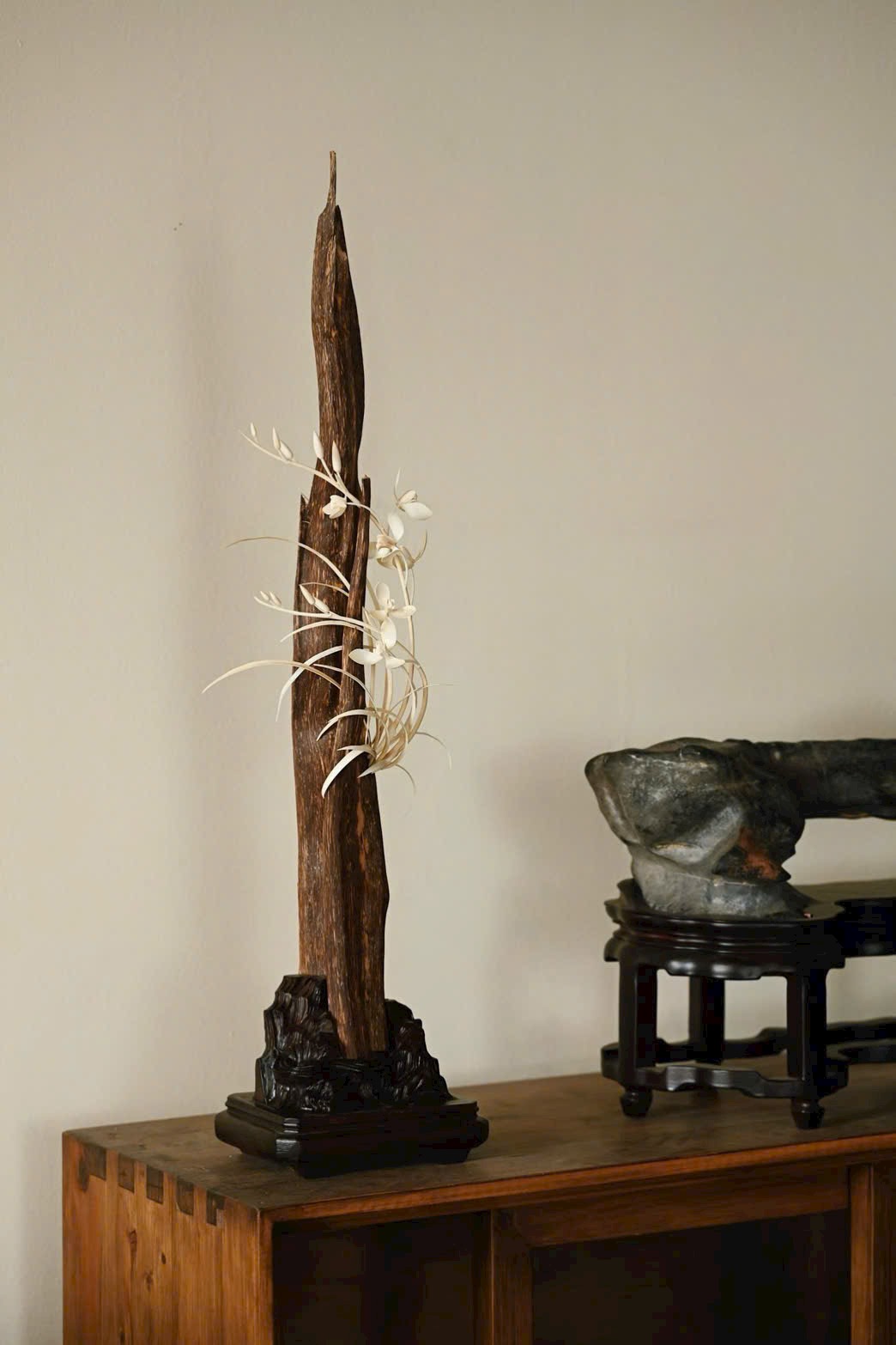 Chọn liệu tự nhiên theo dáng sẵn có, tựa núi đá cốt cách thanh tú, khảm hoa lan thanh khiết trầm tĩnh. Đặt nơi trà án hay thư bàn, tạo cảnh tao nhã, thêm phần ý vị.
