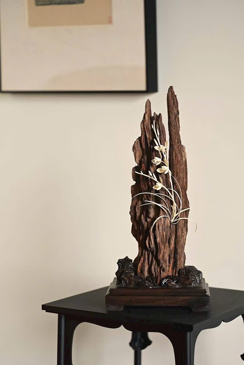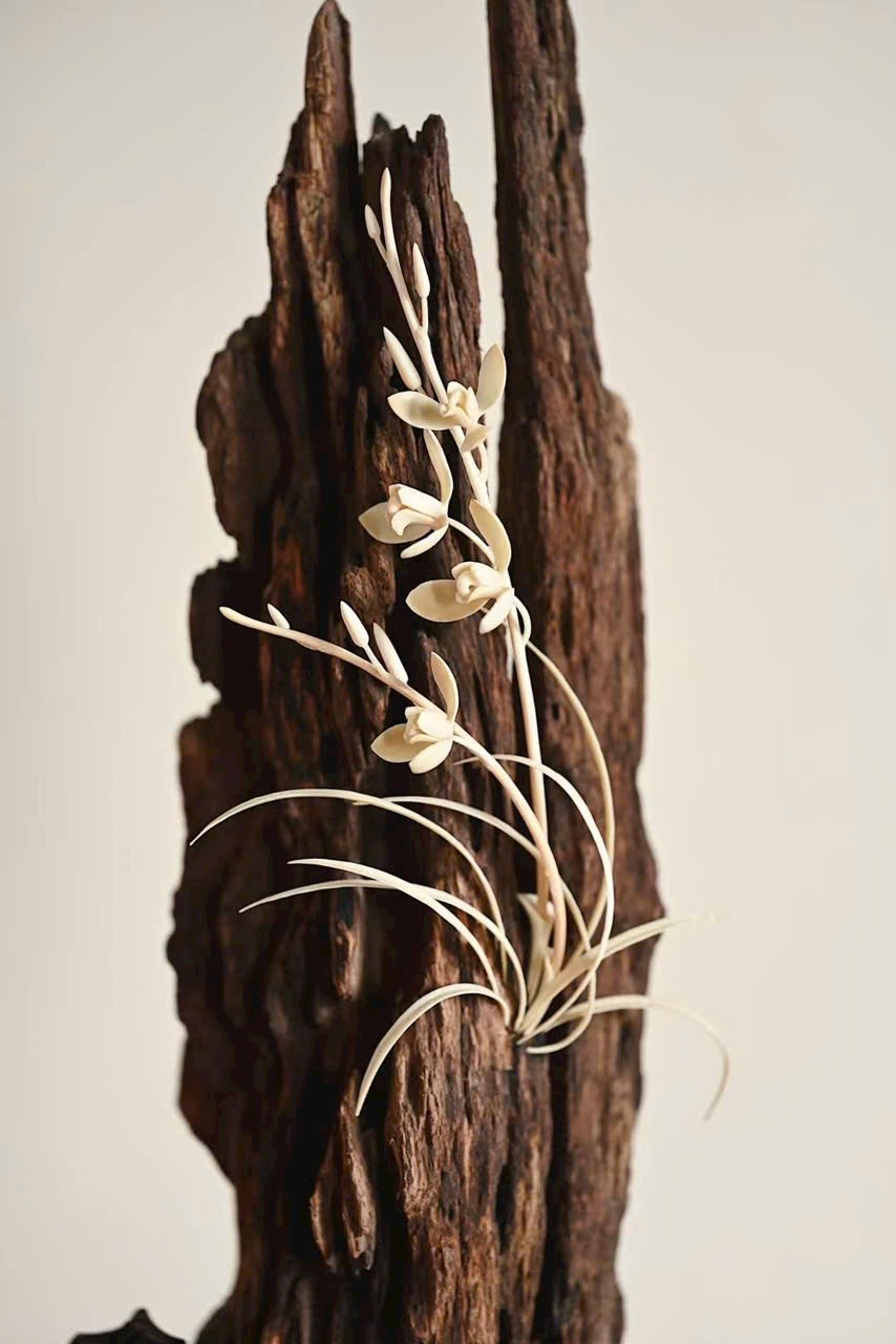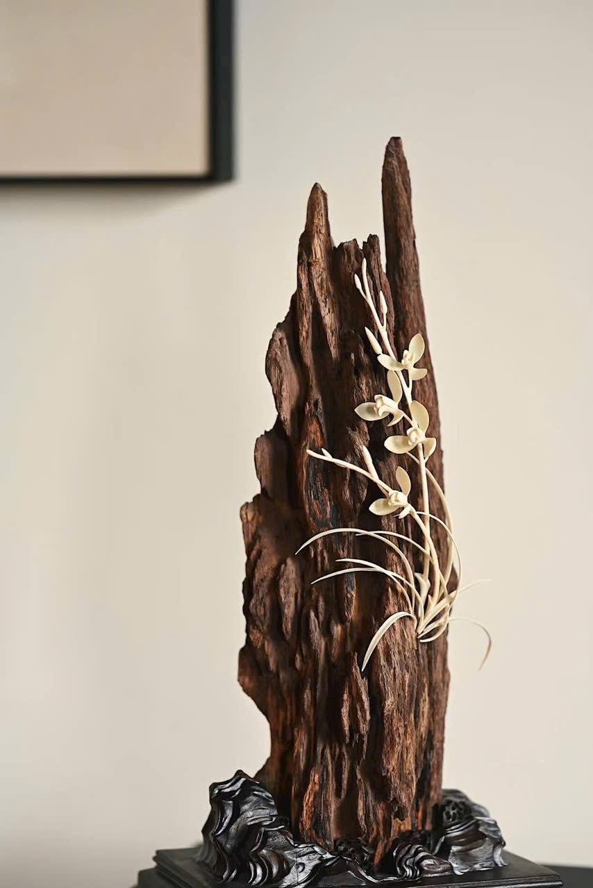 Tác phẩm phối hợp giữa trầm hương quý hiếm và n.gà voi M.amut, khắc họa hoa lan thanh nhã – biểu tượng của phẩm chất cao quý, kín đáo mà thanh tao. Lan tỏa hương trầm dịu nhẹ, mang đậm phong vị thiền định và mỹ học phương Đông.