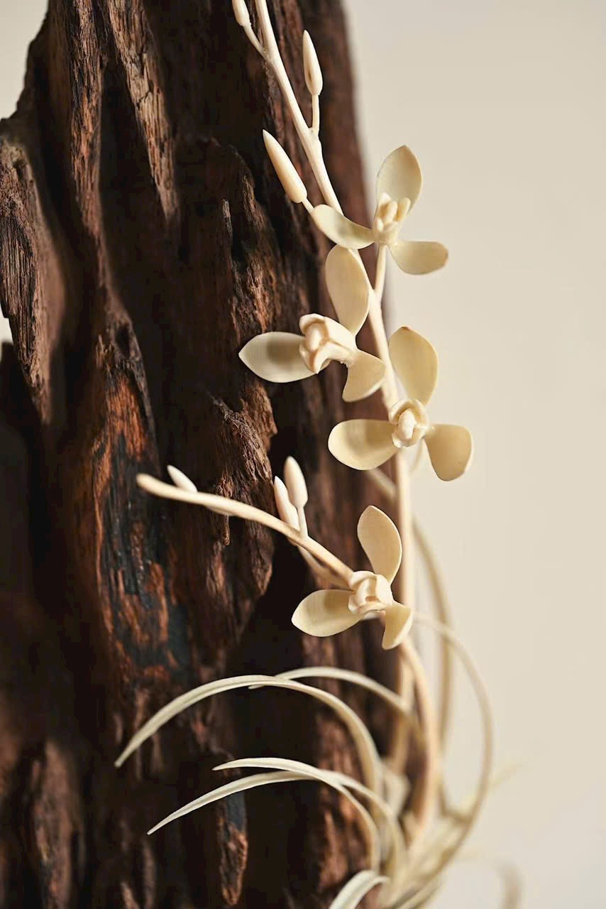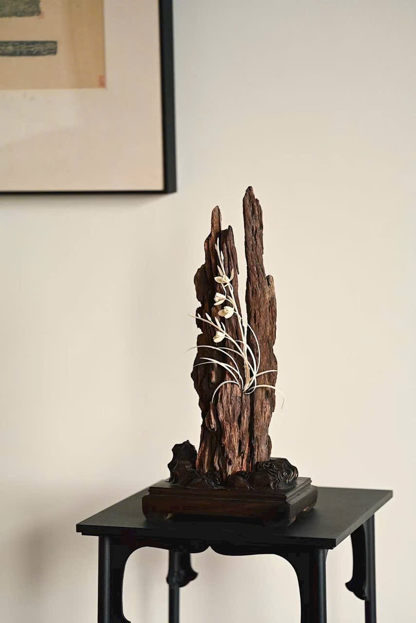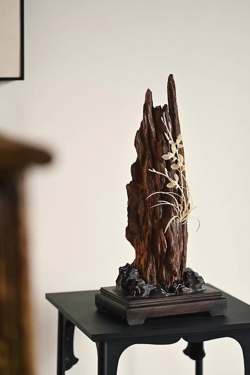 Tác phẩm phối hợp giữa trầm hương quý hiếm và n.gà voi M.amut, khắc họa hoa lan thanh nhã – biểu tượng của phẩm chất cao quý, kín đáo mà thanh tao. Lan tỏa hương trầm dịu nhẹ, mang đậm phong vị thiền định và mỹ học phương Đông.