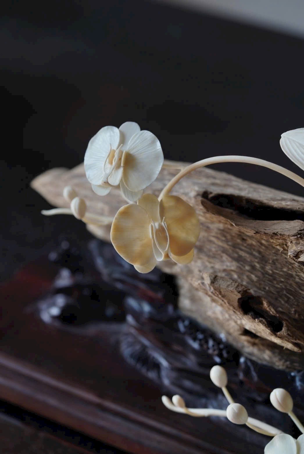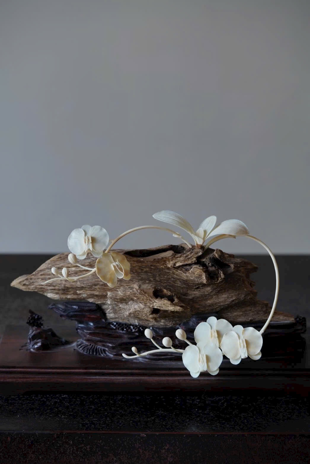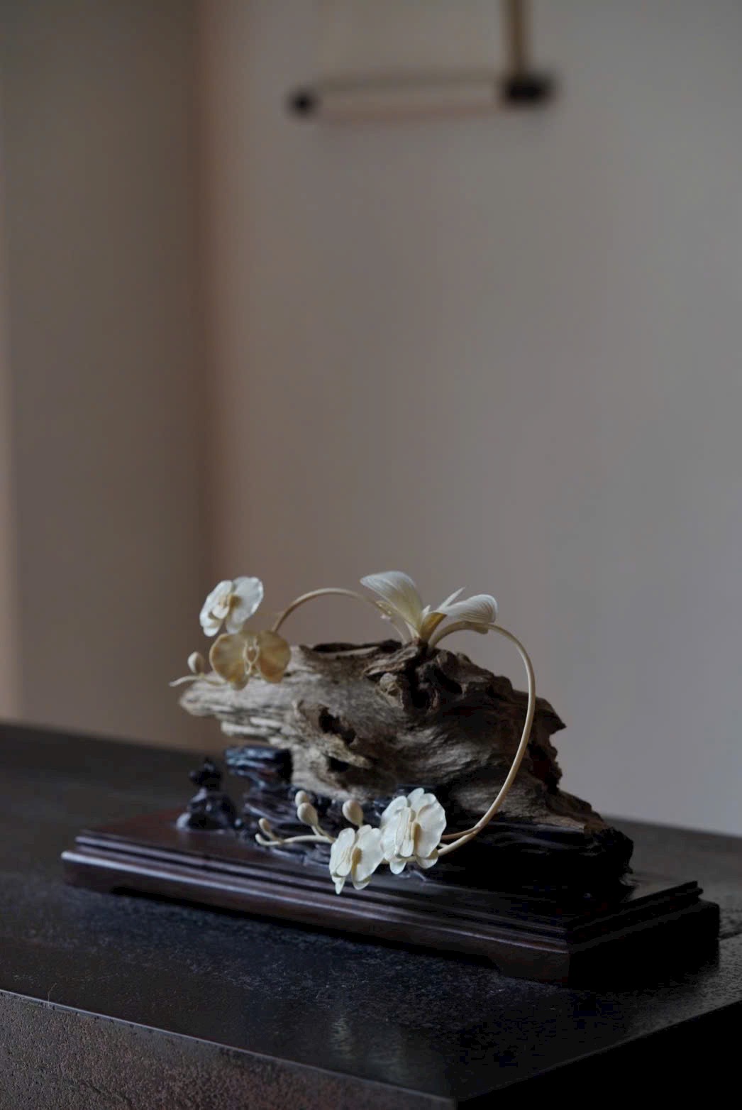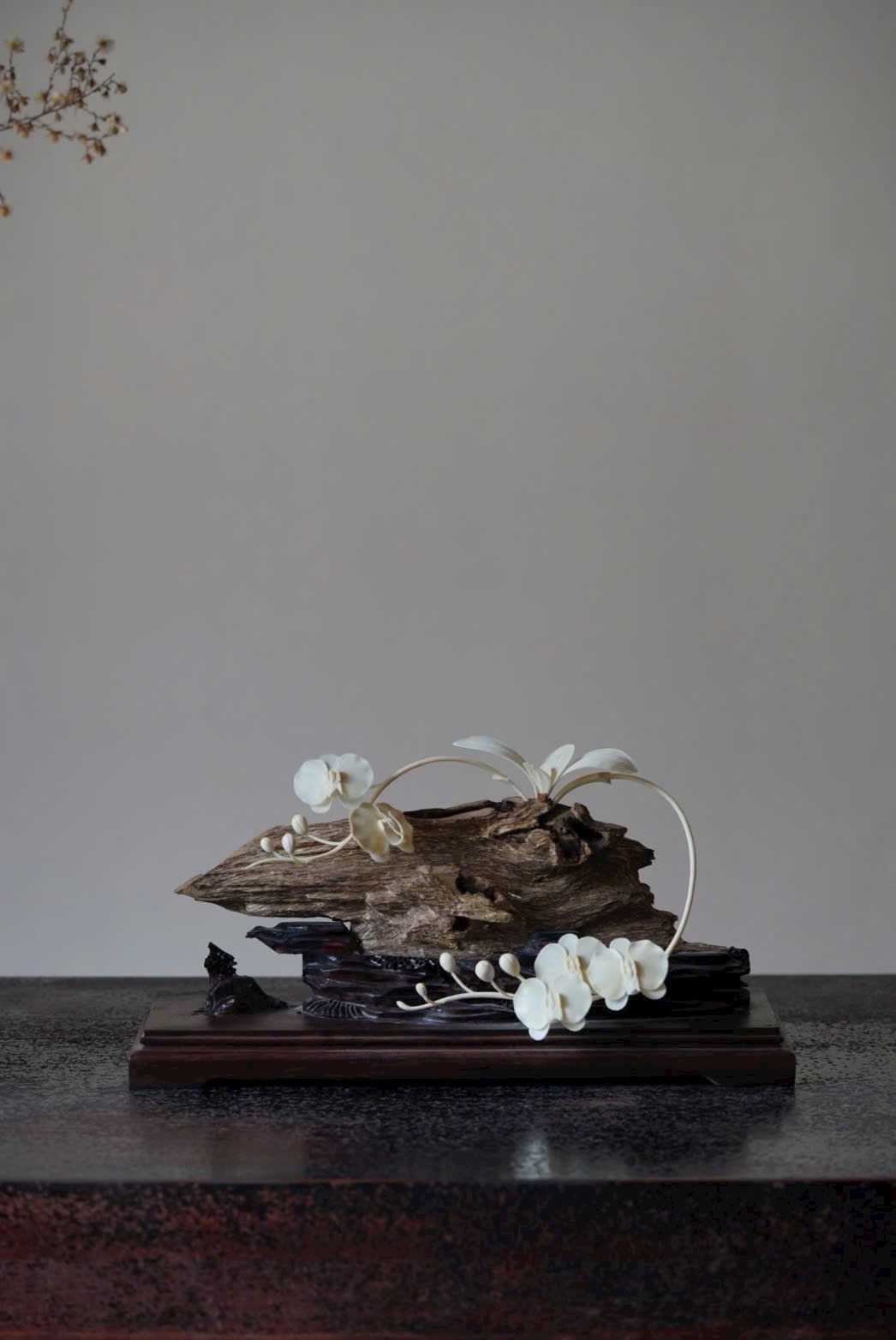 Phần đế trầm hương thơm nức, vân gỗ như dấu ấn thời gian, mộc mạc tự nhiên; lan hồ điệp chạm khắc từ ngà voi ma mút, cánh hoa trong mượt, khi vươn nở như ẩn chứa hương thơm nhẹ nhàng lan tỏa. Sự đan xen của khô – tươi, hòa quyện giữa cổ xưa và hiện đại, là món trang trí thanh nhã trên bàn, cũng là bức họa thi vị của cuộc đối thoại giữa thiên nhiên và văn hóa. Ngắm để tịnh tâm, thưởng để quên mọi bụi trần.