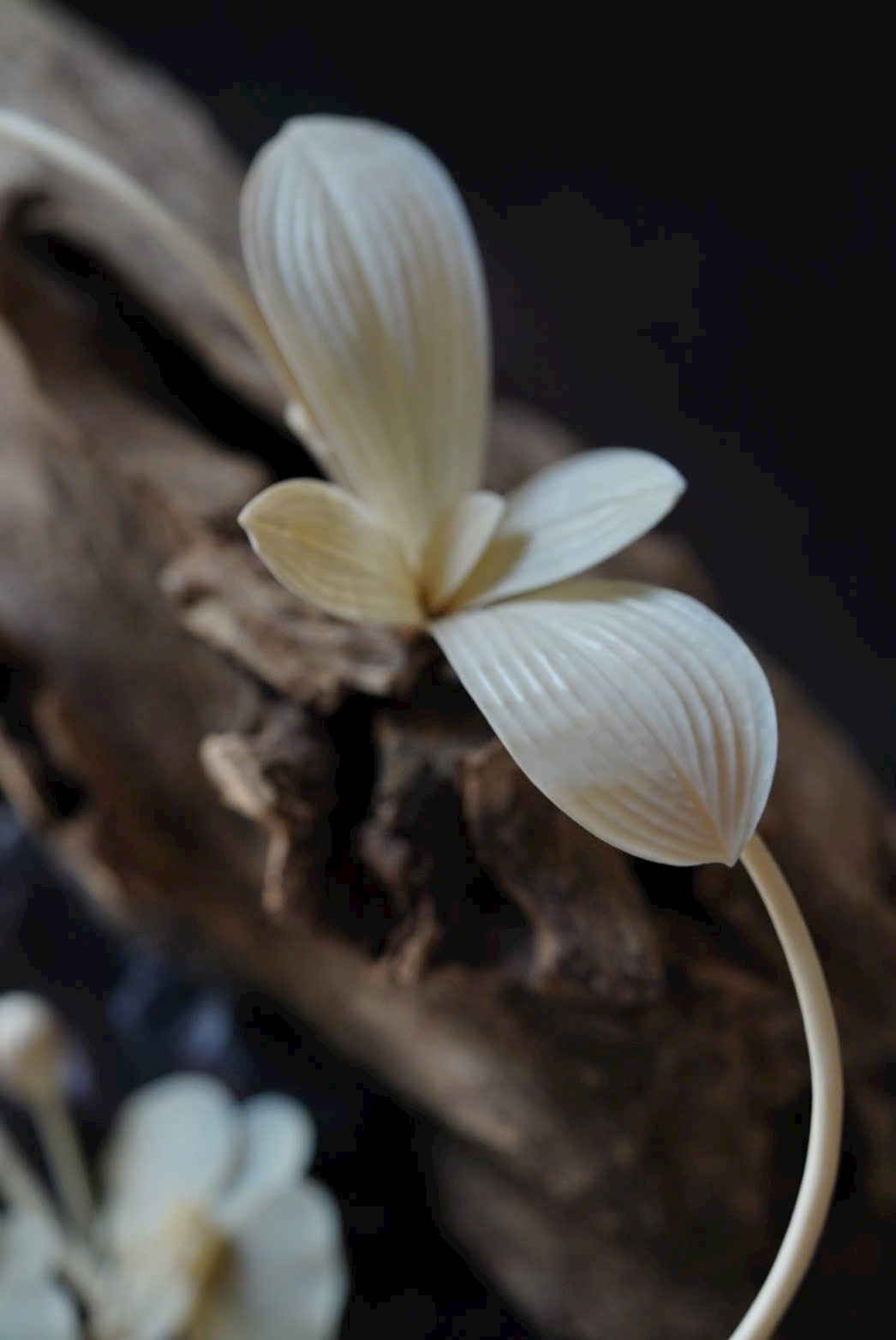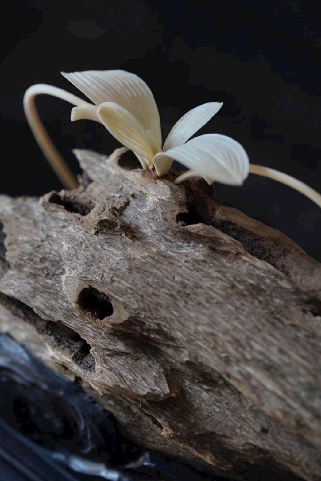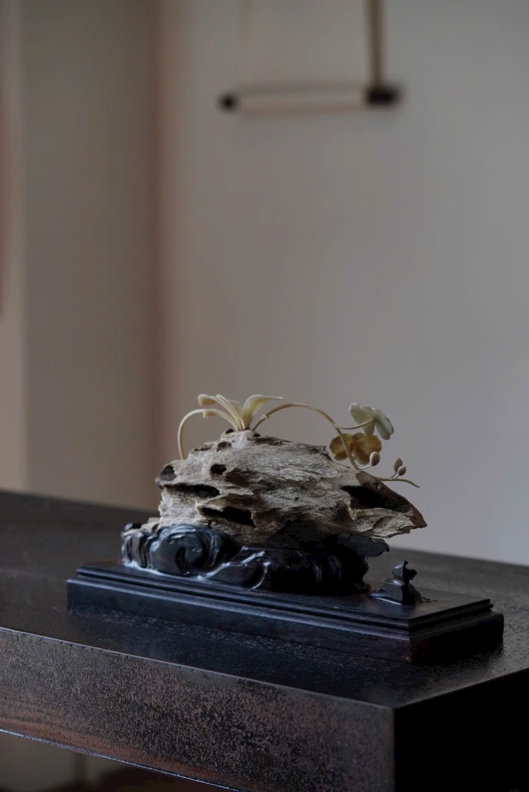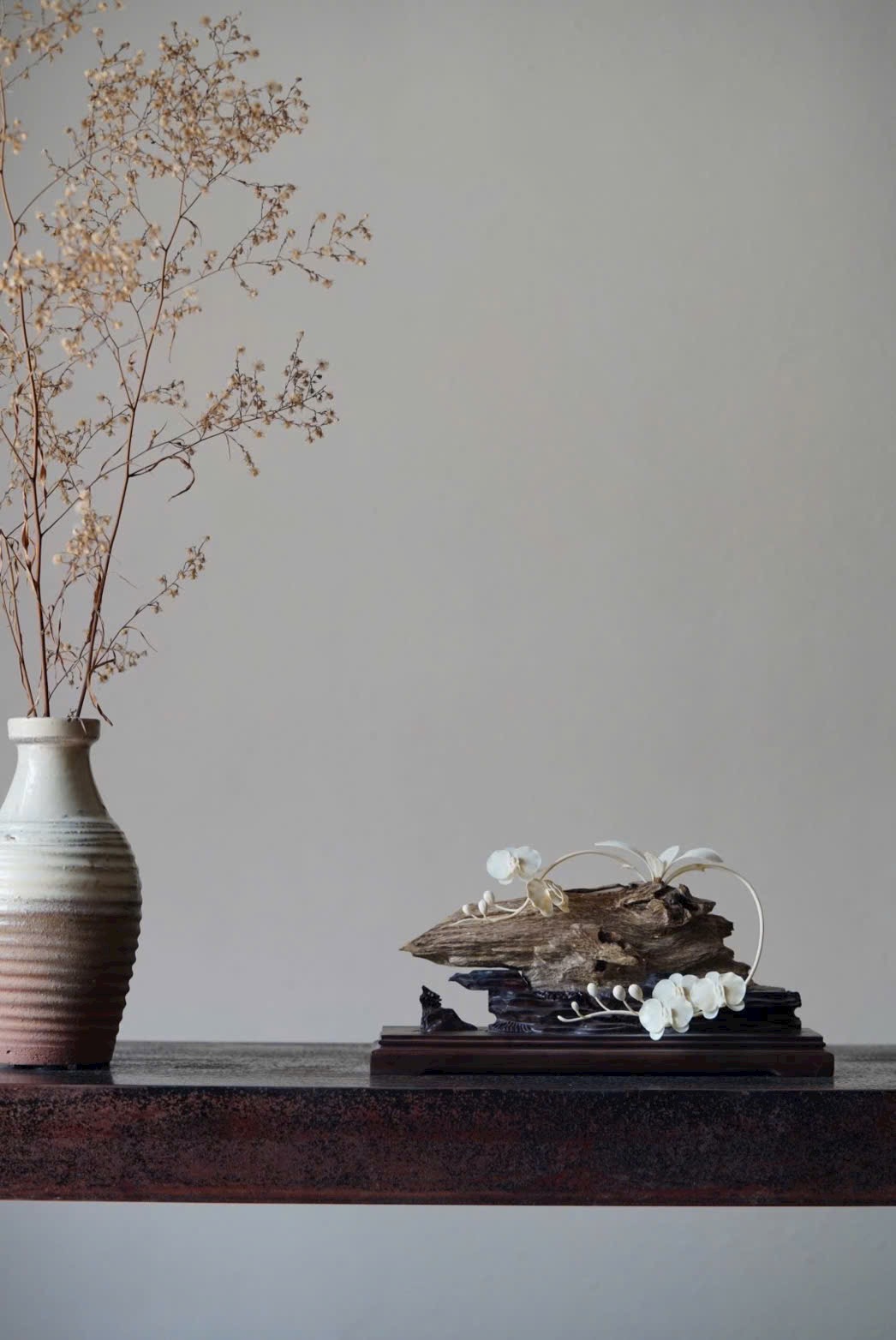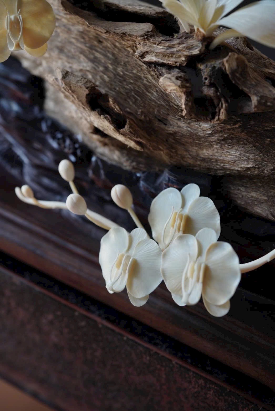 Phần đế trầm hương thơm nức, vân gỗ như dấu ấn thời gian, mộc mạc tự nhiên; lan hồ điệp chạm khắc từ ngà voi ma mút, cánh hoa trong mượt, khi vươn nở như ẩn chứa hương thơm nhẹ nhàng lan tỏa. Sự đan xen của khô – tươi, hòa quyện giữa cổ xưa và hiện đại, là món trang trí thanh nhã trên bàn, cũng là bức họa thi vị của cuộc đối thoại giữa thiên nhiên và văn hóa. Ngắm để tịnh tâm, thưởng để quên mọi bụi trần.