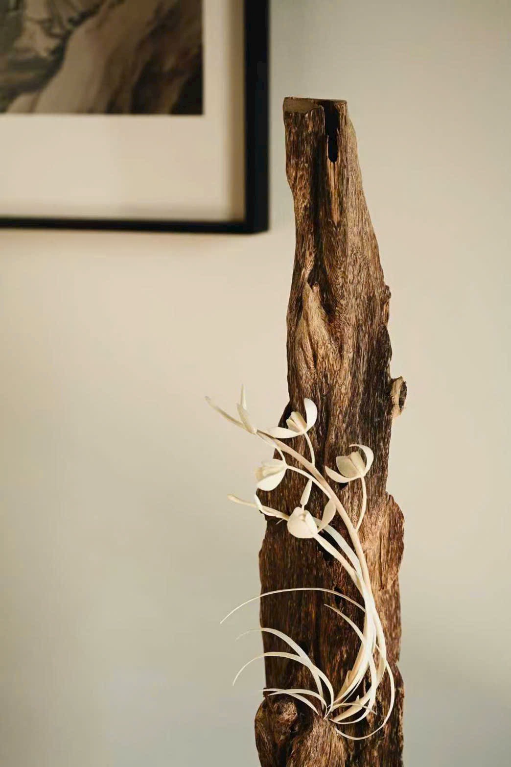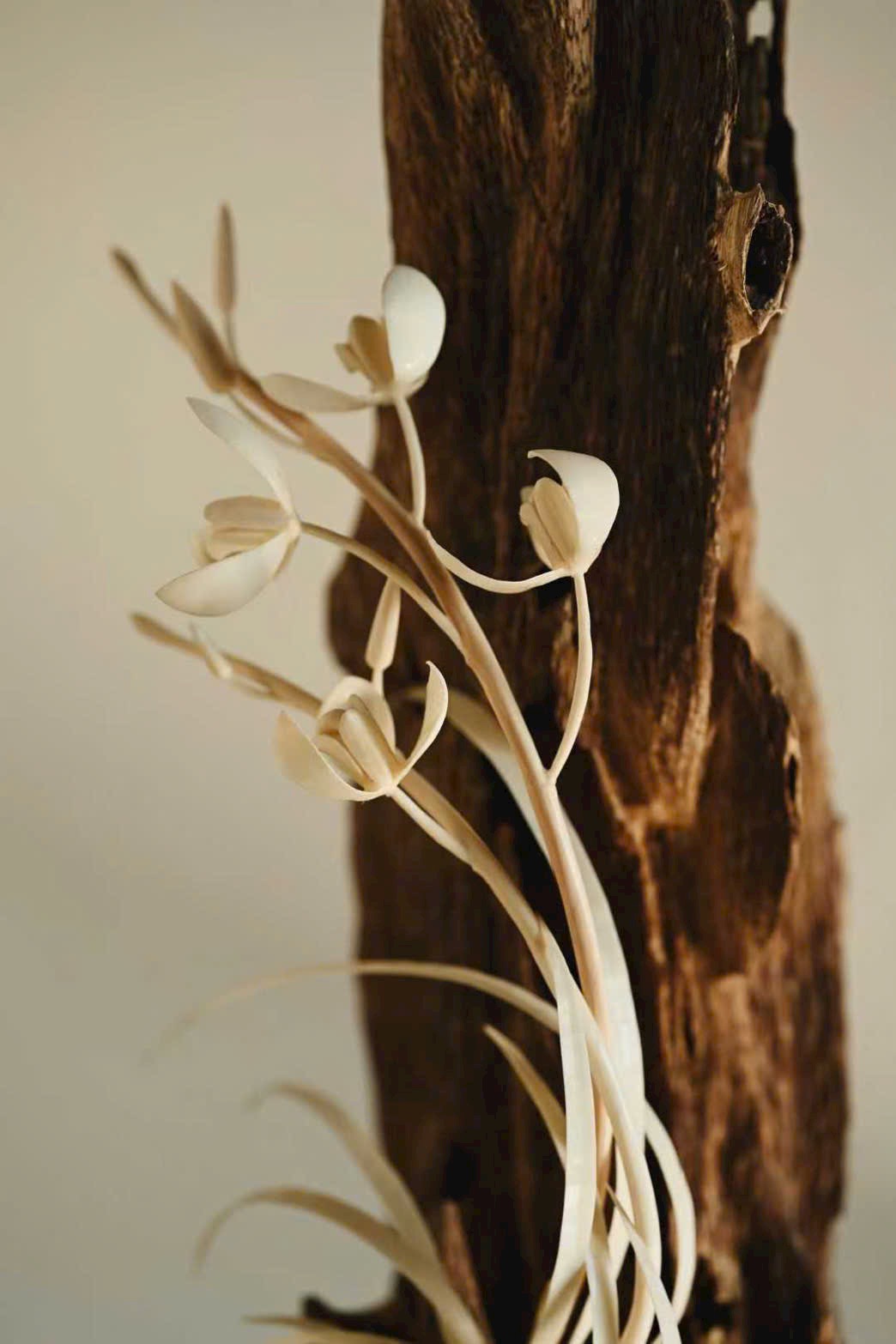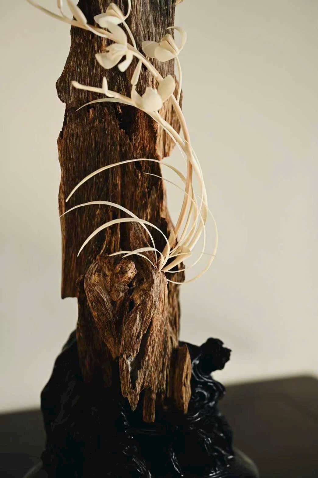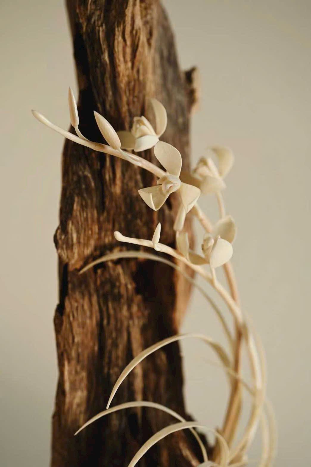 Lấy đao khắc làm bút vẽ để phác họa dáng lan thanh nhã, không cần sắc hoa rực rỡ mà vẫn bộc lộ trọn vẹn vẻ linh động và tinh khiết của lan. Cánh hoa cong xoắn tựa như có làn gió nhẹ lướt qua, khẽ rung đầy uyển chuyển. Đặt tĩnh tại trên án bàn, tác phẩm như giấu trong mình chất thơ vĩnh hằng của núi rừng, mang lại cảm giác tĩnh lặng, tao nhã và sâu lắng cho không gian.