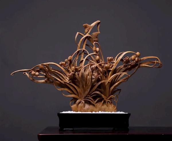 Bằng tay nghề tinh xảo khắc họa hình thái lan cỏ: lá mềm mại vươn dài, nụ hoa chờ nở, cánh bướm dừng đậu giữa chốn hương trầm, như đang kể về sức sống tự nhiên và ý vị tĩnh nhã. Vẻ đẹp thảo mộc kết tinh trong tác phẩm điêu khắc gỗ, toát lên phong vận thẩm mỹ phương Đông.