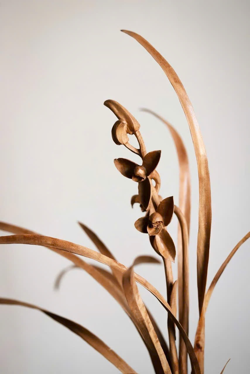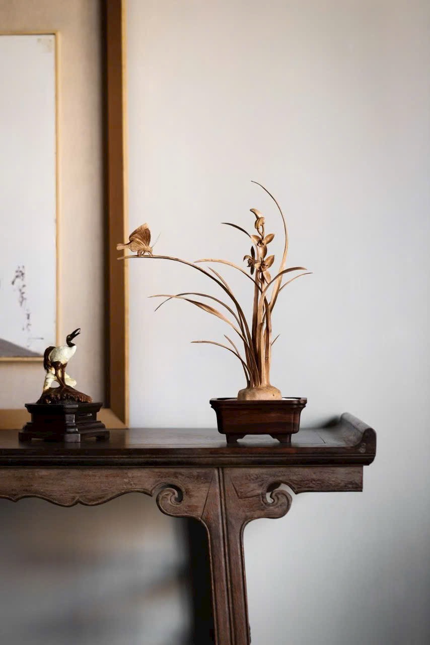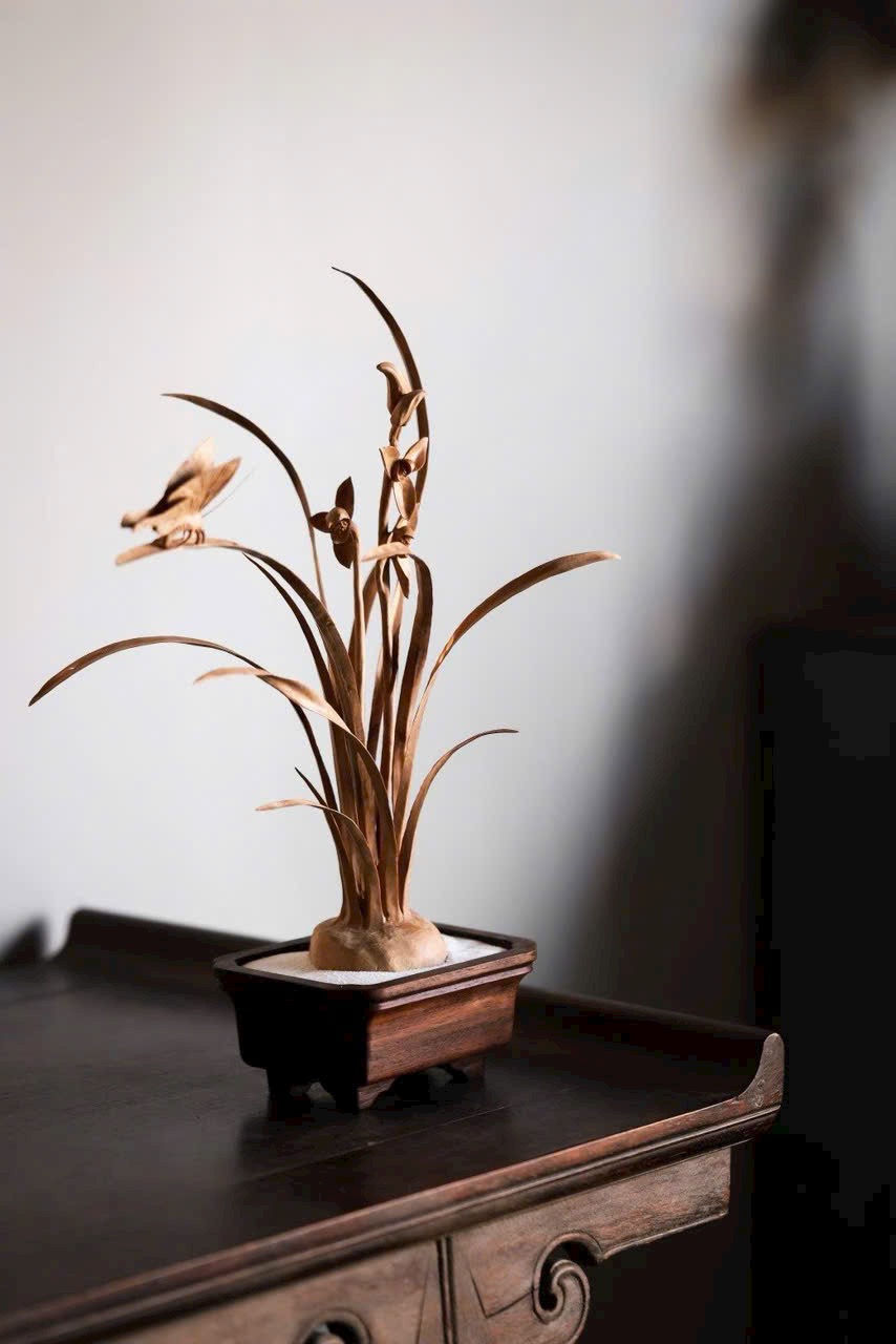 Gỗ trầm hương sắc mật ong, theo dáng tự nhiên mà chạm khắc ra nhành lan nở hương. Một cánh bướm ngọc đậu giữa nhị hoa, đôi cánh mỏng nhẹ như sợi tơ ve. Đặt trên án thư, hương thơm thoảng qua, như thấy sắc xuân nơi vườn Nam khẽ bước vào phòng.