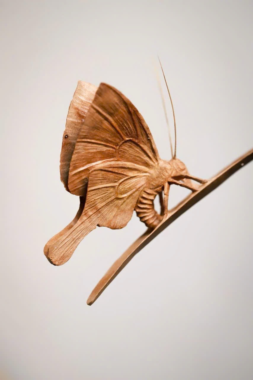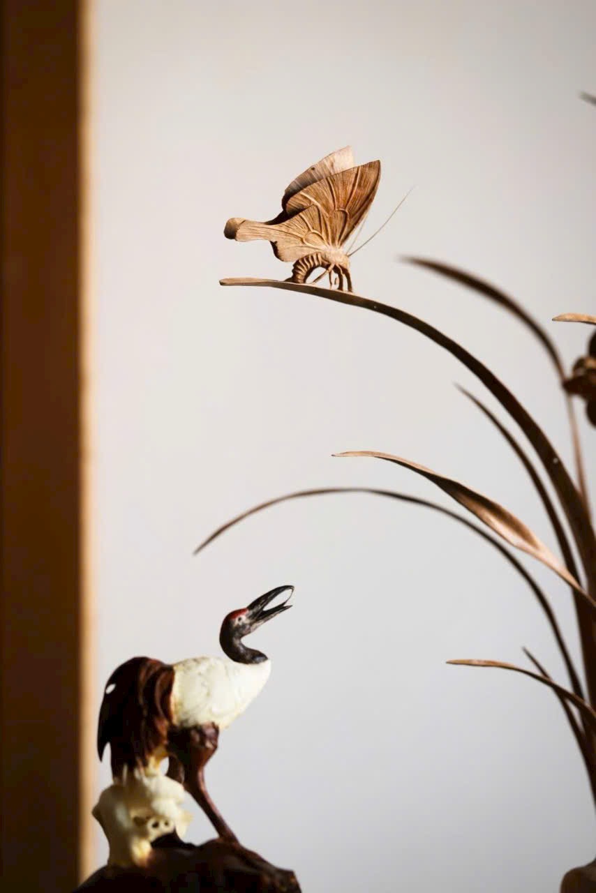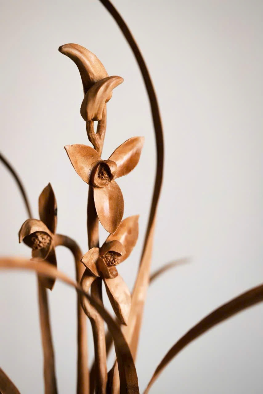 Gỗ trầm hương sắc mật ong, theo dáng tự nhiên mà chạm khắc ra nhành lan nở hương. Một cánh bướm ngọc đậu giữa nhị hoa, đôi cánh mỏng nhẹ như sợi tơ ve. Đặt trên án thư, hương thơm thoảng qua, như thấy sắc xuân nơi vườn Nam khẽ bước vào phòng.