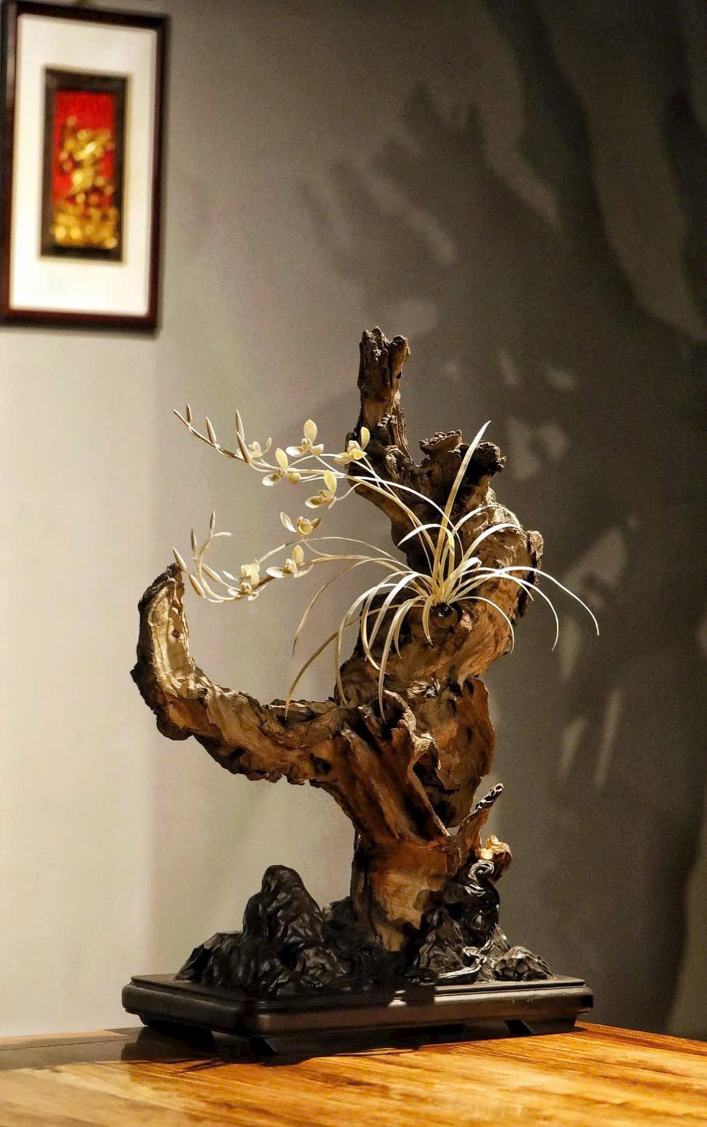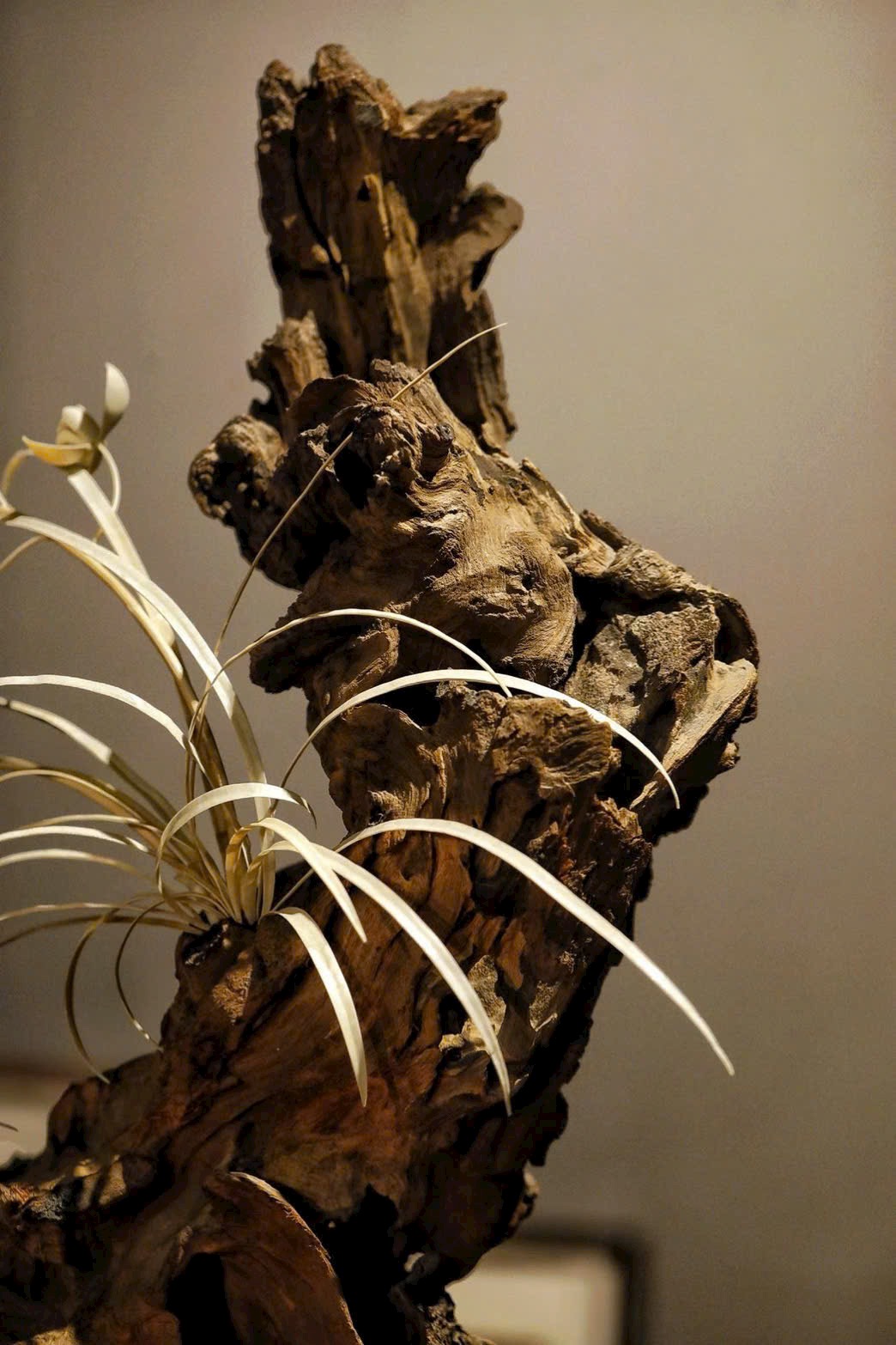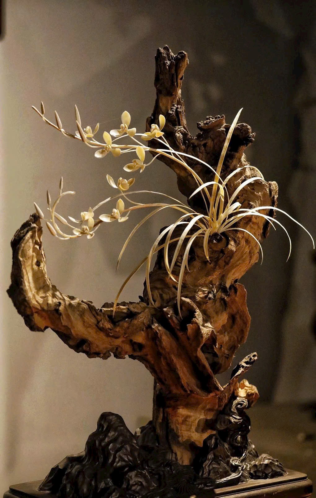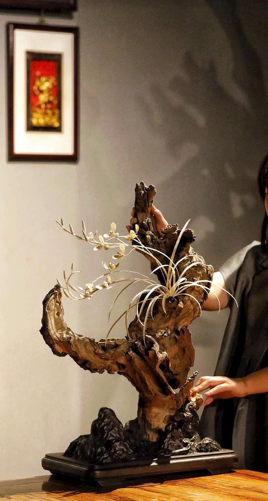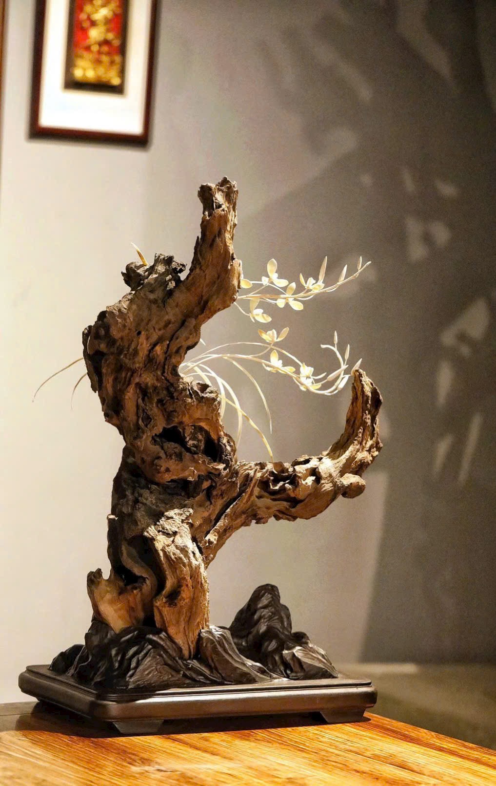 Ng.à ma mút tinh chạm nhành lan, cánh hoa nhẹ nhàng nở xoè, lá lan thon dài sinh động, gắn trên khúc gỗ khô tự nhiên, tựa như u lan trong khe núi phá đá mà vươn lên, trong sự đối lập khô tàn và sinh trưởng, toát lên sức sống mạnh mẽ.