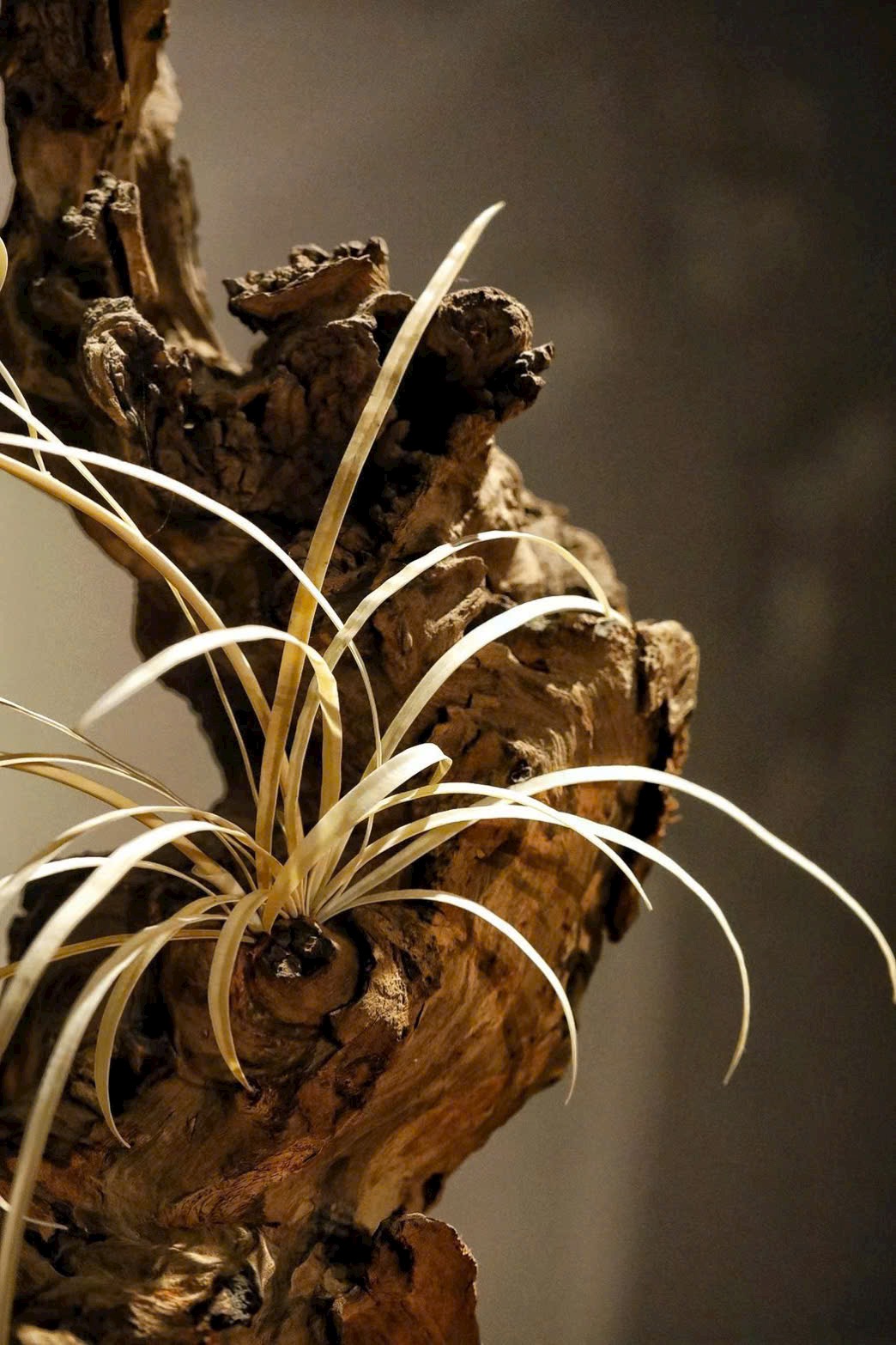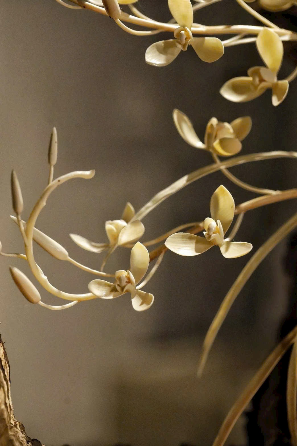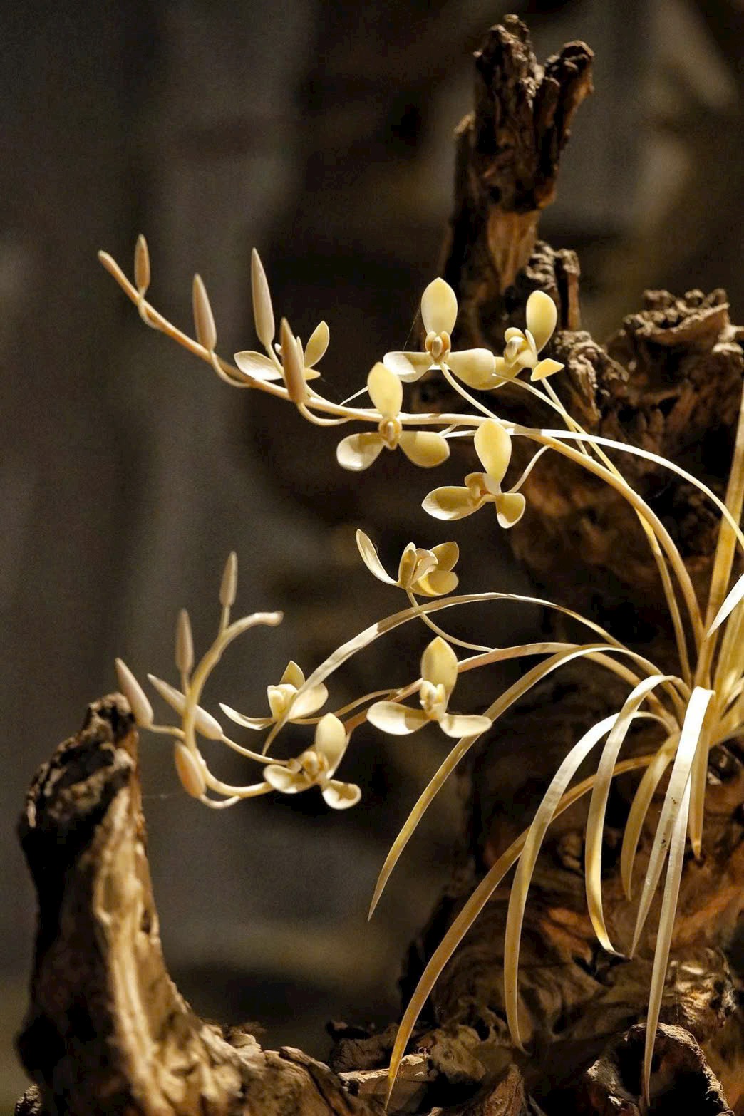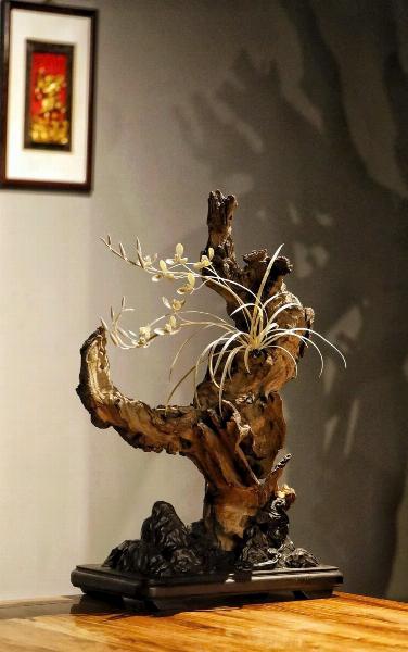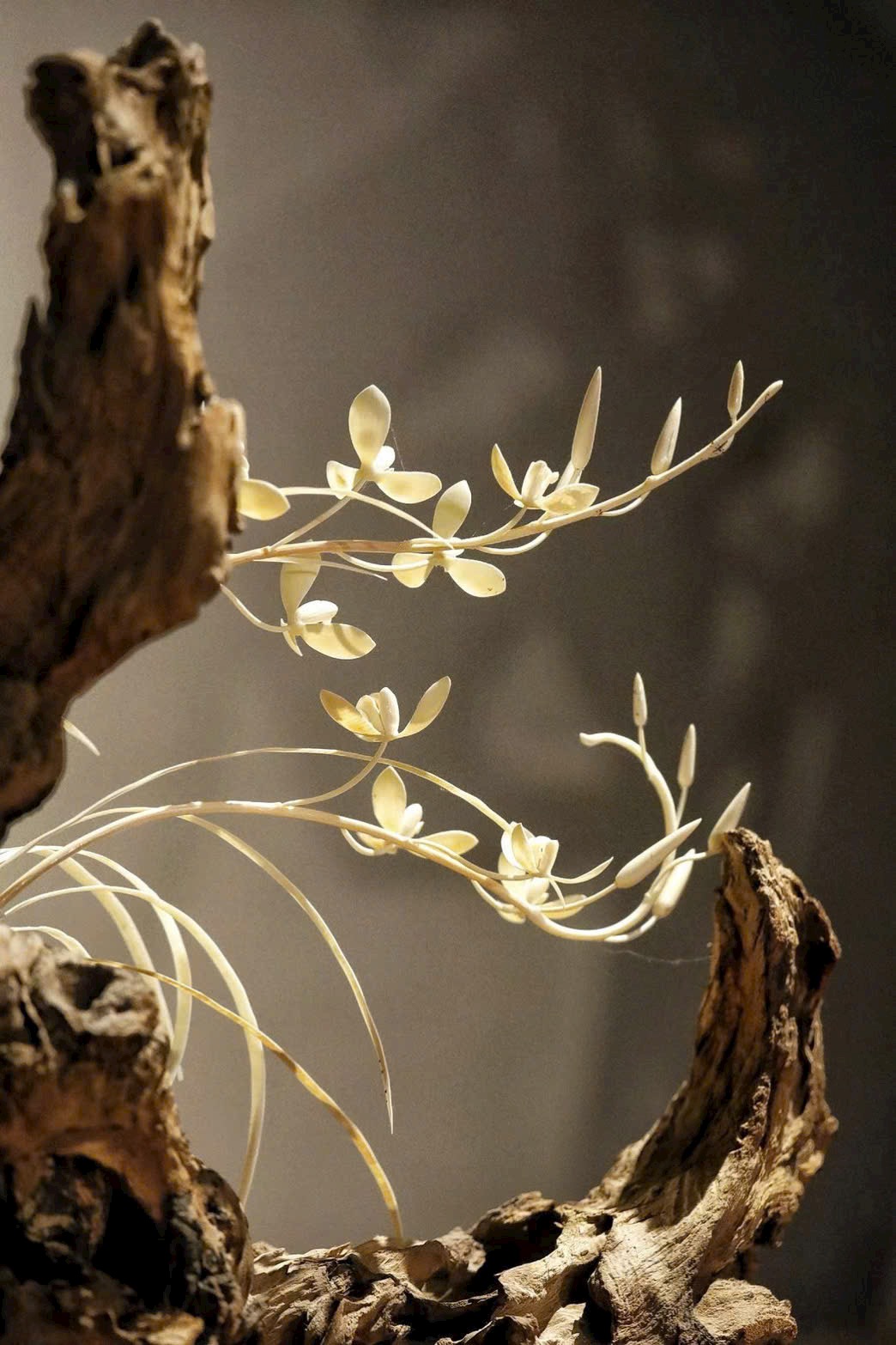 Ng.à ma mút tinh chạm nhành lan, cánh hoa nhẹ nhàng nở xoè, lá lan thon dài sinh động, gắn trên khúc gỗ khô tự nhiên, tựa như u lan trong khe núi phá đá mà vươn lên, trong sự đối lập khô tàn và sinh trưởng, toát lên sức sống mạnh mẽ.