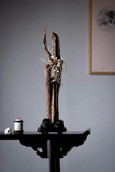 Gỗ trầm ngưng hương thấm hồn, ngà khắc lan thảo vươn sinh qua đá. Cánh hoa cuộn mở vương dấu sương, gân lá mảnh mai ánh trăng soi tỏ. Một gỗ, một ngà, một vật cúng thanh tịnh — hương ngát khẽ lan khắp gian phòng tĩnh lặng.