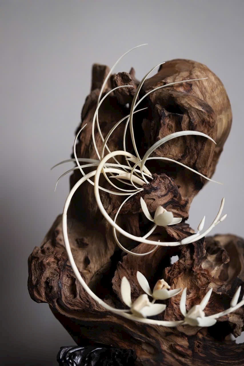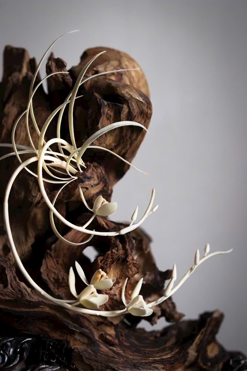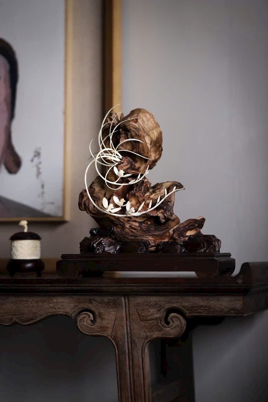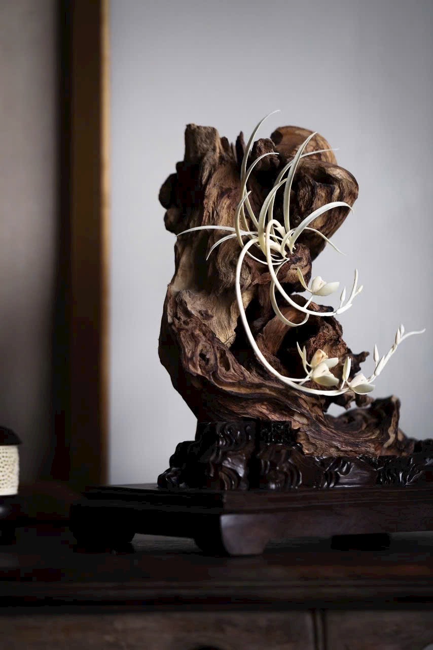 Trầm hương thanh khiết lan xa, ngà voi ma mút mịn màng sáng bóng. Lá lan uốn lượn tự nhiên, cánh hoa tinh xảo như đọng sương. Một nhành lan kín đáo tỏa hương, như có làn gió nhẹ thoảng qua. Trưng bày nơi bàn làm việc, không gian ngập tràn hương thơm tao nhã của bậc quân tử.