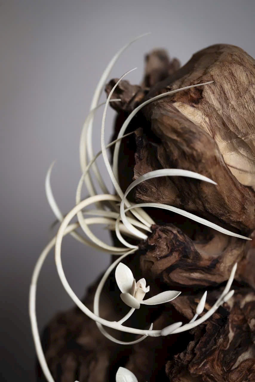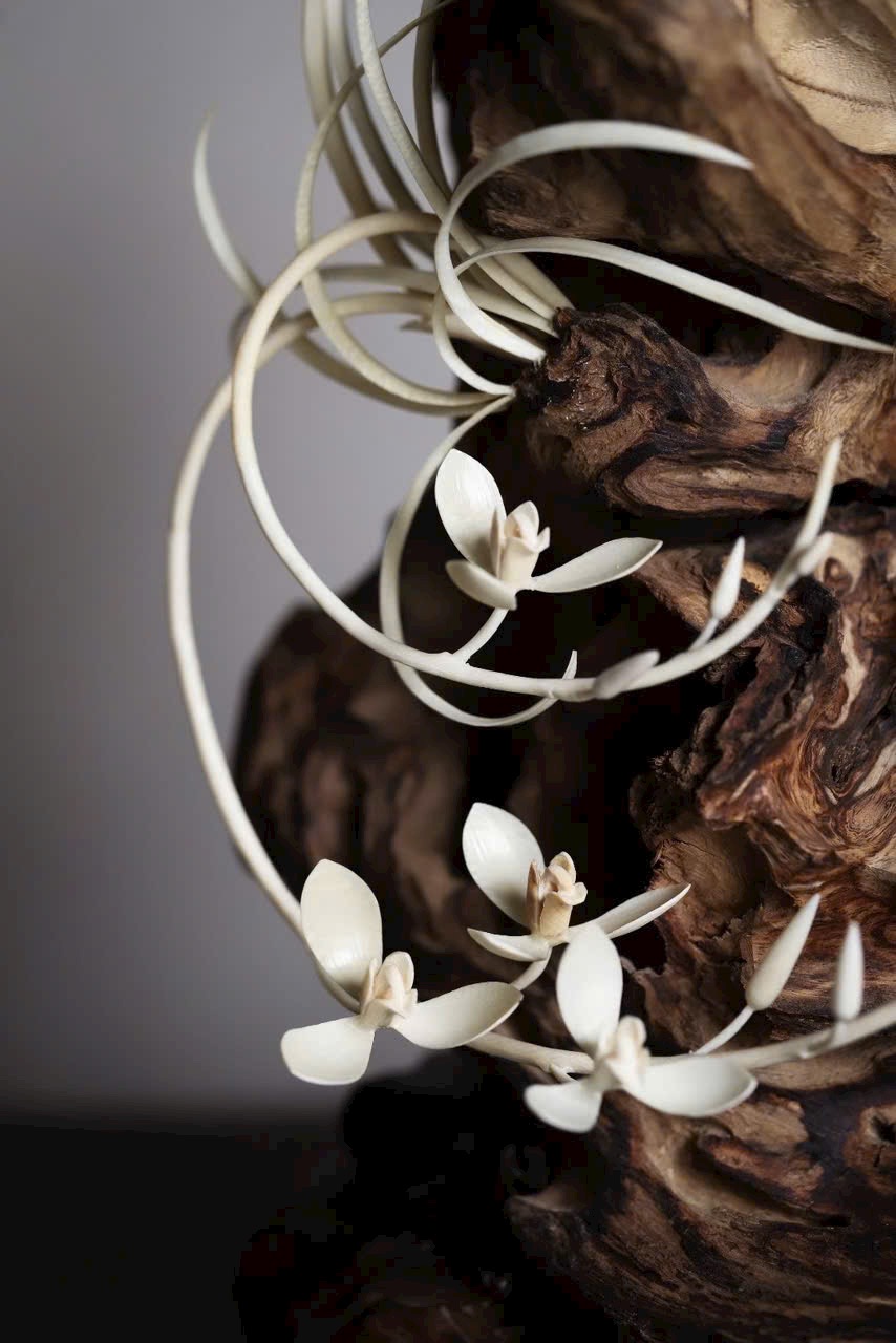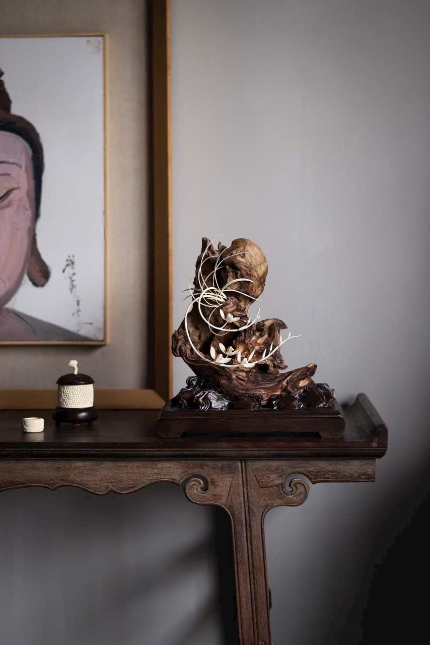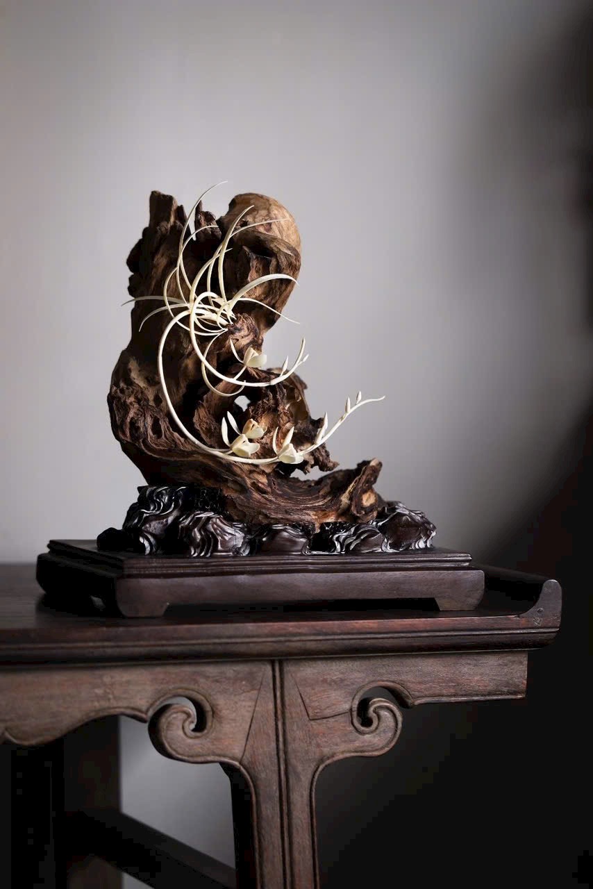 Trầm hương thanh khiết lan xa, ngà voi ma mút mịn màng sáng bóng. Lá lan uốn lượn tự nhiên, cánh hoa tinh xảo như đọng sương. Một nhành lan kín đáo tỏa hương, như có làn gió nhẹ thoảng qua. Trưng bày nơi bàn làm việc, không gian ngập tràn hương thơm tao nhã của bậc quân tử.