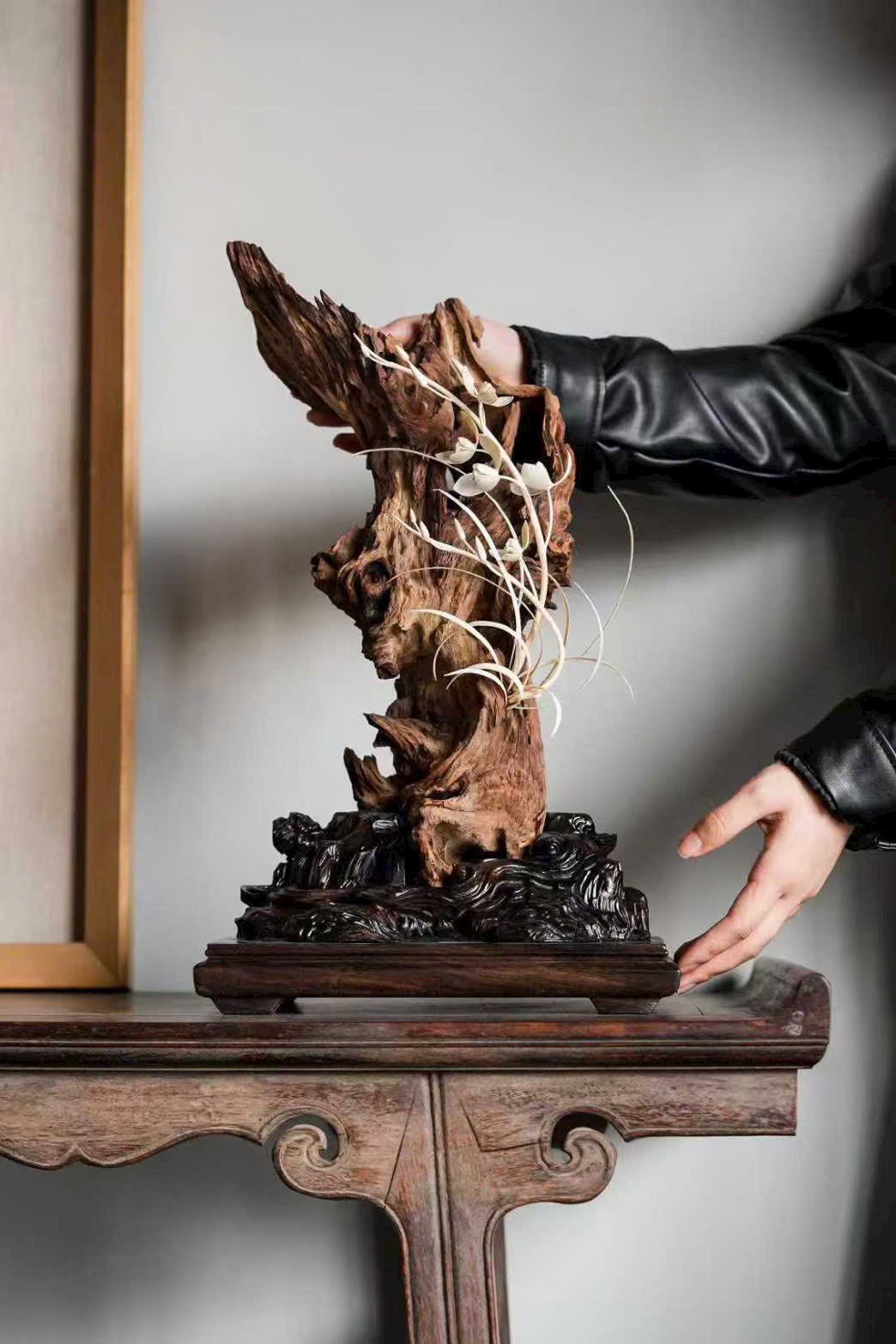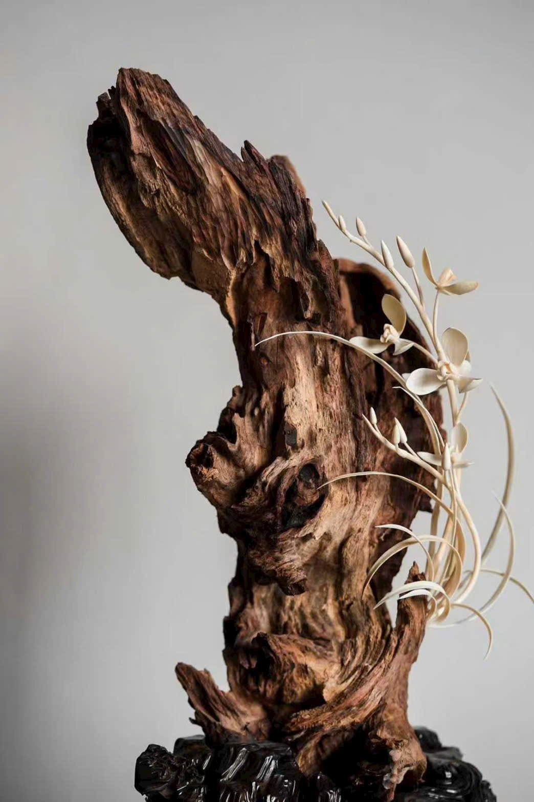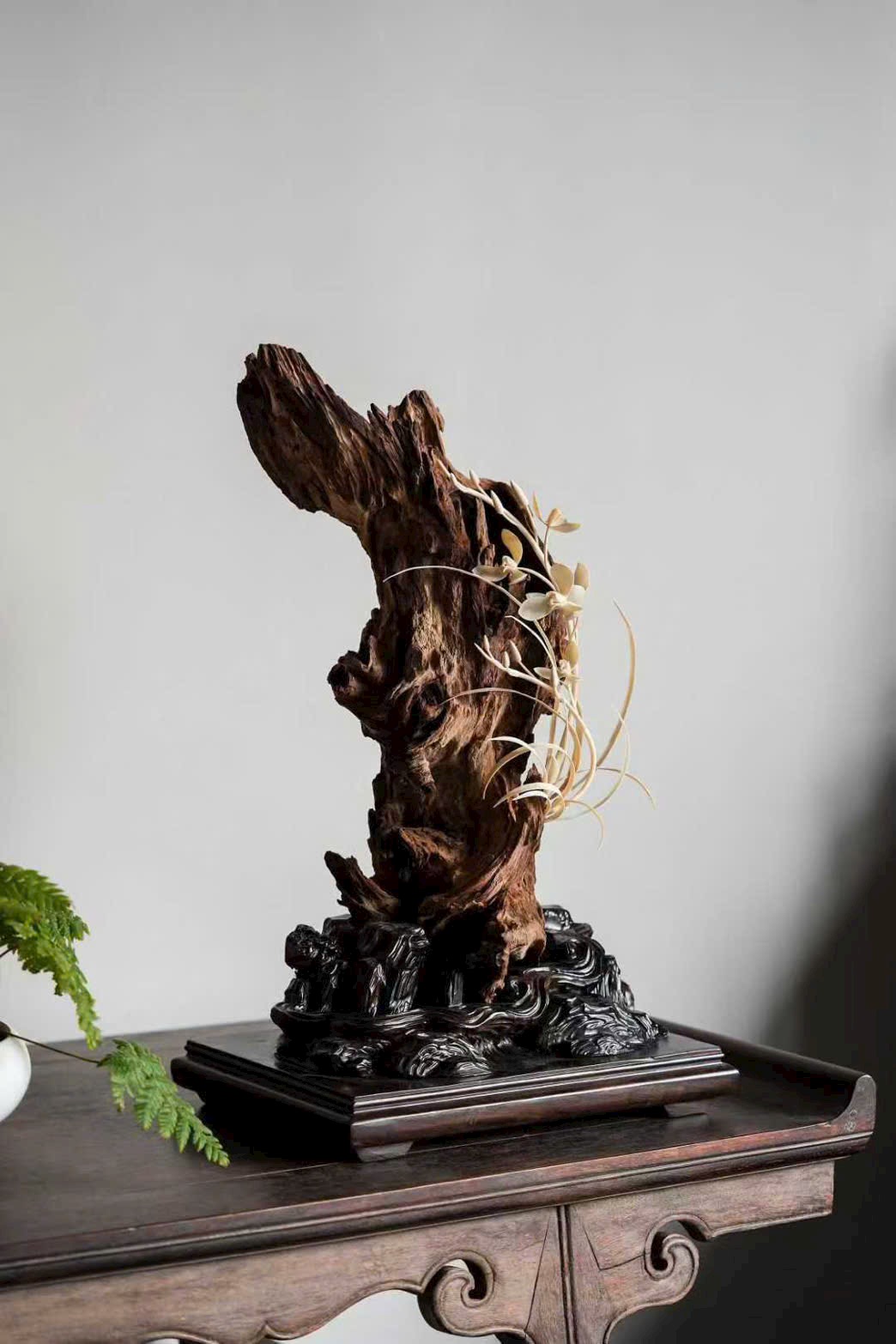 Thớ gỗ hương đen sẫm như mực, hằn dấu nghìn năm; đóa lan được chạm khắc như vươn ra từ khe đá. Cánh hoa tầng tầng trong sáng, rễ lan quấn quanh thân gỗ giáng chân, tựa như thiên tạo. Đặt trên trà tịch, khi hương nhẹ lan tỏa, có thể cảm được phong vị “thanh cung” của giới tao nhân cổ.