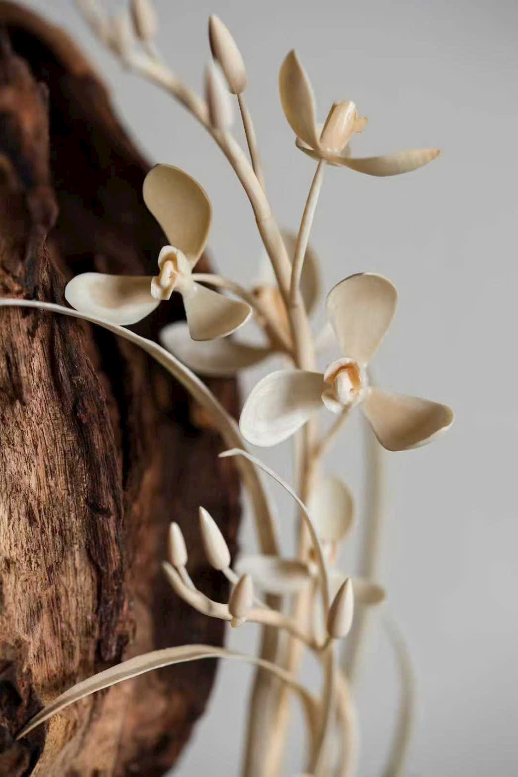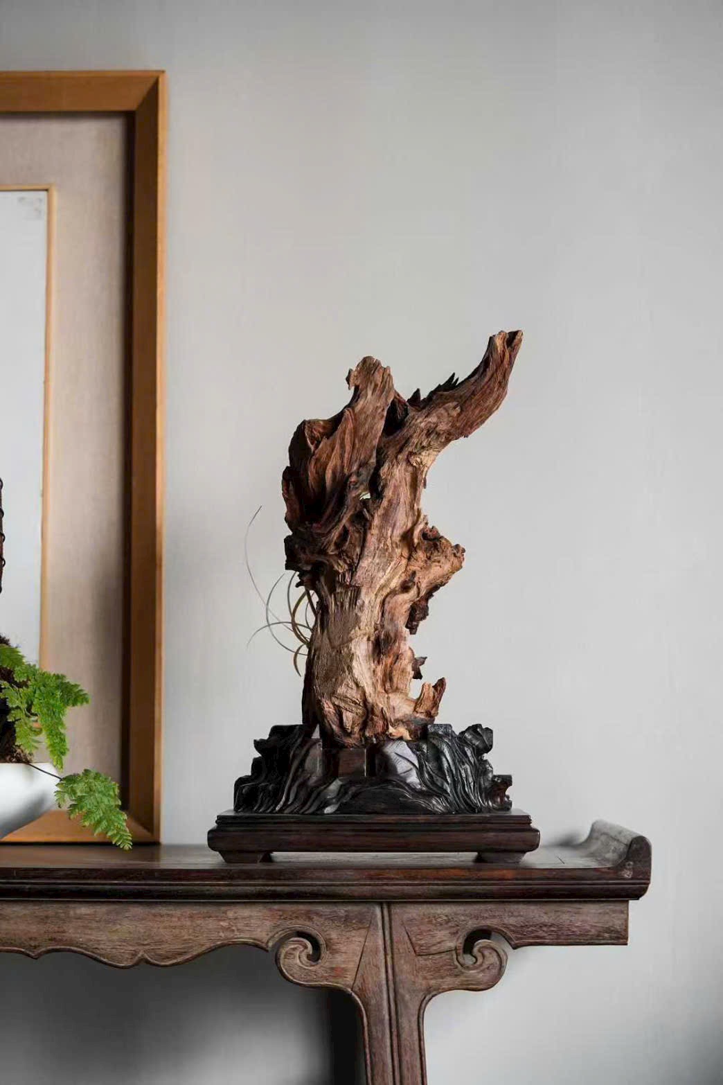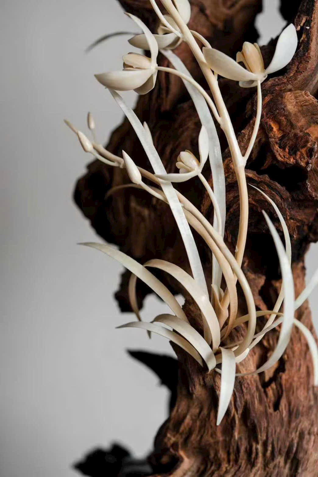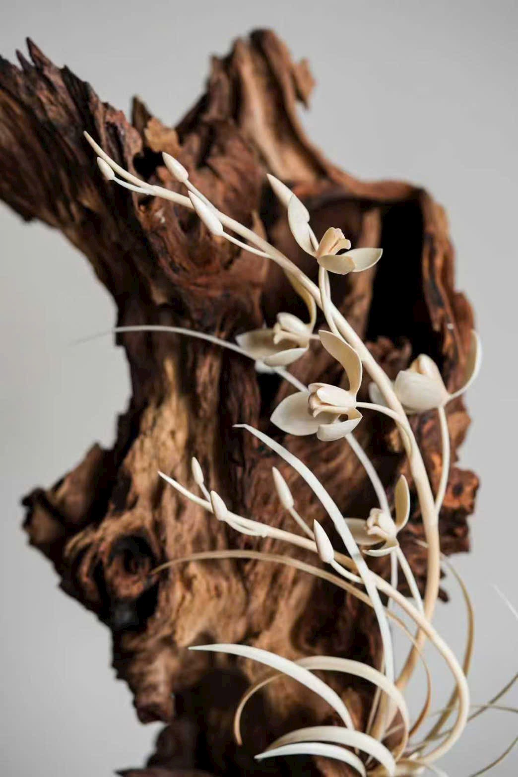 Thớ gỗ hương đen sẫm như mực, hằn dấu nghìn năm; đóa lan được chạm khắc như vươn ra từ khe đá. Cánh hoa tầng tầng trong sáng, rễ lan quấn quanh thân gỗ giáng chân, tựa như thiên tạo. Đặt trên trà tịch, khi hương nhẹ lan tỏa, có thể cảm được phong vị “thanh cung” của giới tao nhân cổ.