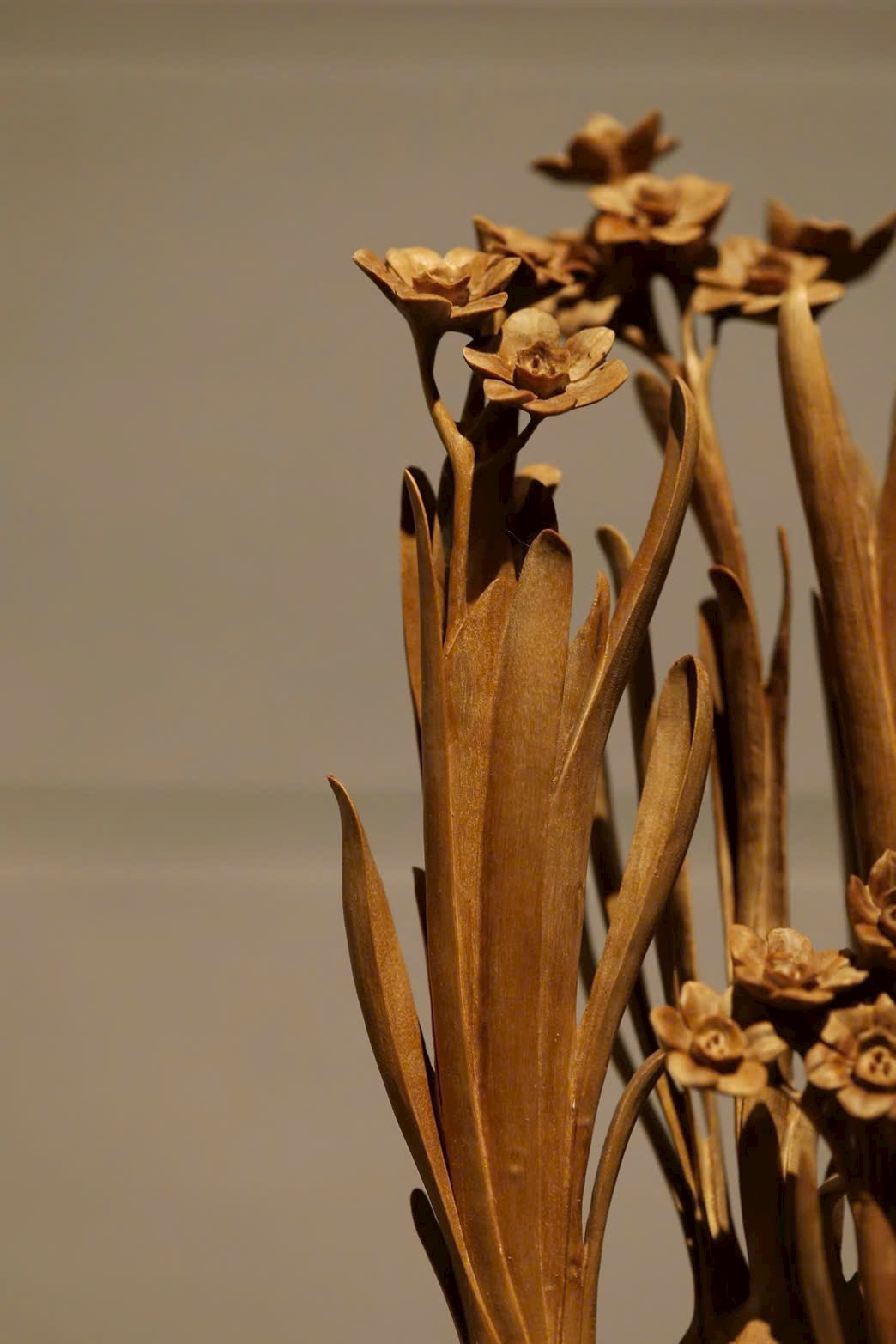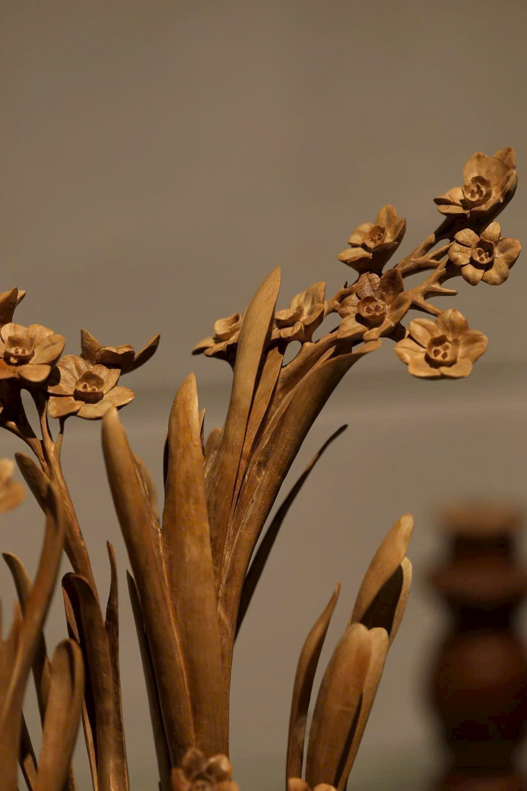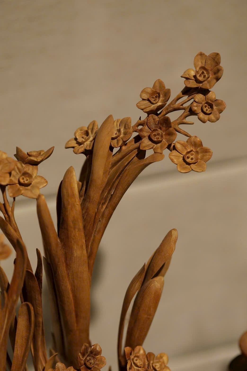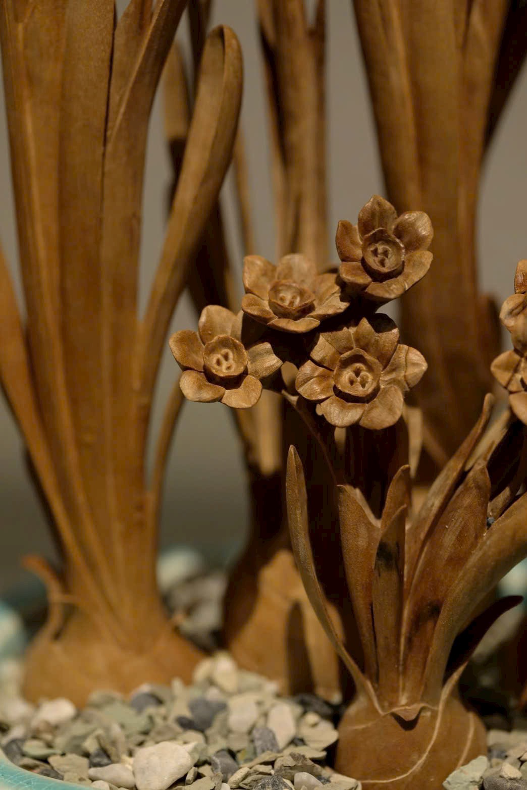 Chất gỗ bóng mượt, mịn màng, đường dao phóng khoáng tự nhiên. Hoa lá vươn nở thanh thoát, sinh động mà tao nhã, hài hòa giữa tĩnh và động, tràn đầy sinh khí. Khi gió nhẹ lướt qua, hương trầm thoảng bay dìu dịu. Bày nơi án thư, hương sắc tĩnh lặng mà sinh hương, bốn mùa khoe sắc không tàn. Tự nhiên mà tinh diệu, cành nhánh, cánh hoa, chỗ dày chỗ thưa, bố cục hài hòa như trời đất tạo nên.