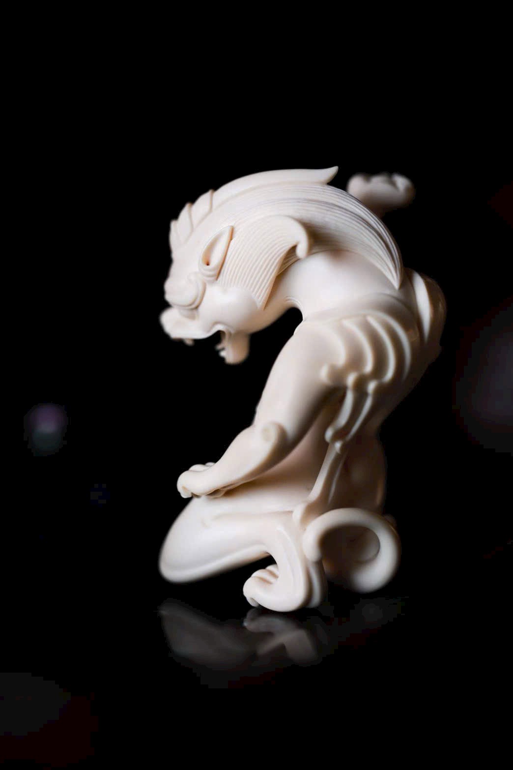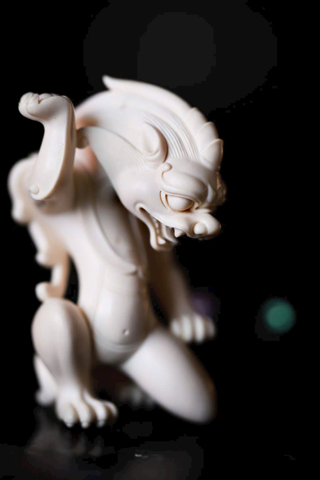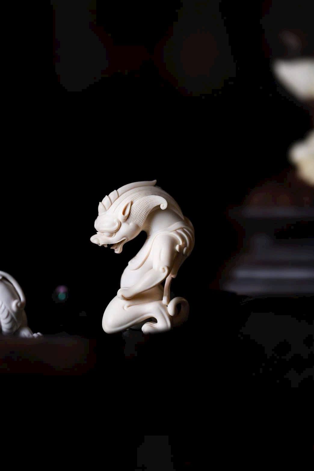Phỏng tác theo hình tượng Li long bằng đồng thời Hán, ngà mịn như mỡ ngọc thấm ánh trăng, tư thế trấn giữ uy nghi. Đầu rồng vươn cao hút mây khí tứ phương, đuôi cuộn gom tài tinh cửu tiêu. Bày nơi án thư giúp chiêu tài tụ bảo, mang lại khí tượng cát tường cho không gian.