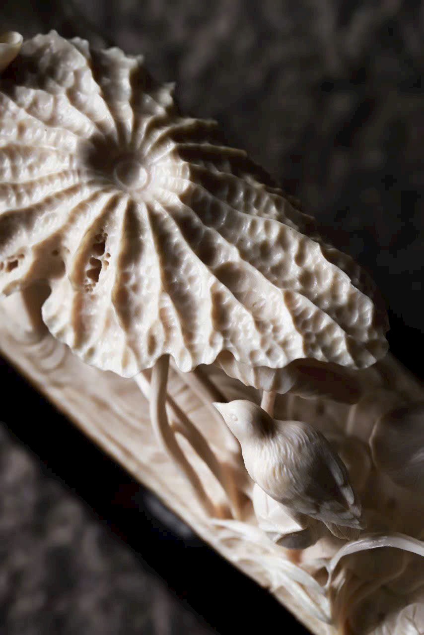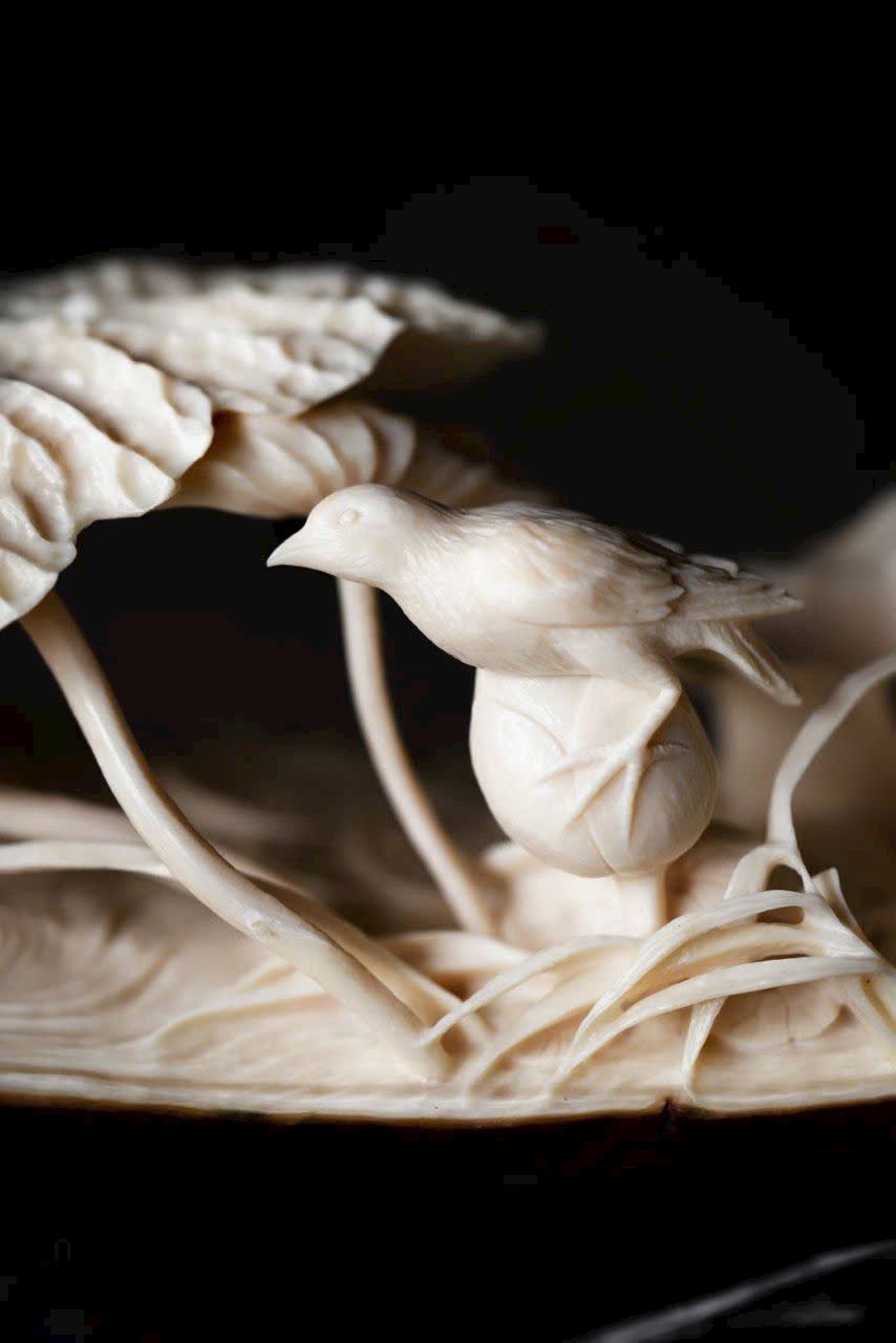 Chim linh cúi đầu chăm sóc lông, các cánh hoa sen uốn cong tự nhiên, tạo dáng sinh động như thật.