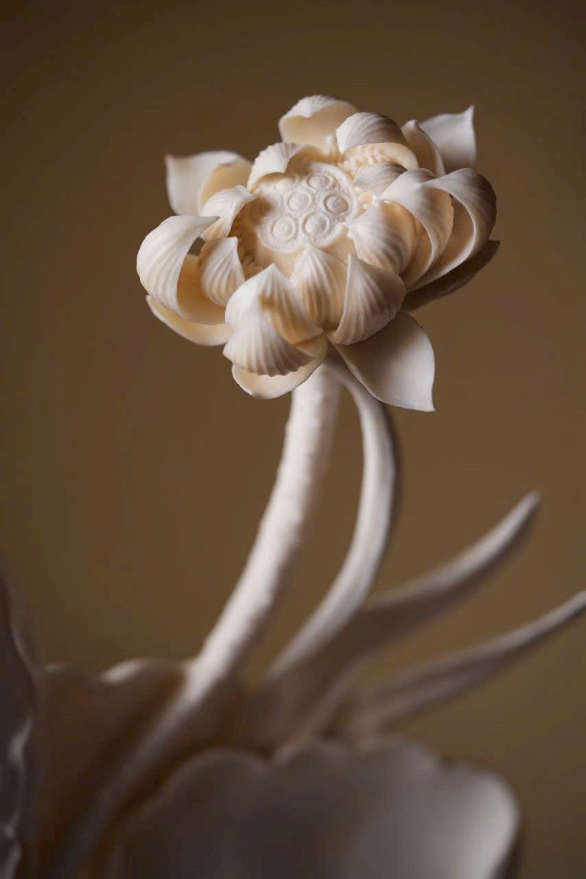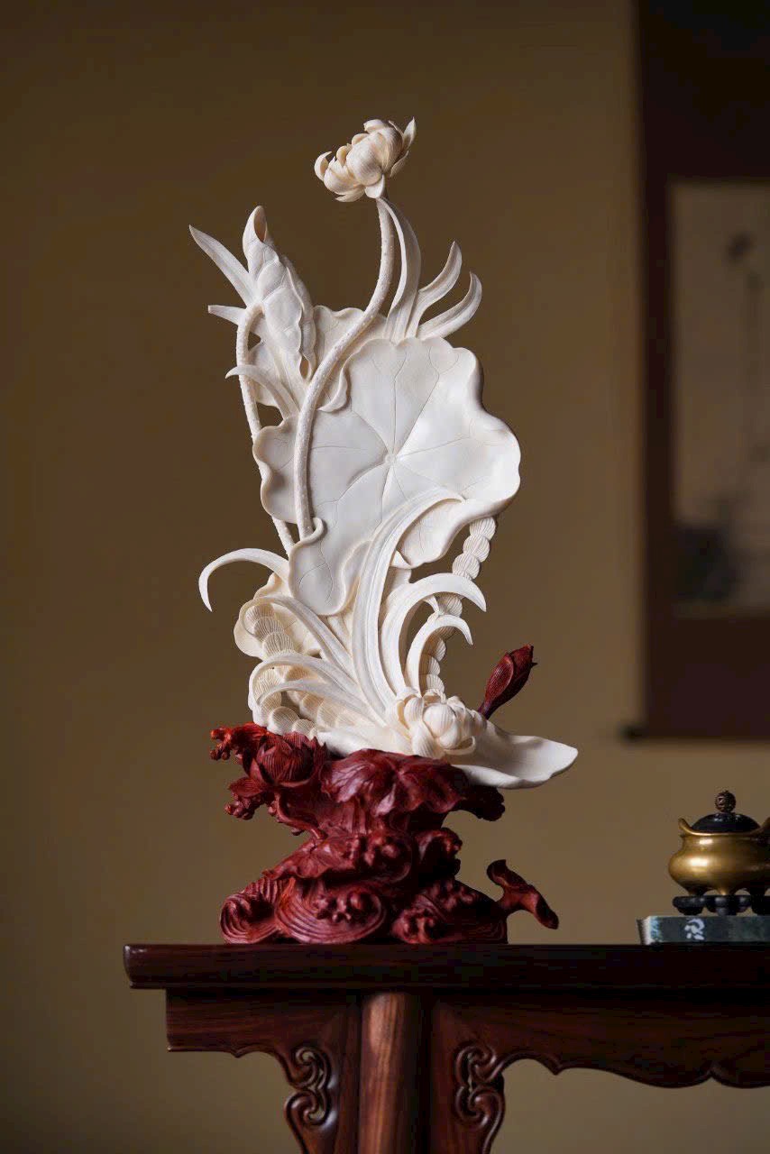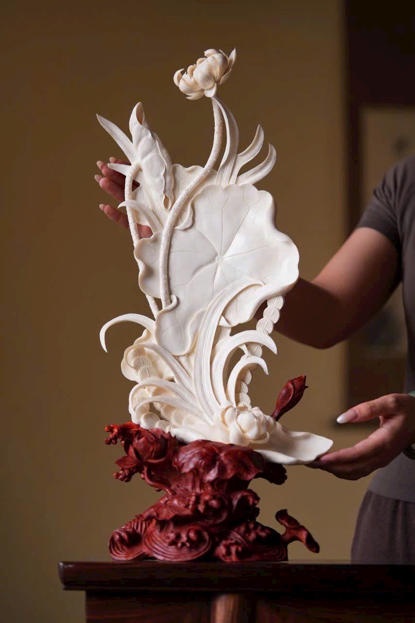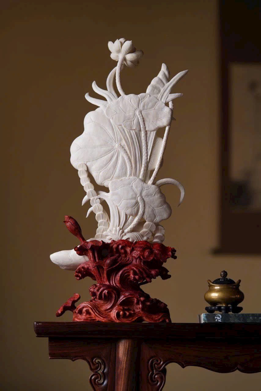 Chất sừng hươu mịn màng, chạm khắc khéo léo lá sen cuộn mở. Cánh hoa tầng tầng đón gió sương, gân cuống uốn lượn ẩn ý thiền.