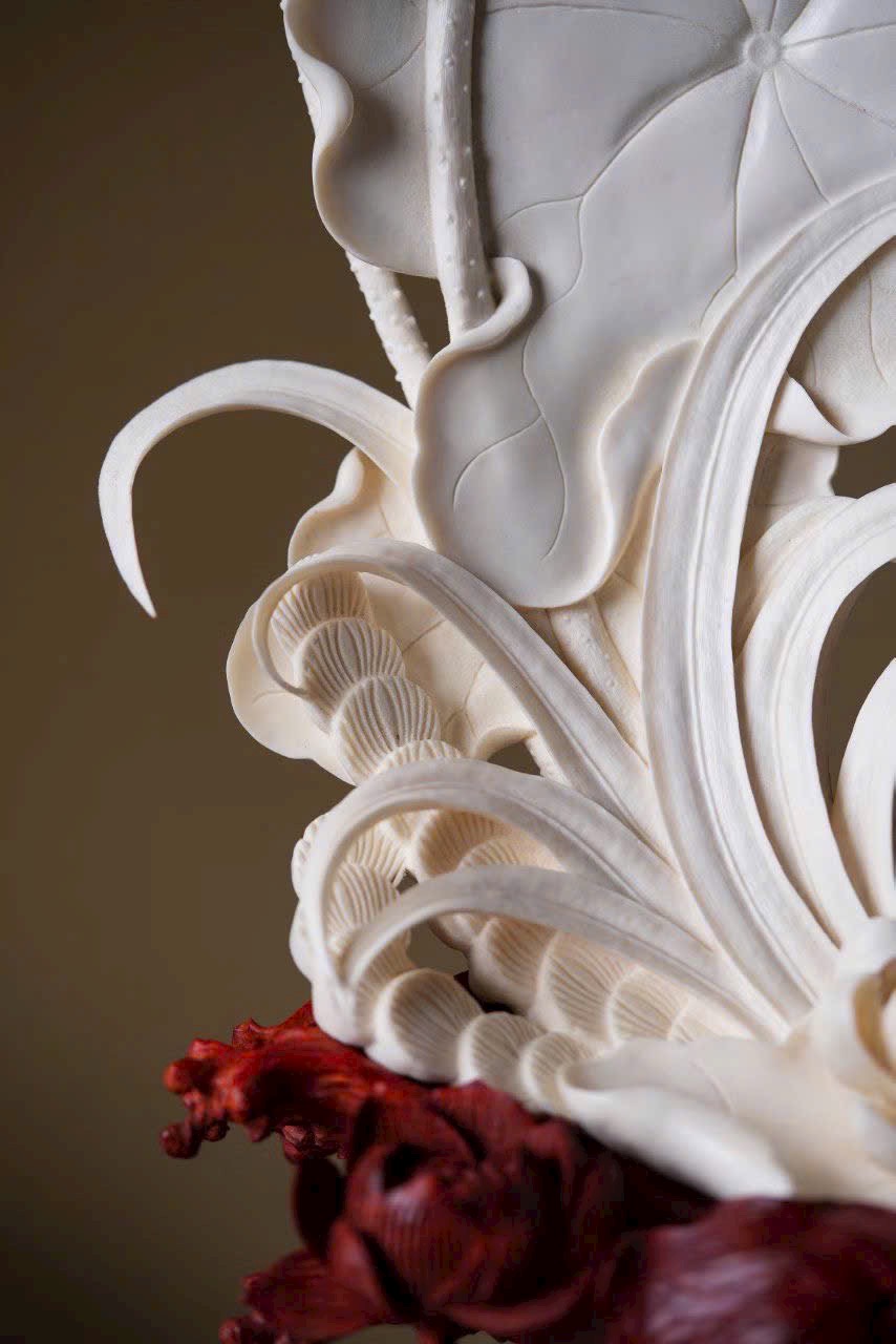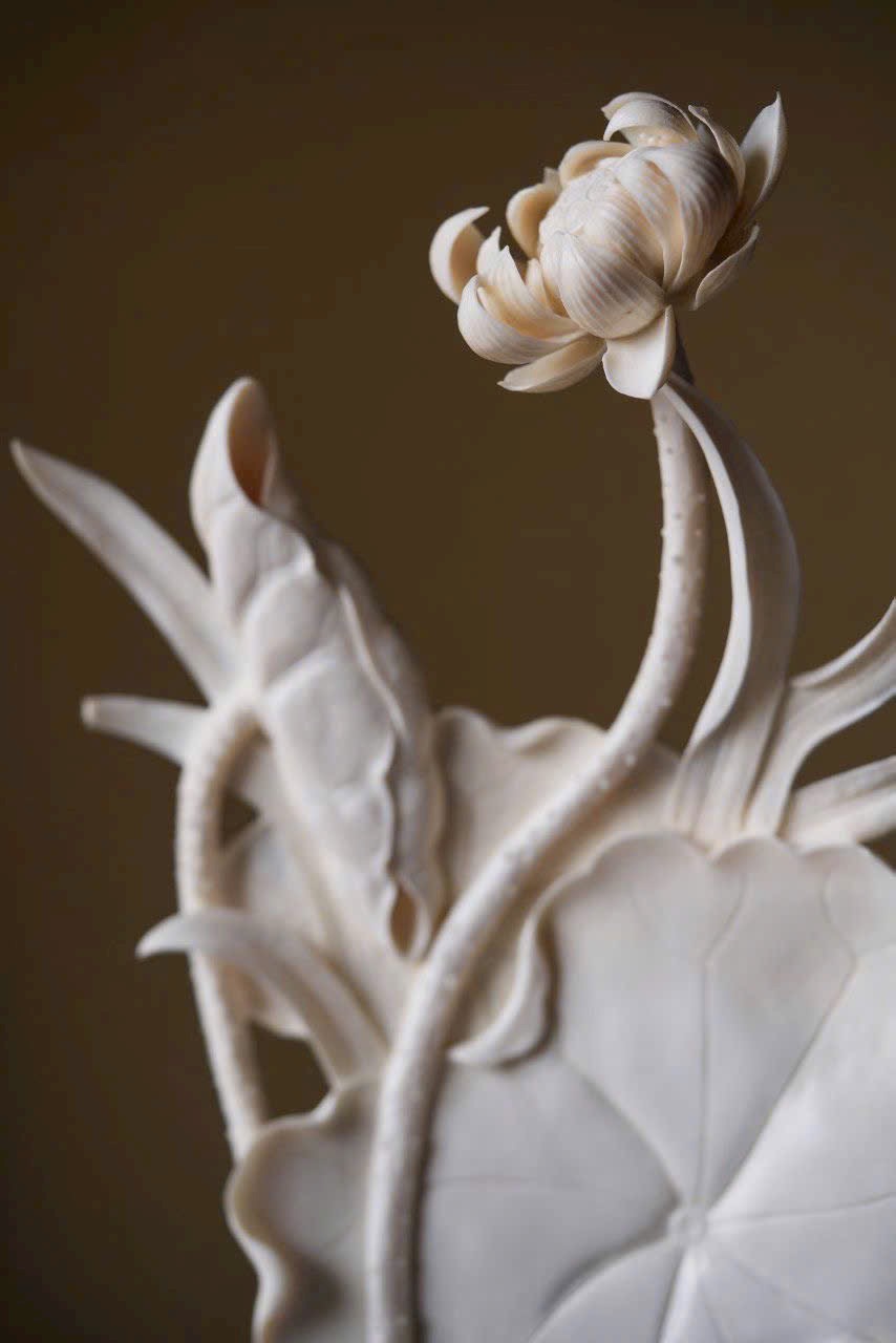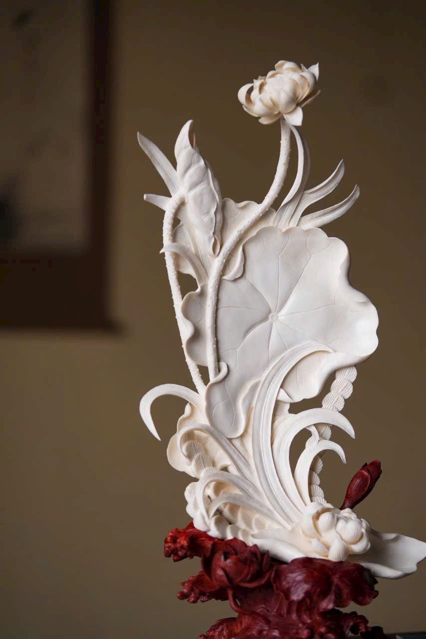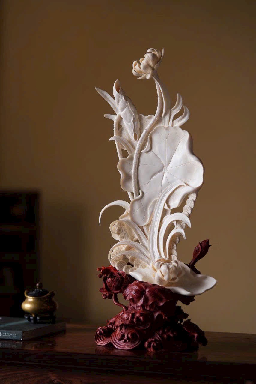 Chất sừng hươu mịn màng, chạm khắc khéo léo lá sen cuộn mở. Cánh hoa tầng tầng đón gió sương, gân cuống uốn lượn ẩn ý thiền.
