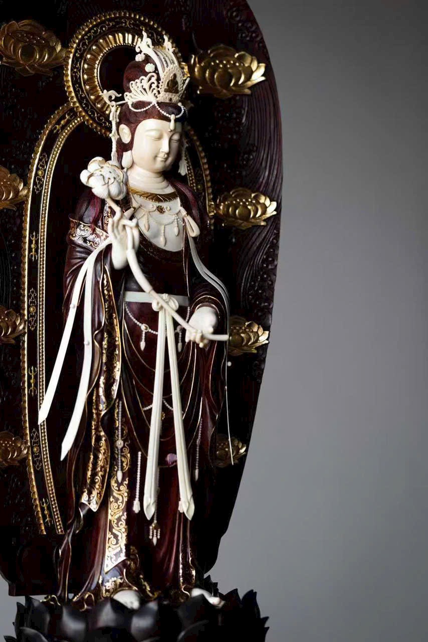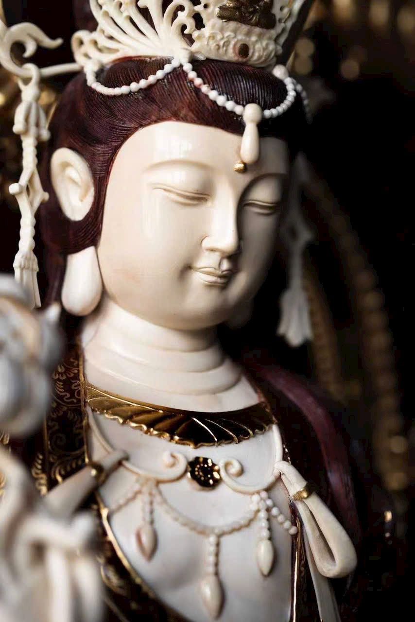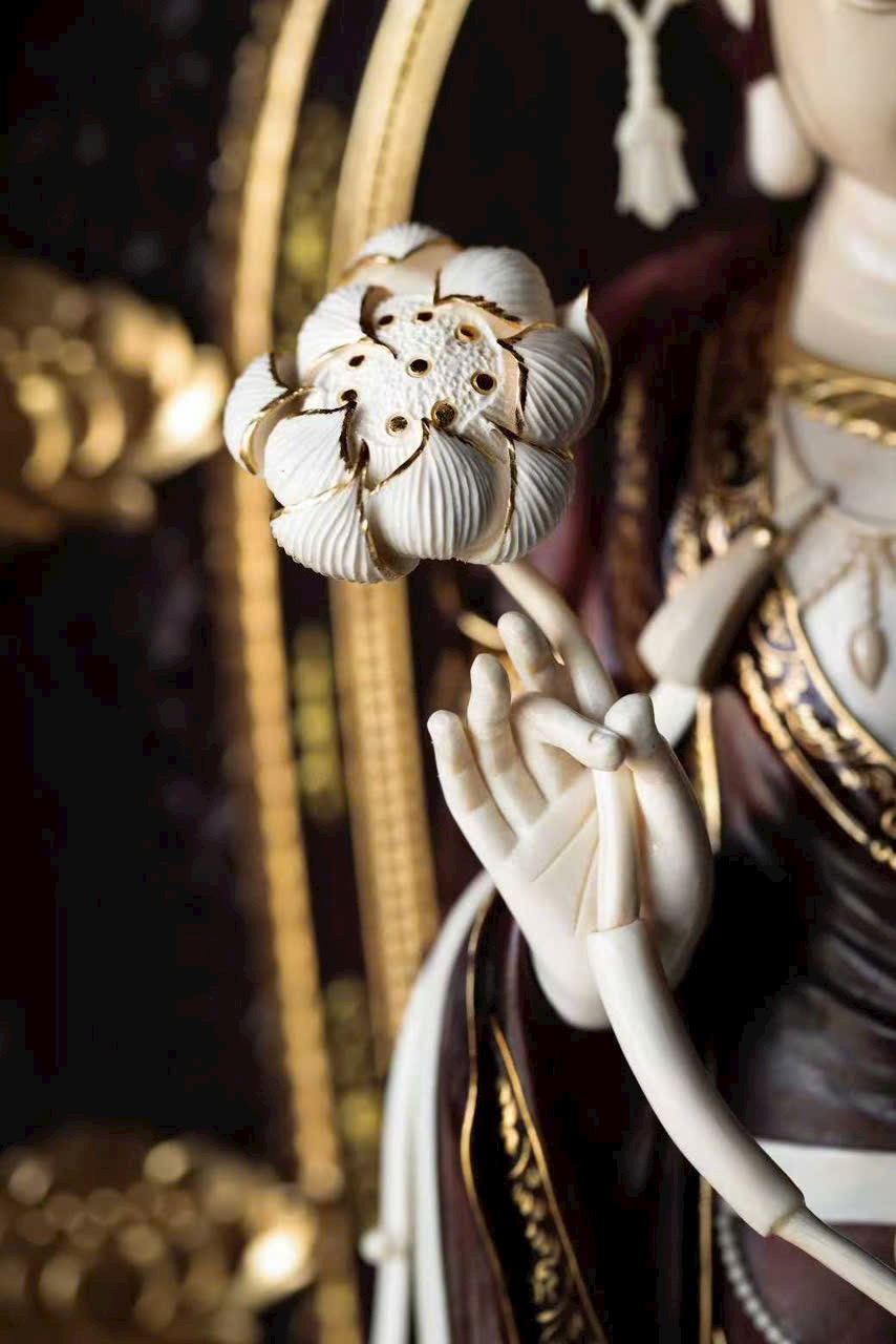 Đường chạm khắc uyển chuyển, không gượng không ngưng, ẩn chứa nụ cười từ bi nhẹ thoáng, như ban phúc lành và thuận duyên như ý.