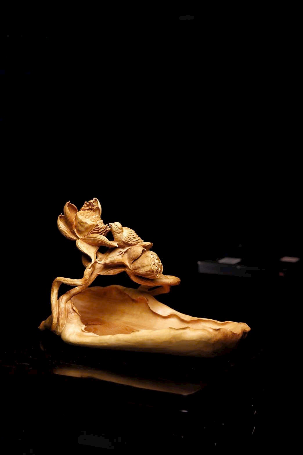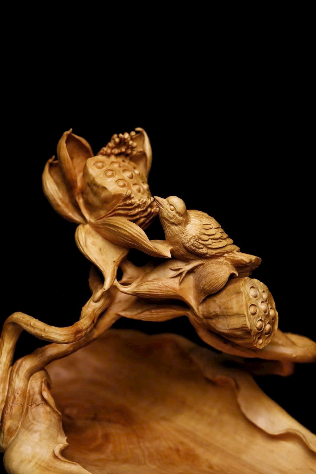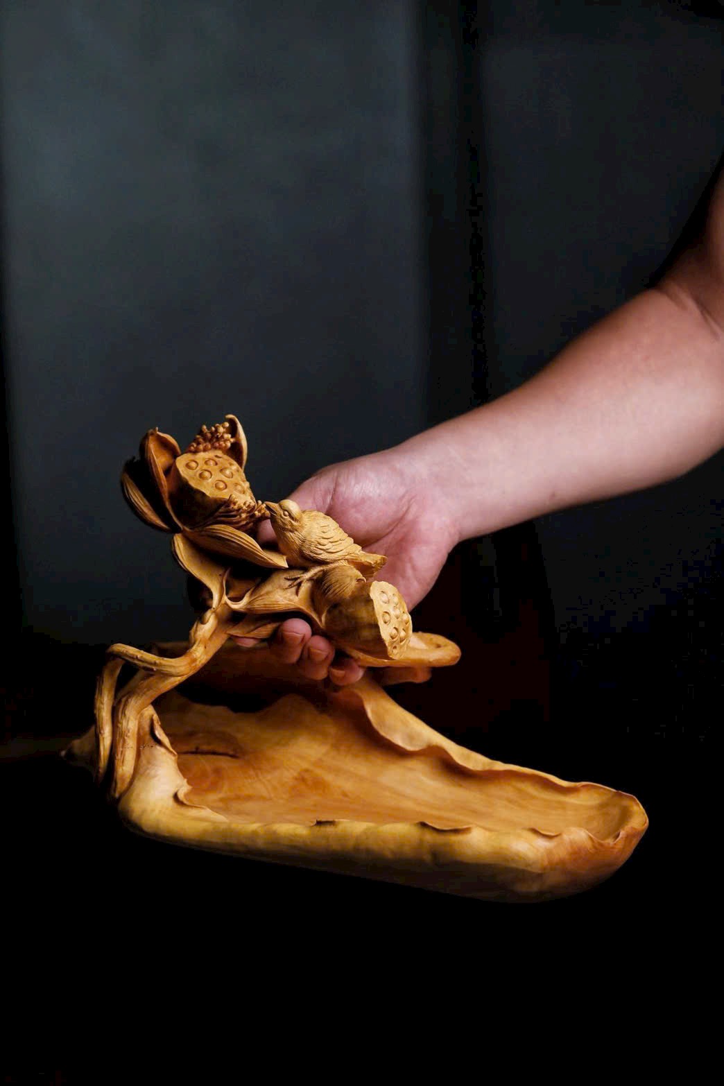 Tạc liền khối từ gỗ hoàng dương, chạm khắc tinh xảo cảnh sen nở chim thước. Cánh sen khoe sắc, gương sen tròn đầy, chim thước đậu cành sinh động tự nhiên; bên dưới là giỏ quả thuận theo dáng gỗ mà thành, hình thức tao nhã. Ý cảnh thanh nhã, đặt nơi bàn trà hay án thư đều có thể dùng đựng trái quý, tượng trưng cho niềm vui nối tiếp quanh năm.