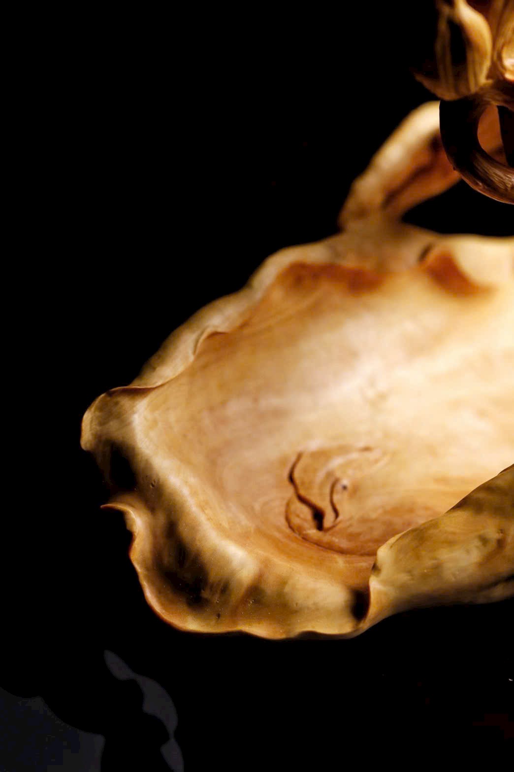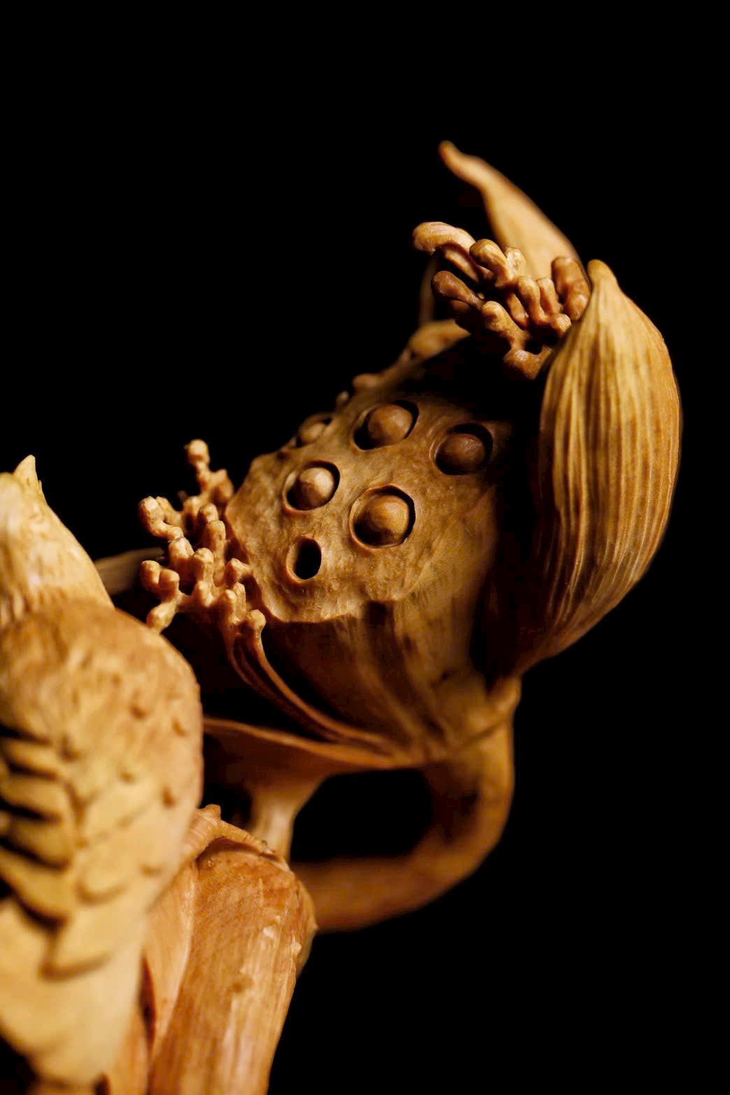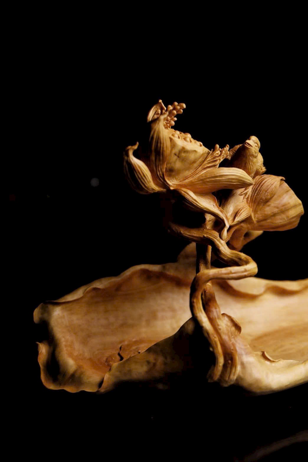 Tạc liền khối từ gỗ hoàng dương, chạm khắc tinh xảo cảnh sen nở chim thước. Cánh sen khoe sắc, gương sen tròn đầy, chim thước đậu cành sinh động tự nhiên; bên dưới là giỏ quả thuận theo dáng gỗ mà thành, hình thức tao nhã. Ý cảnh thanh nhã, đặt nơi bàn trà hay án thư đều có thể dùng đựng trái quý, tượng trưng cho niềm vui nối tiếp quanh năm.