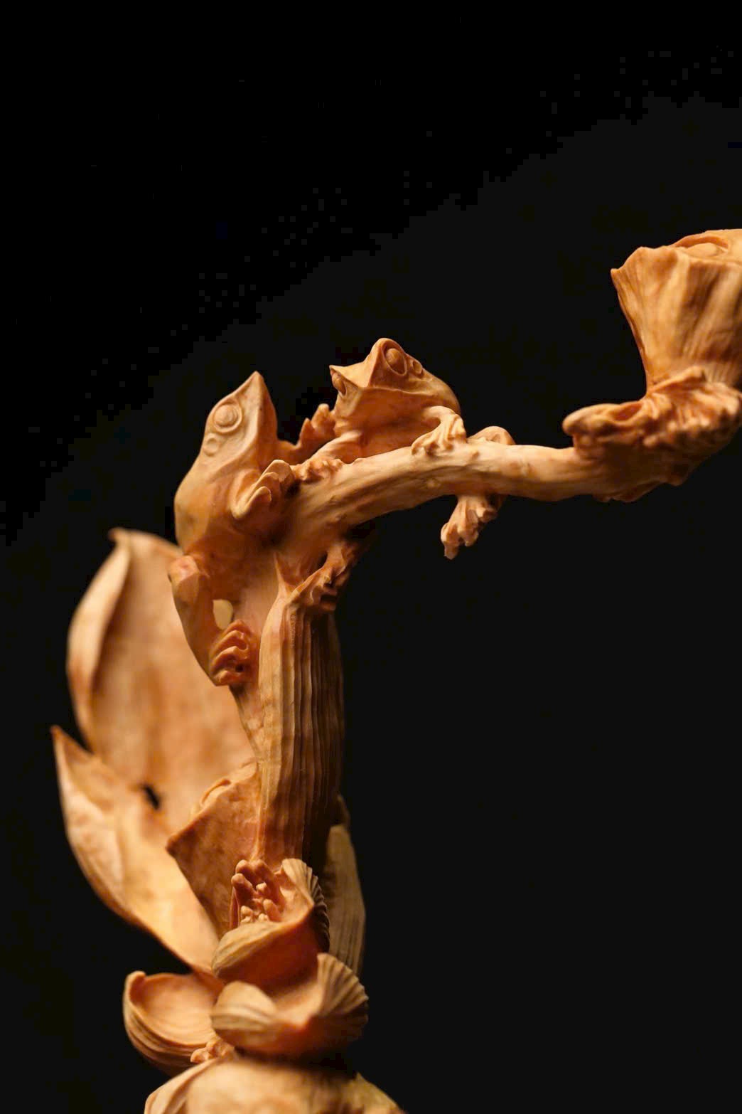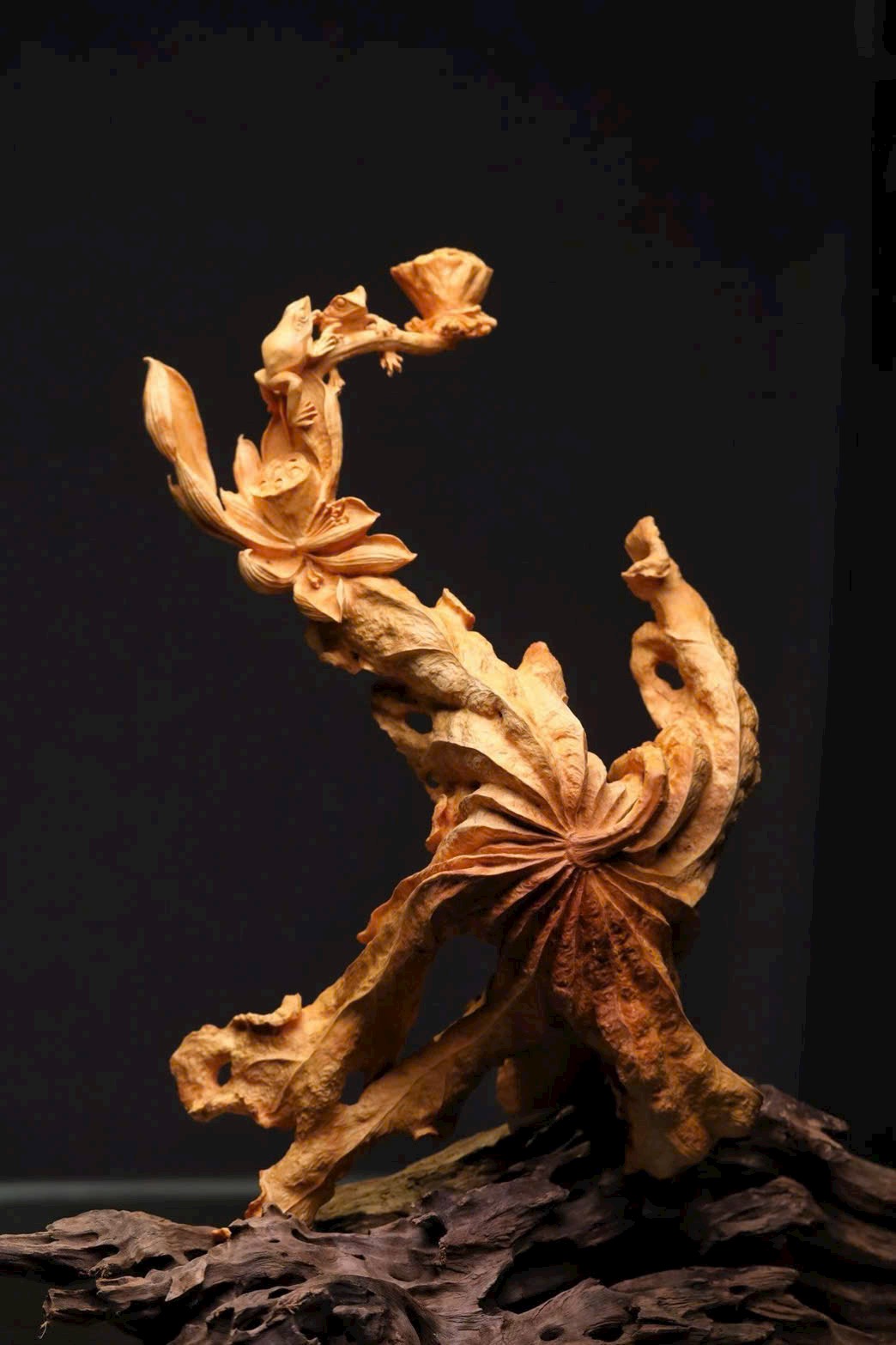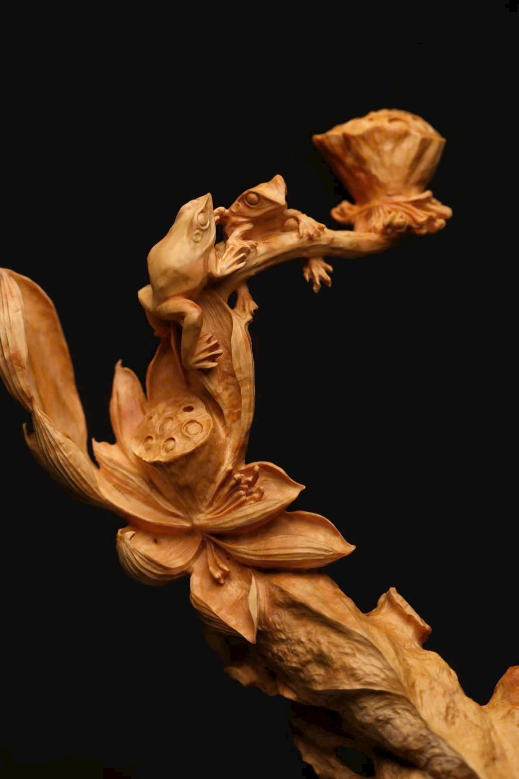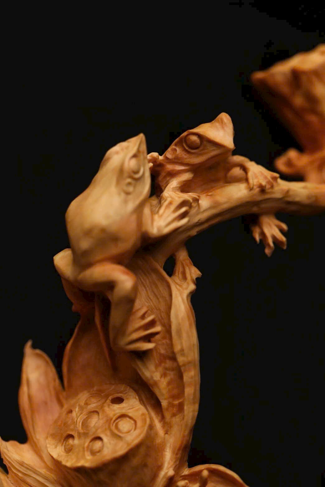 Tác phẩm được chạm lộng từ một khối gỗ liền. Hoa sen được khắc họa sinh động với nhiều dáng vẻ: nụ e ấp chờ nở, búp bung tỏa hương, lá sen xoè rộng, ếch con nô đùa trên mặt lá — tất cả hòa quyện thành bức cảnh tràn đầy sức sống. Bày nơi bàn hay kệ, gửi gắm lời chúc cát tường thịnh vượng, năm nào cũng phát đạt hanh thông.