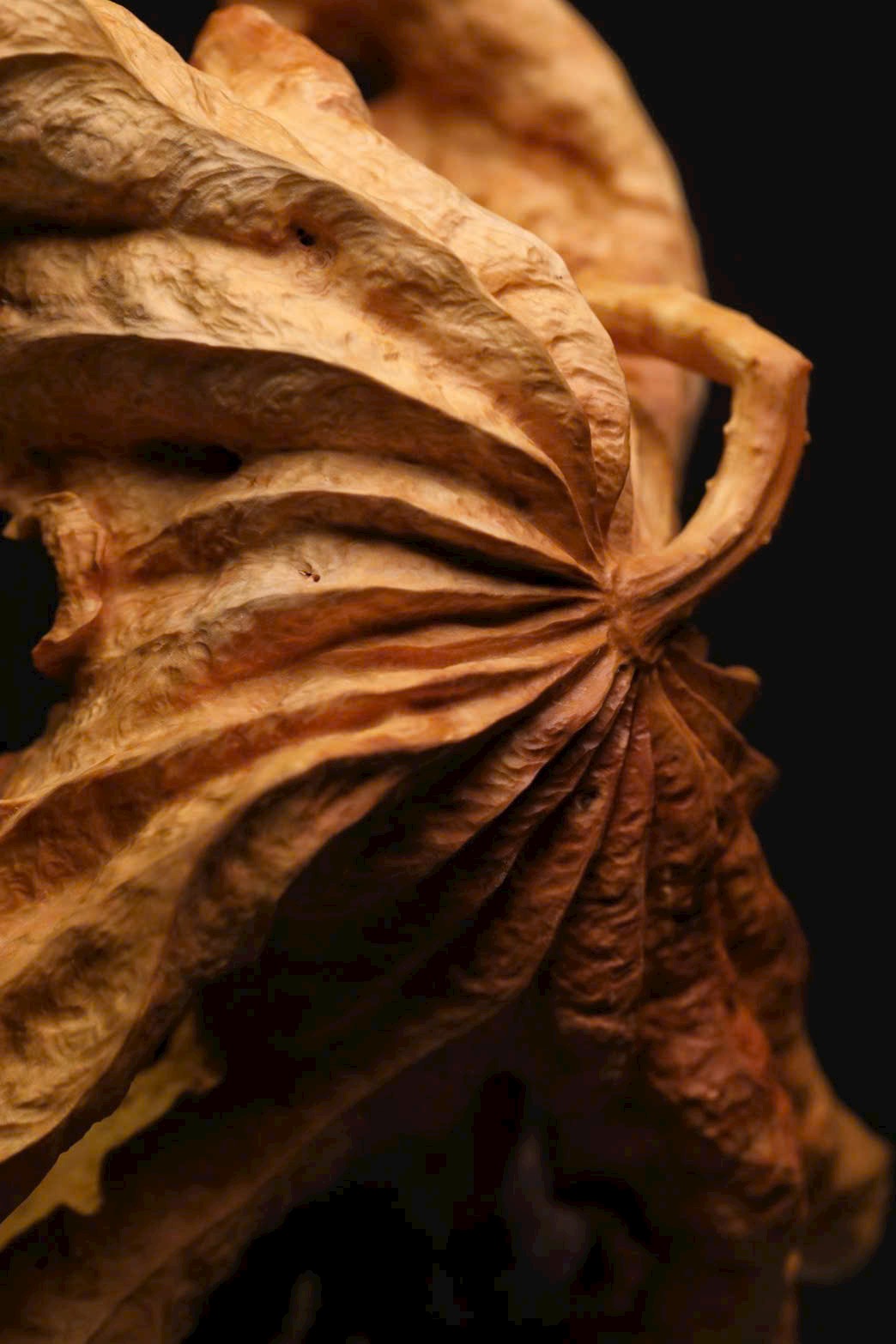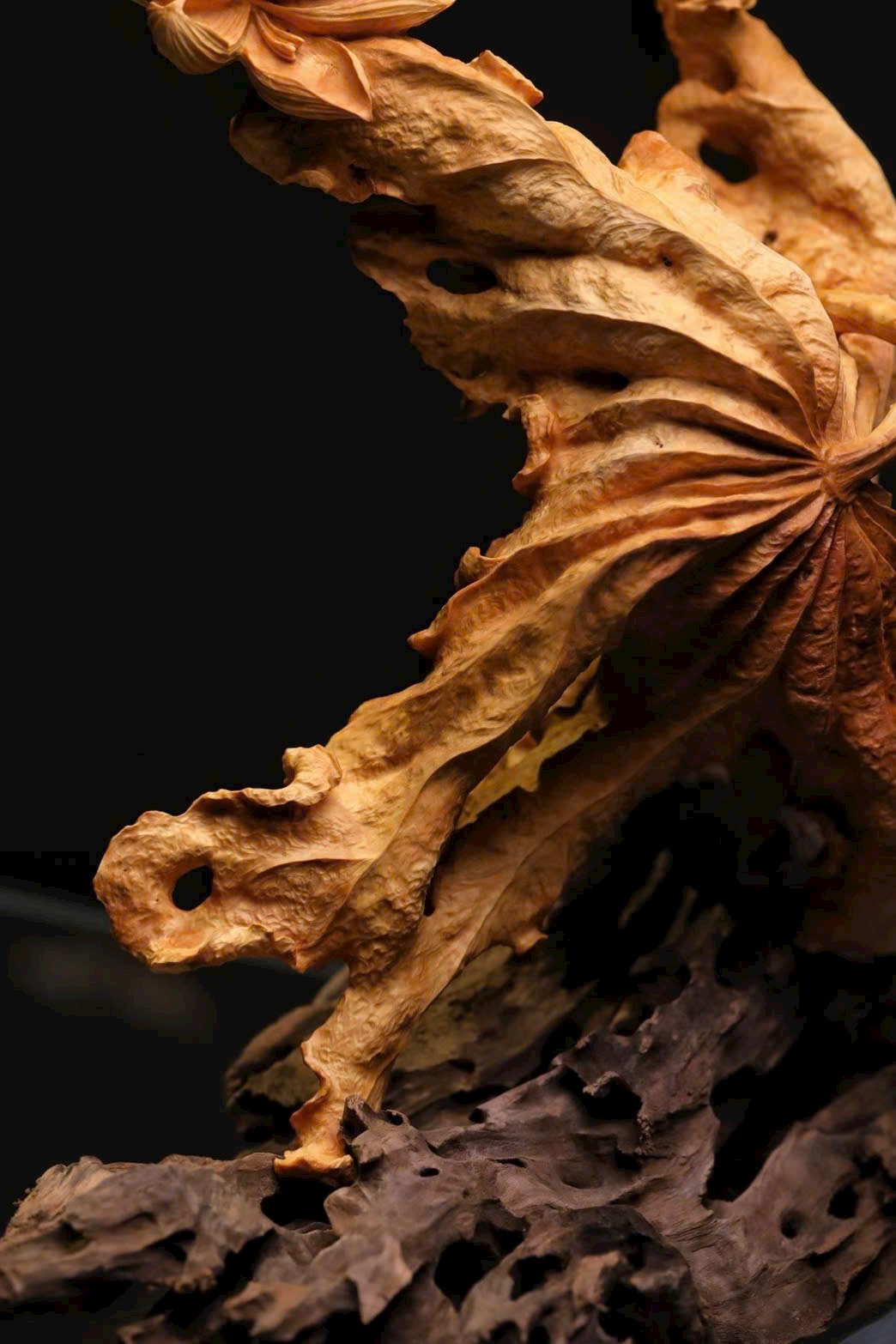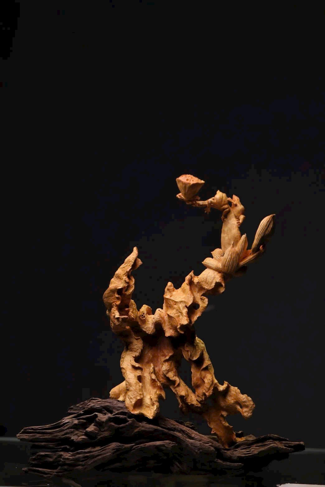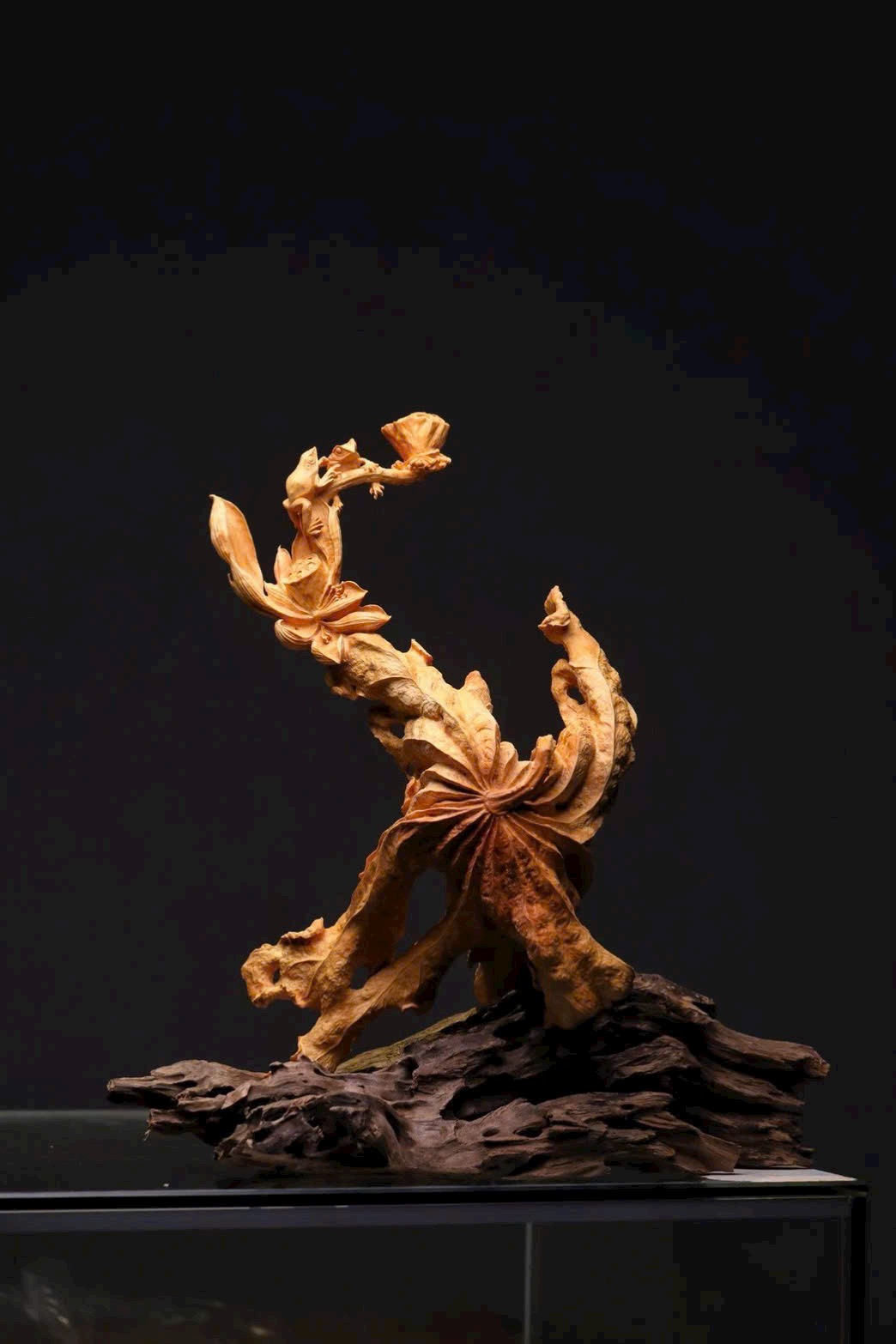 Tác phẩm được chạm lộng từ một khối gỗ liền. Hoa sen được khắc họa sinh động với nhiều dáng vẻ: nụ e ấp chờ nở, búp bung tỏa hương, lá sen xoè rộng, ếch con nô đùa trên mặt lá — tất cả hòa quyện thành bức cảnh tràn đầy sức sống. Bày nơi bàn hay kệ, gửi gắm lời chúc cát tường thịnh vượng, năm nào cũng phát đạt hanh thông.