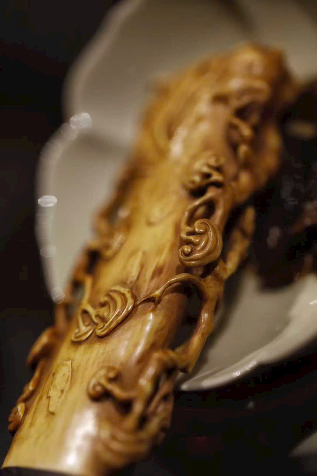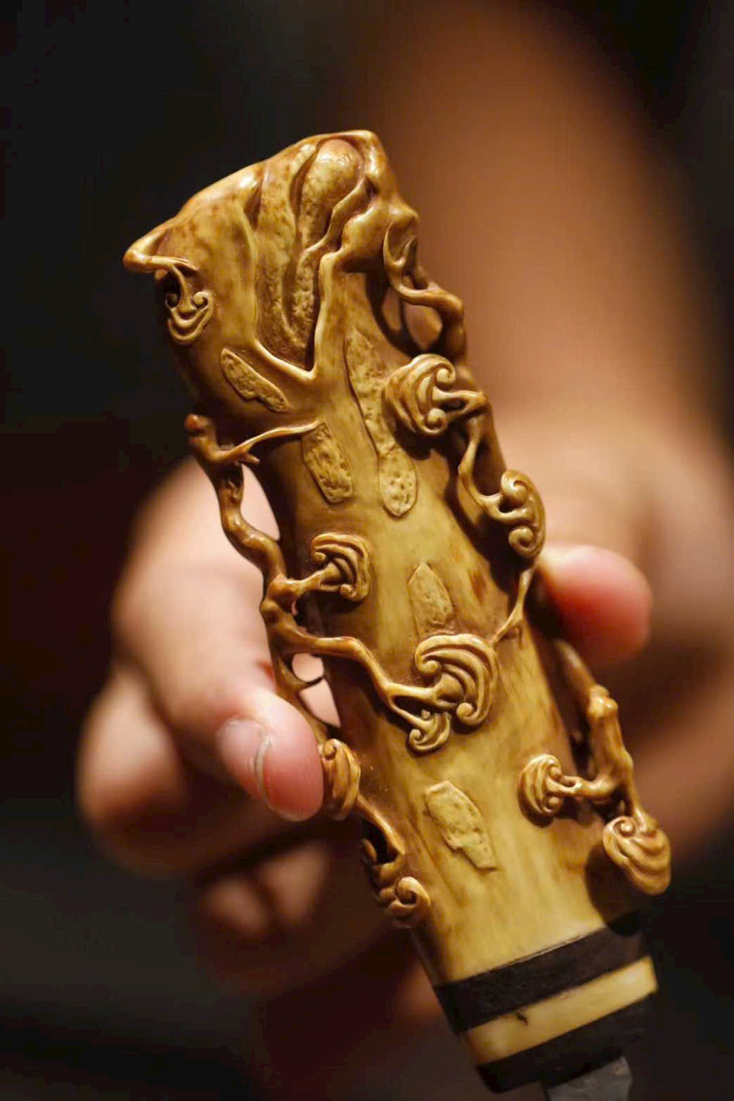 Tác phẩm được chế tác từ ng.à voi ma mút, chạm khắc hình linh chi quấn cành tinh tế. Đường vân chất ngọc ấm áp, tạo hình nổi khối sinh động, toát lên phong vị cổ xưa và trang nhã.