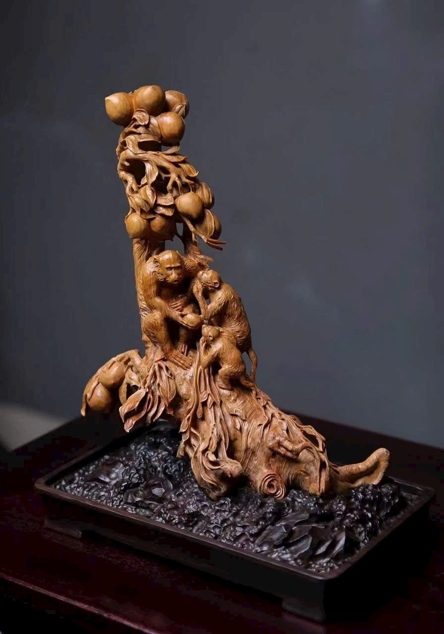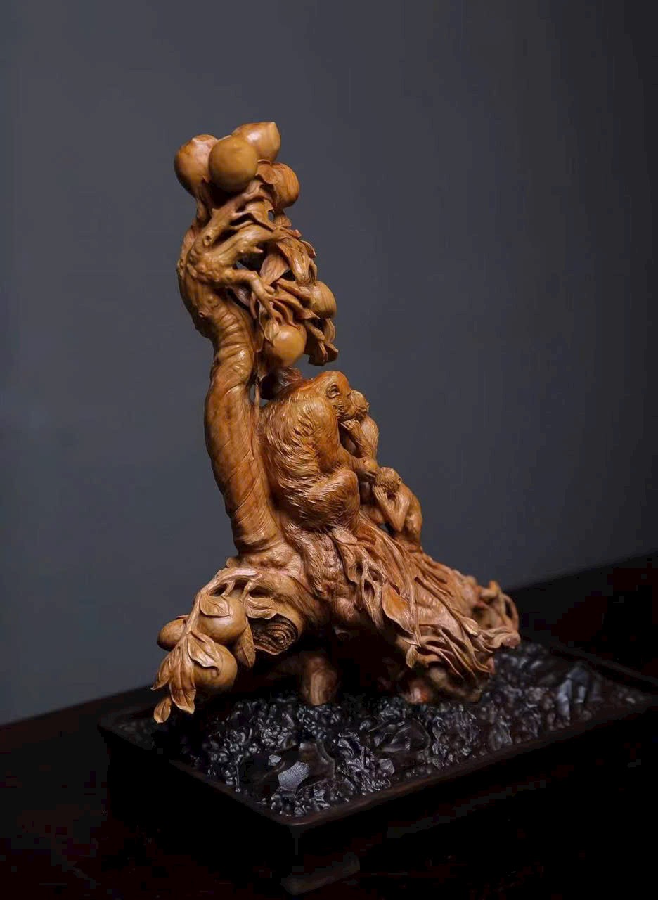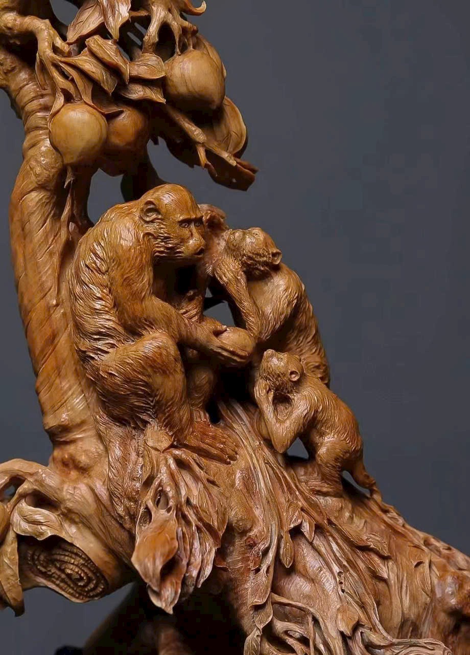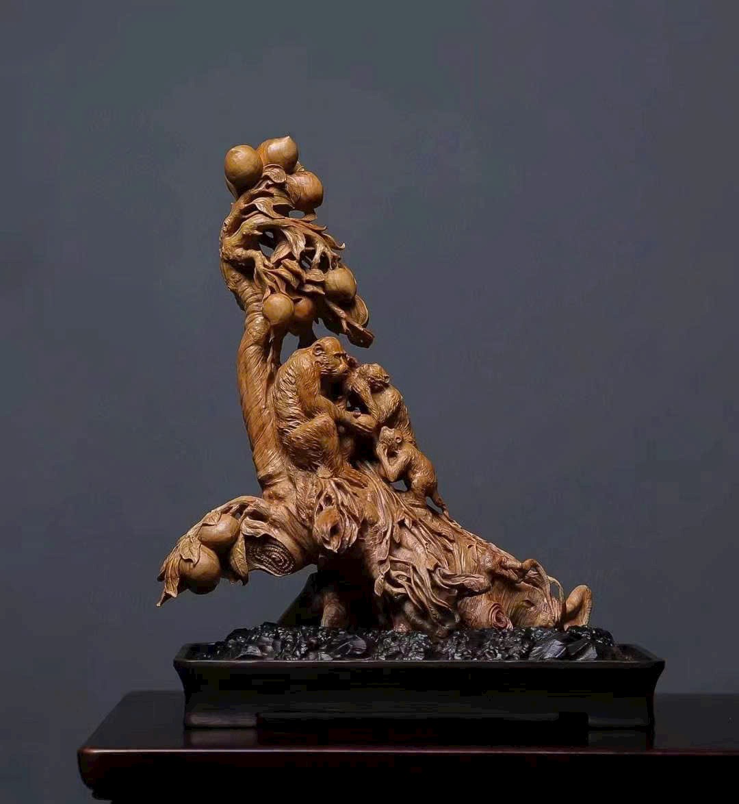 🪵 Tác phẩm “Linh Hầu Hiến Thọ” – gỗ đàn hương Ấn Độ nguyên khối