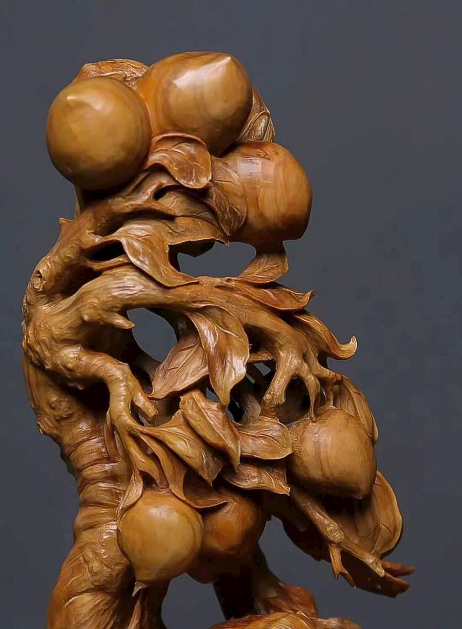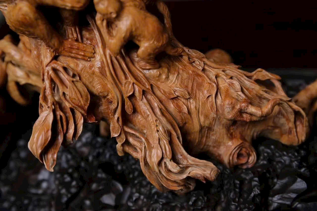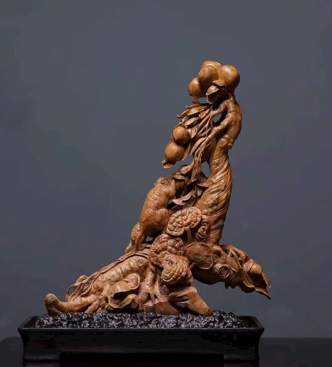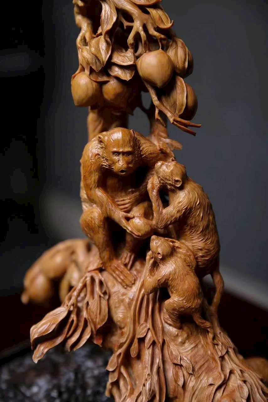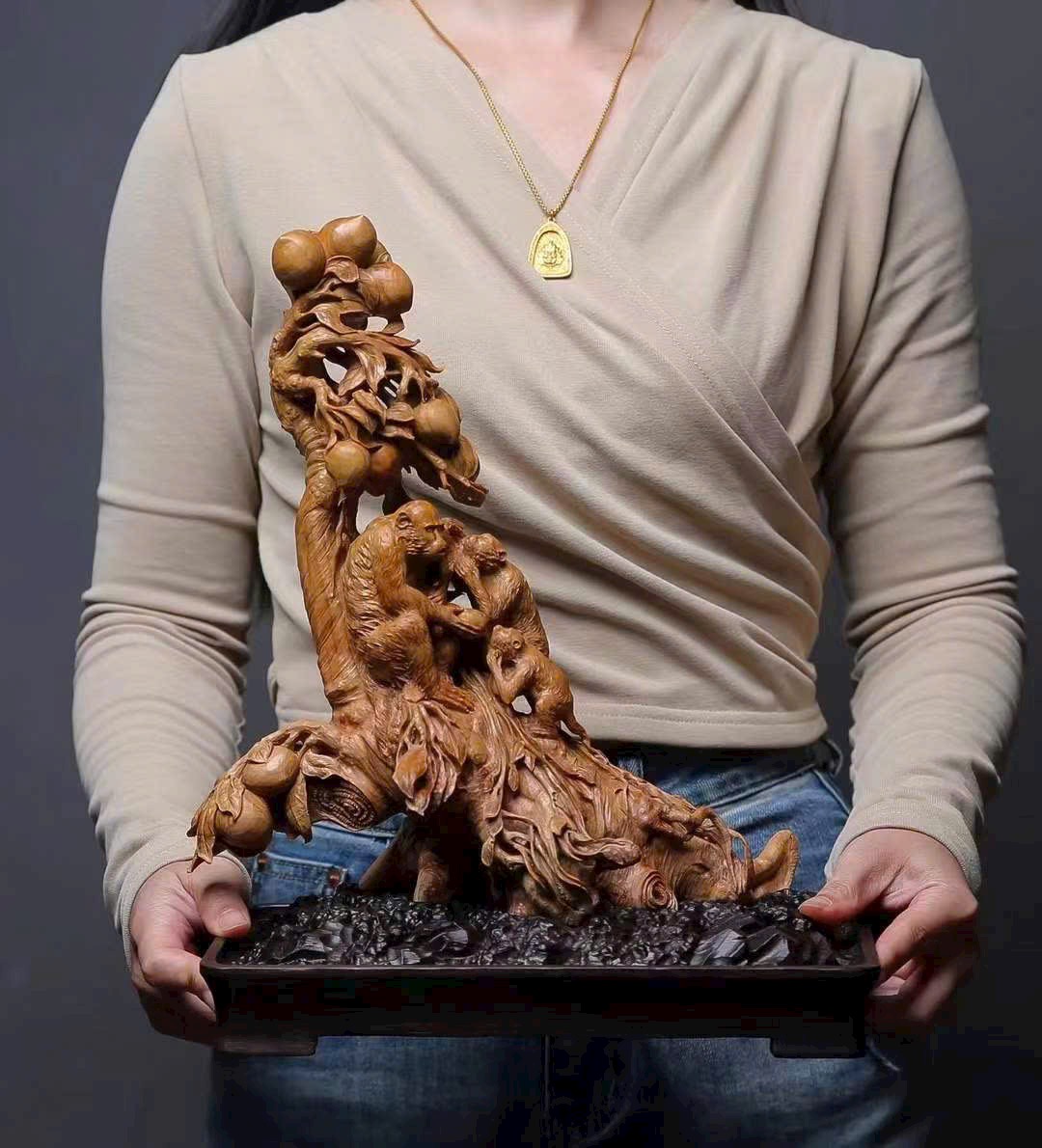 🪵 Tác phẩm “Linh Hầu Hiến Thọ” – gỗ đàn hương Ấn Độ nguyên khối