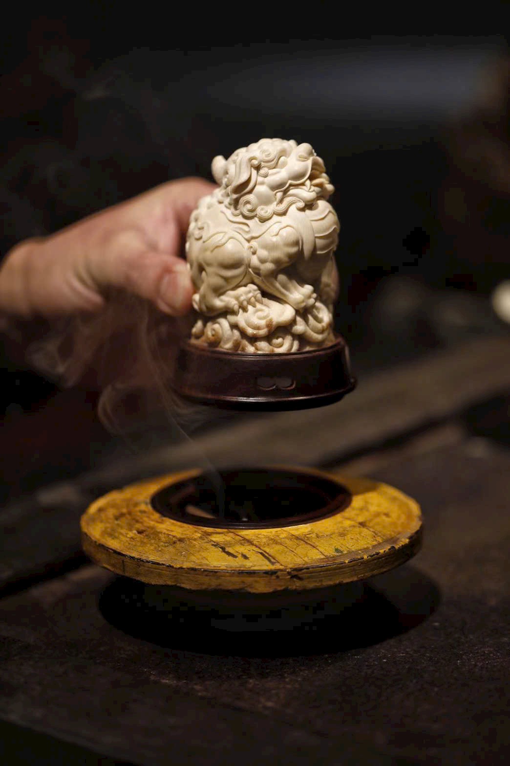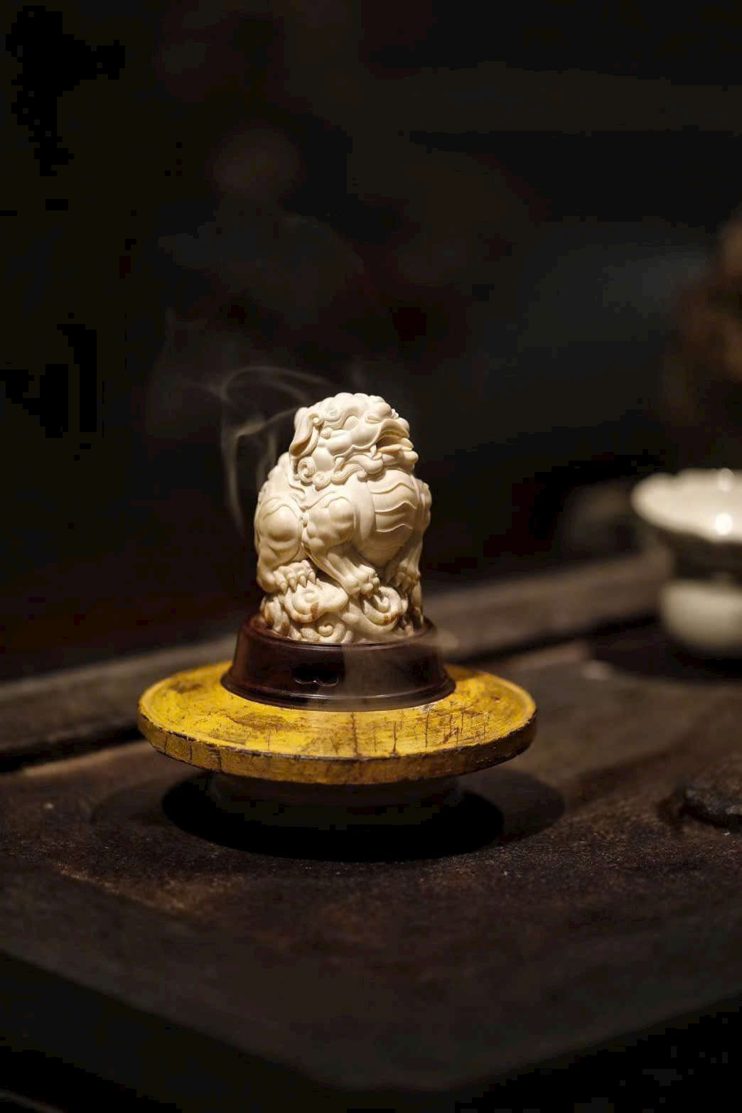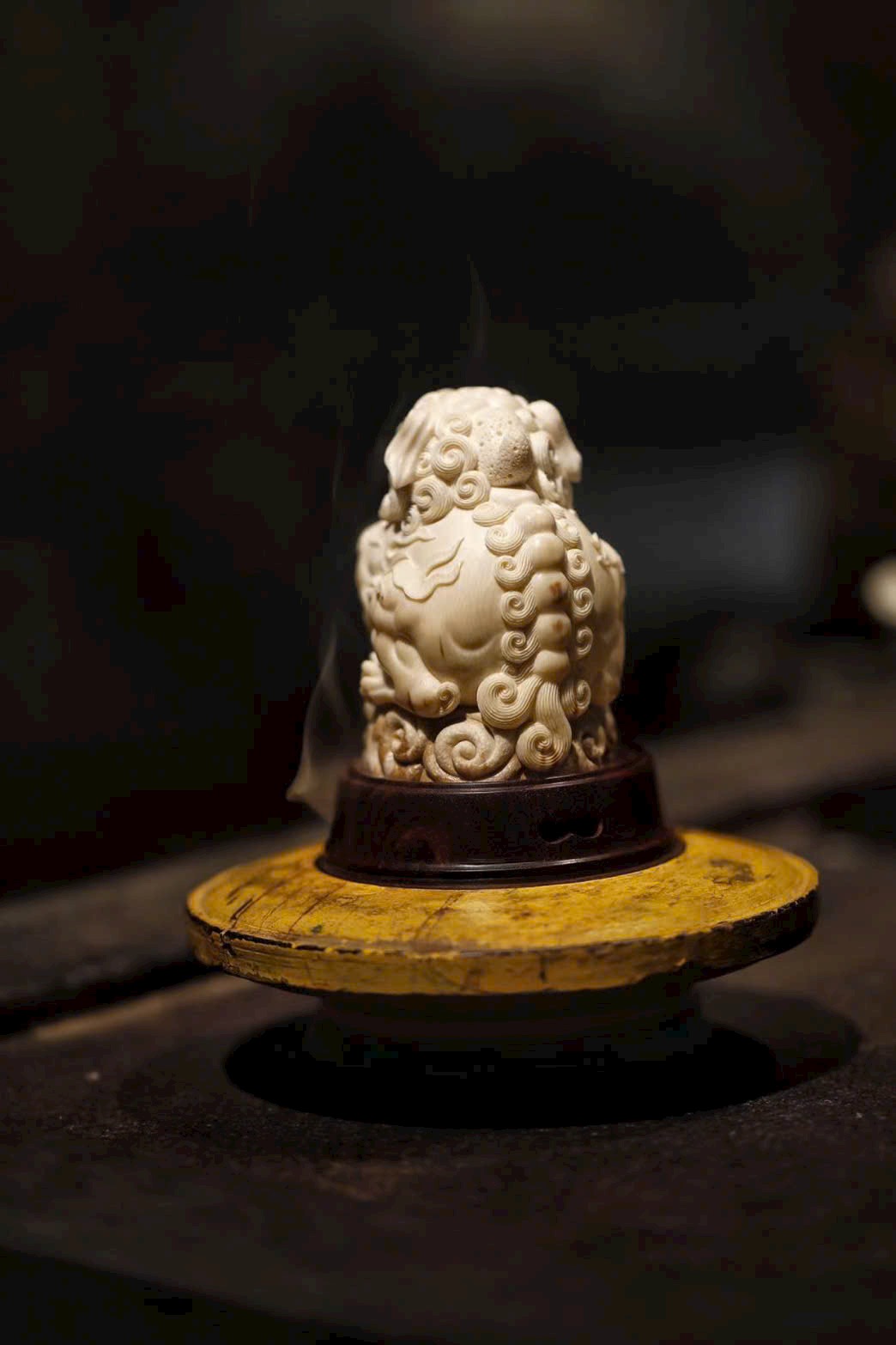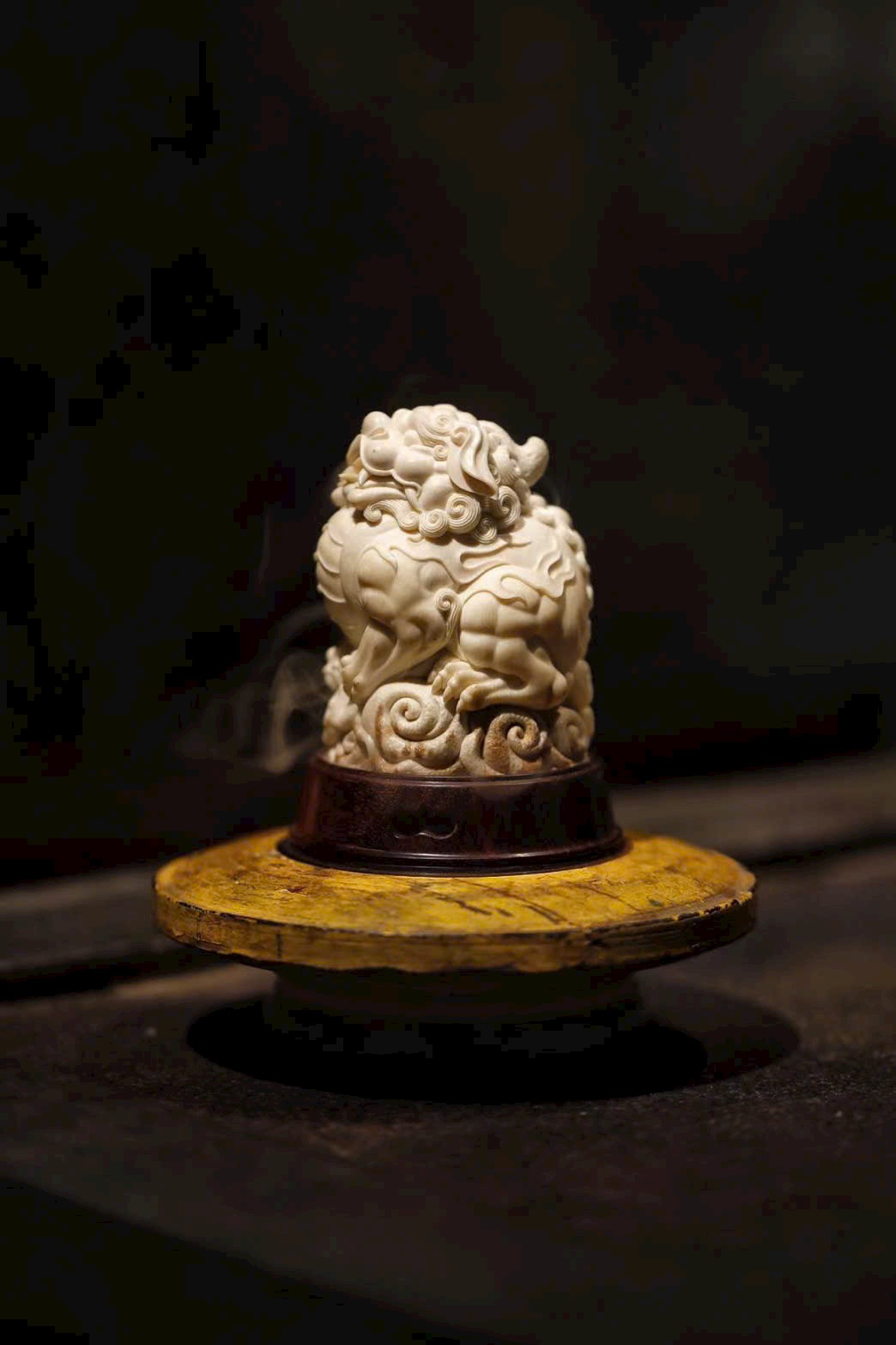 Chọn tử đàn già làm đế lò, vân gỗ trầm ấm, dáng chân đế mềm mại, hài hòa với chất ngà ma mút bên trên. Tỳ Hưu ở phần trên trong tư thế phủ phục, cơ khối đầy đặn rắn rỏi, móng vuốt thu lực mạnh mẽ. Khi đốt hương, khói mây thoát ra và được “nuốt” vào miệng Tỳ Hưu, vừa toát lên dáng vẻ uy nghi bá khí, vừa ẩn chứa ý nghĩa tụ tài nạp phúc.
