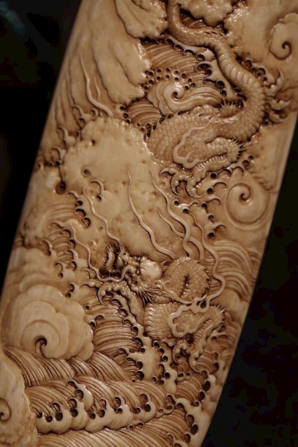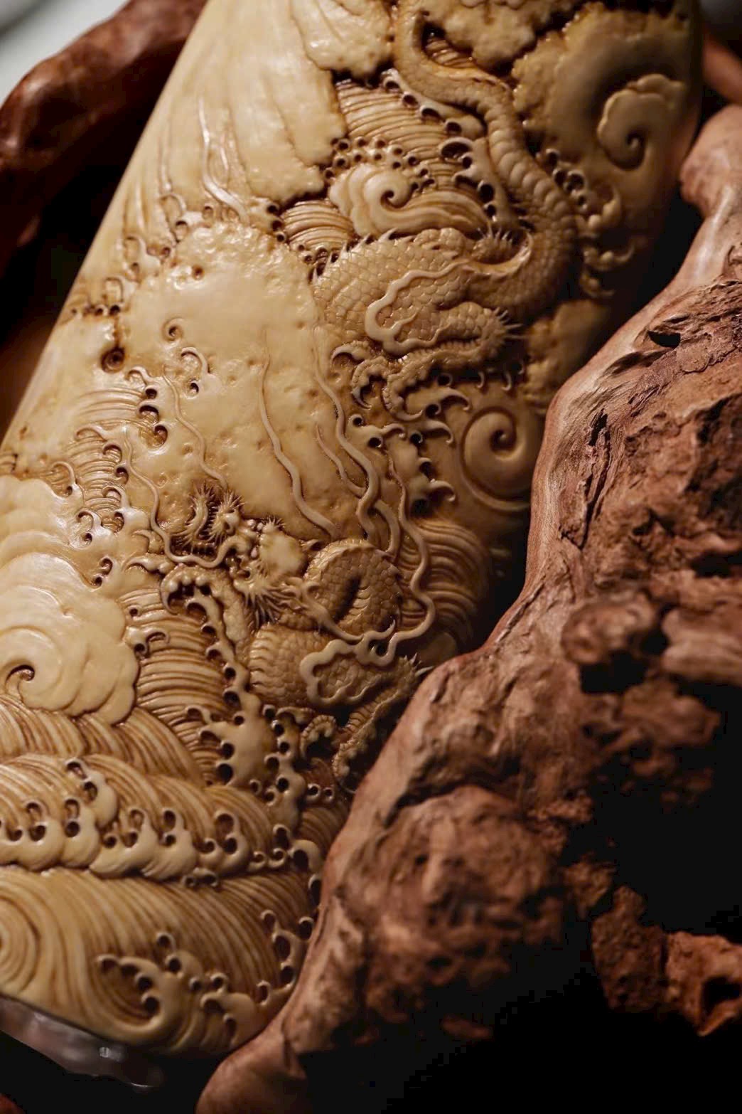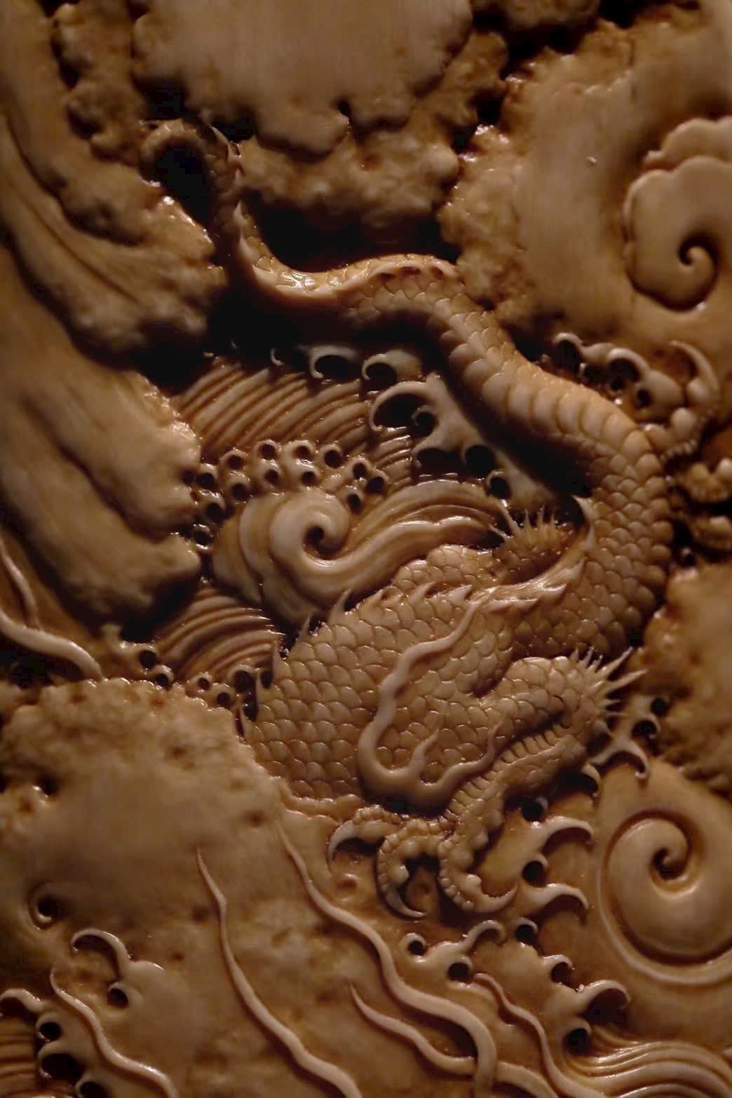 Tác phẩm sử dụng kỹ thuật phù điêu nông, khắc họa hình tượng rồng cát tường xoáy gió bay lên, giẫm mình trên tầng mây, năm móng giương mạnh đầy uy lực. Thân rồng ẩn hiện bay lượn giữa mây lành, biển mây cuồn cuộn dâng trào, tạo nên sự hòa quyện giữa thực và ảo, sinh động đầy khí thế.