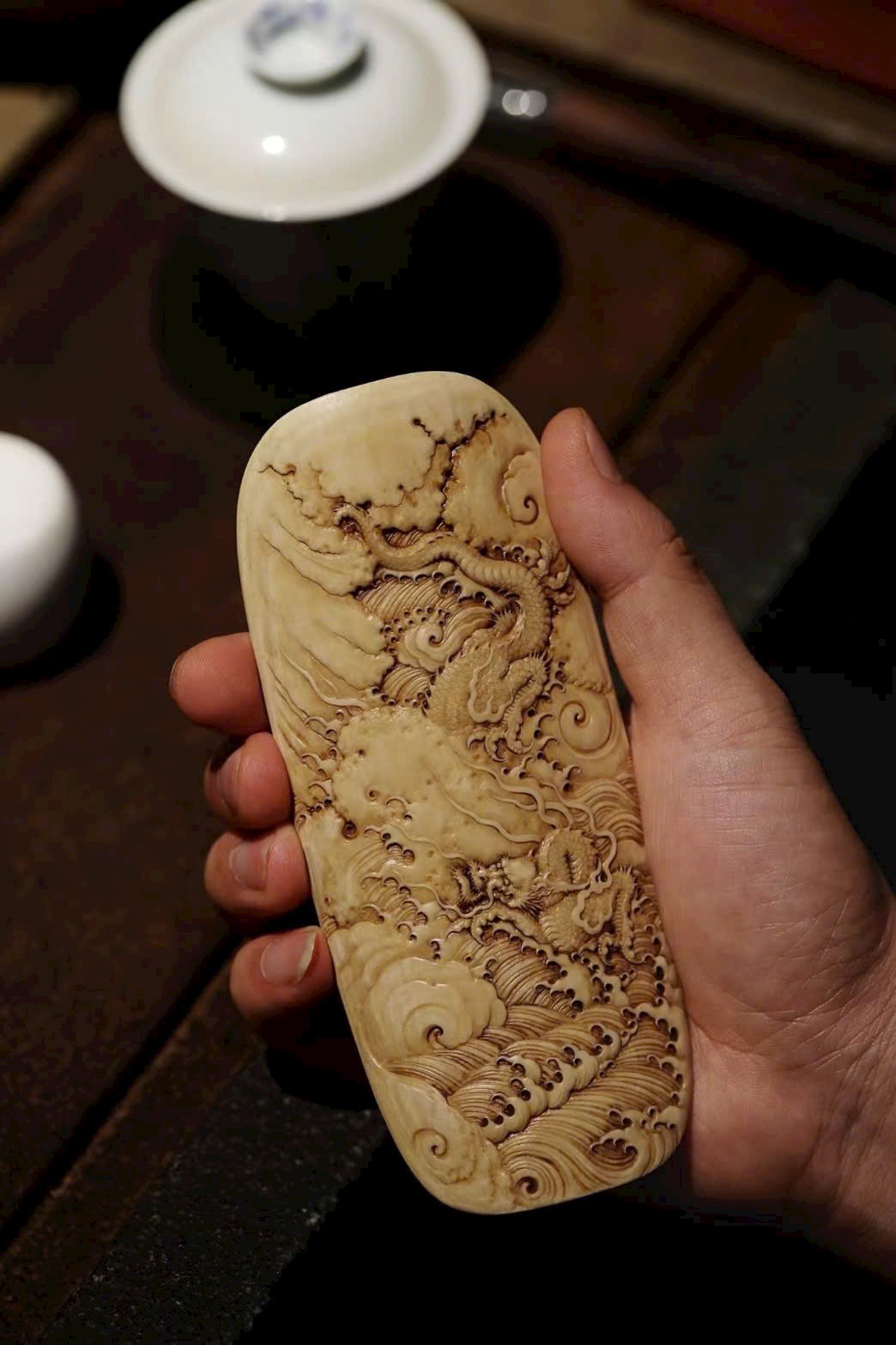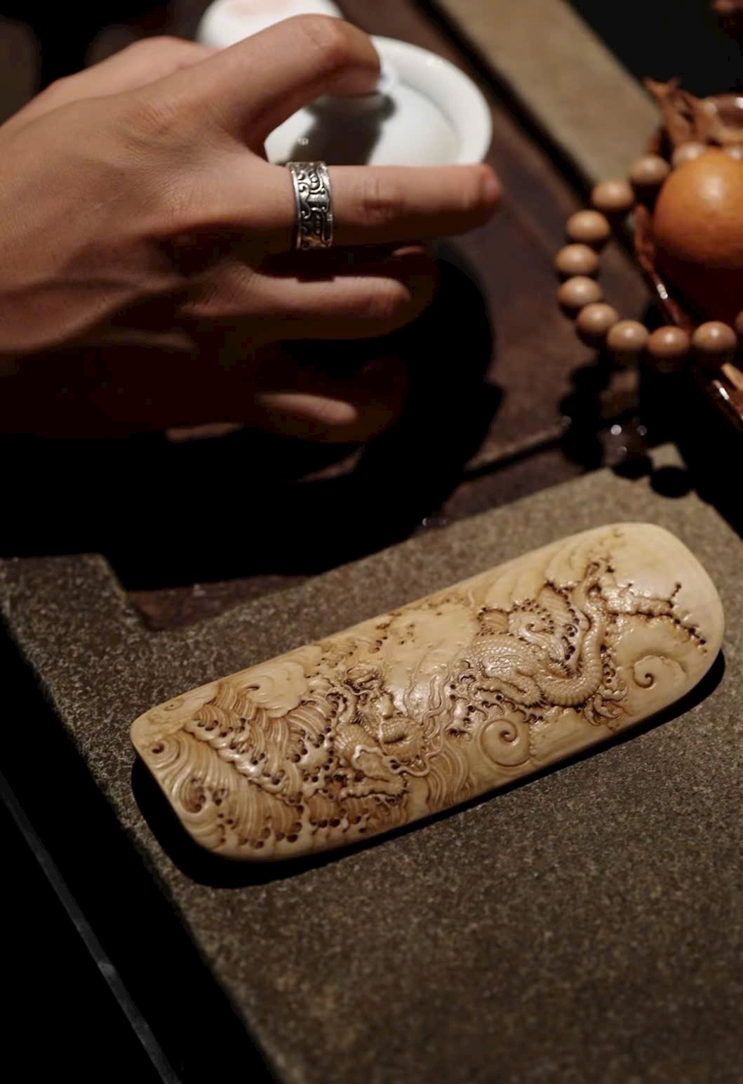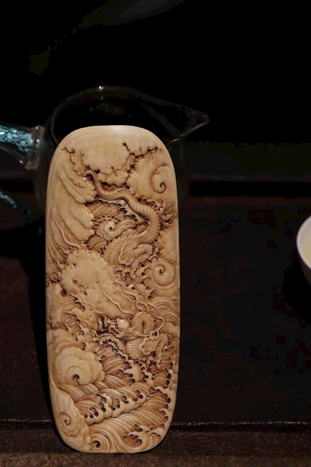 Tác phẩm sử dụng kỹ thuật phù điêu nông, khắc họa hình tượng rồng cát tường xoáy gió bay lên, giẫm mình trên tầng mây, năm móng giương mạnh đầy uy lực. Thân rồng ẩn hiện bay lượn giữa mây lành, biển mây cuồn cuộn dâng trào, tạo nên sự hòa quyện giữa thực và ảo, sinh động đầy khí thế.