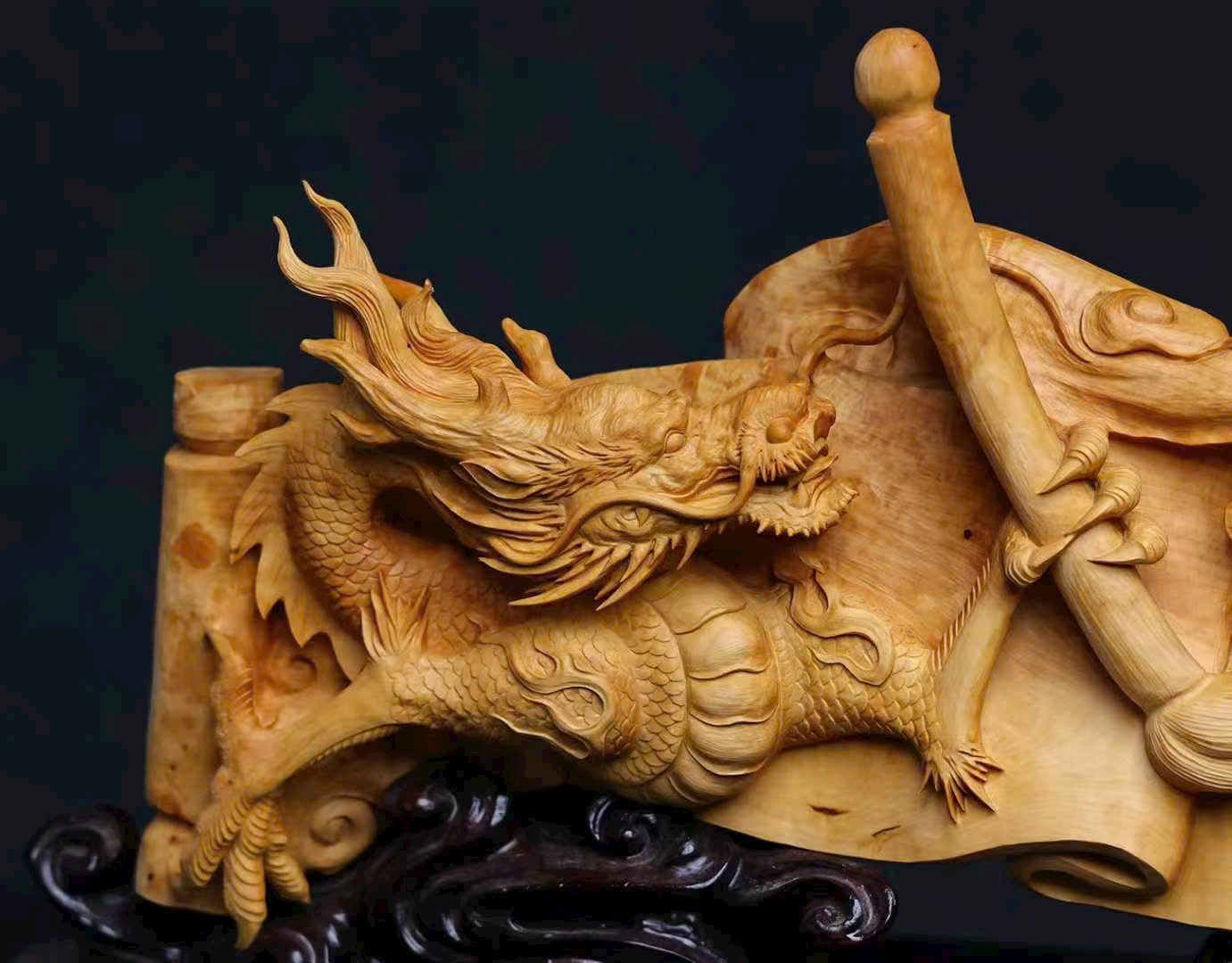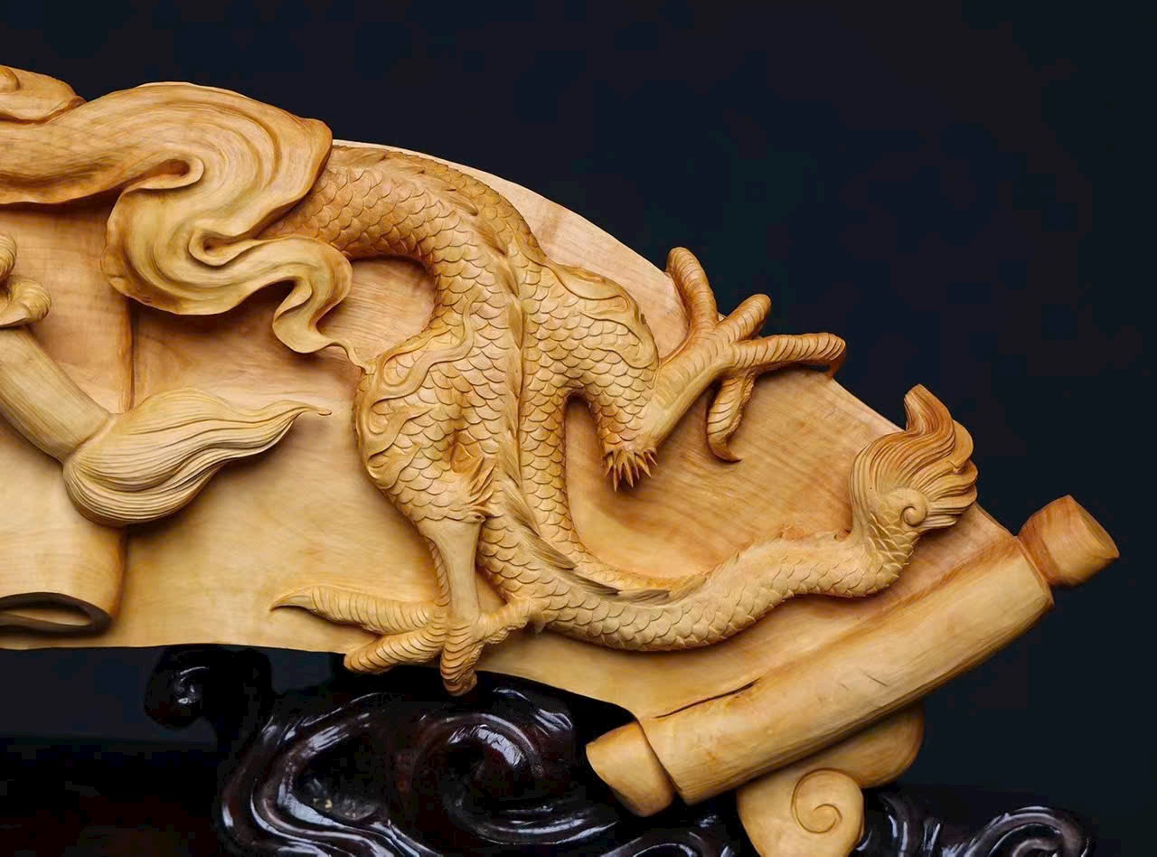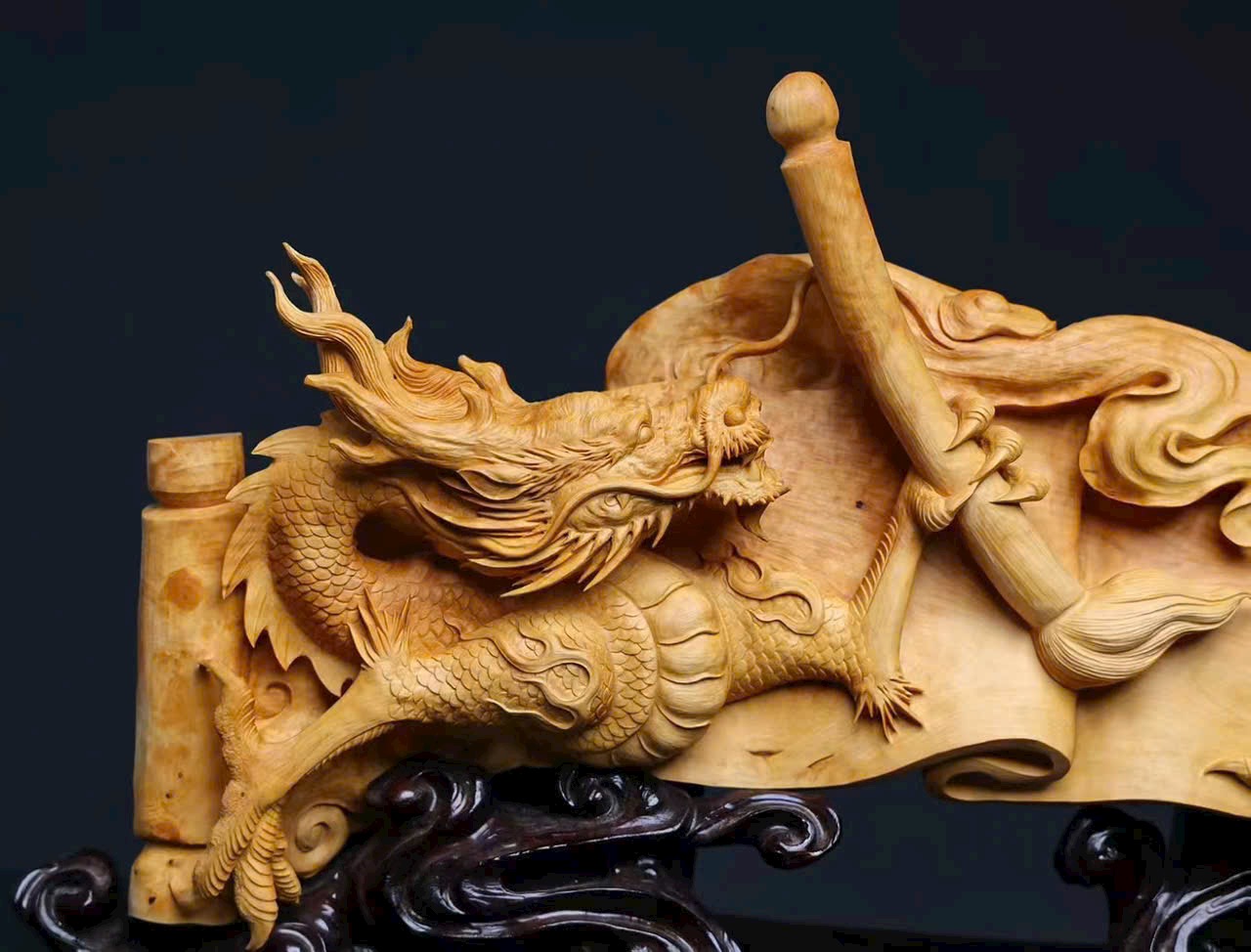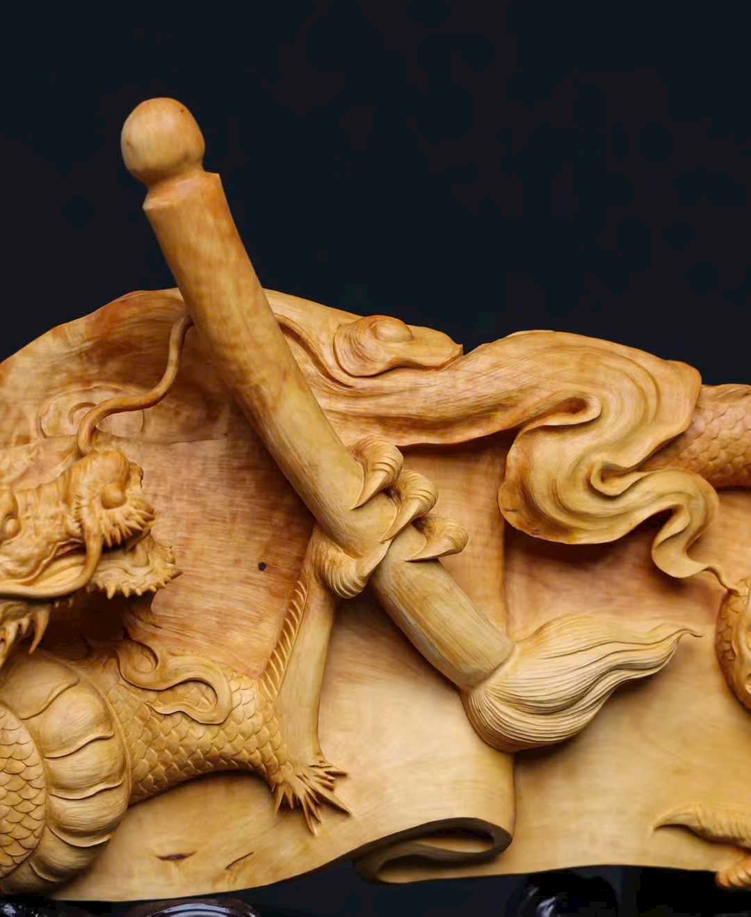 Tác phẩm thủ công từ nguyên khối gỗ hoàng dương, thân rồng uốn lượn linh hoạt, mang ý nghĩa rồng bay bốn biển, công danh thăng tiến. Rồng giữ bút tượng trưng kim bảng đề danh. Toàn bộ chạm khắc tinh xảo, tầng lớp rõ ràng.