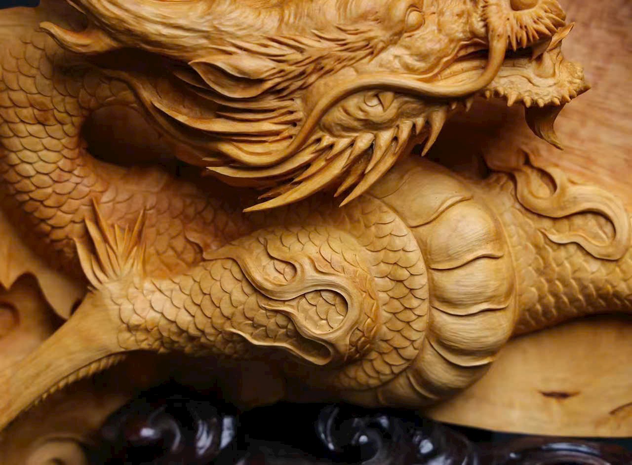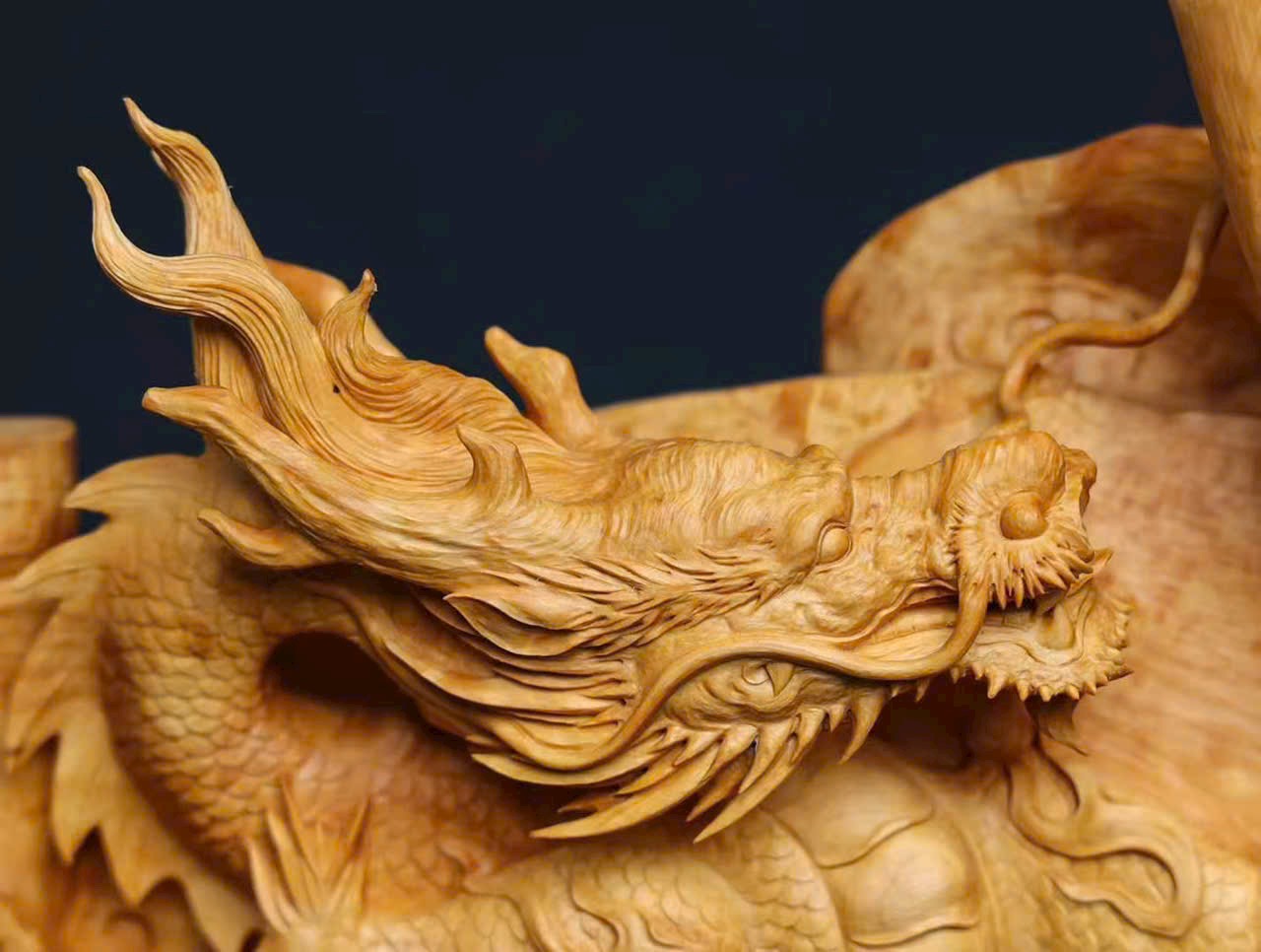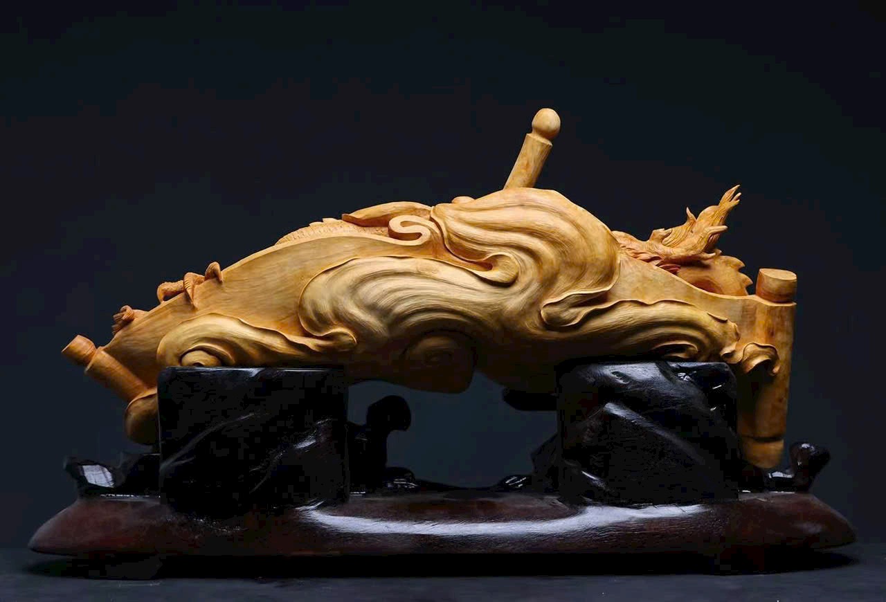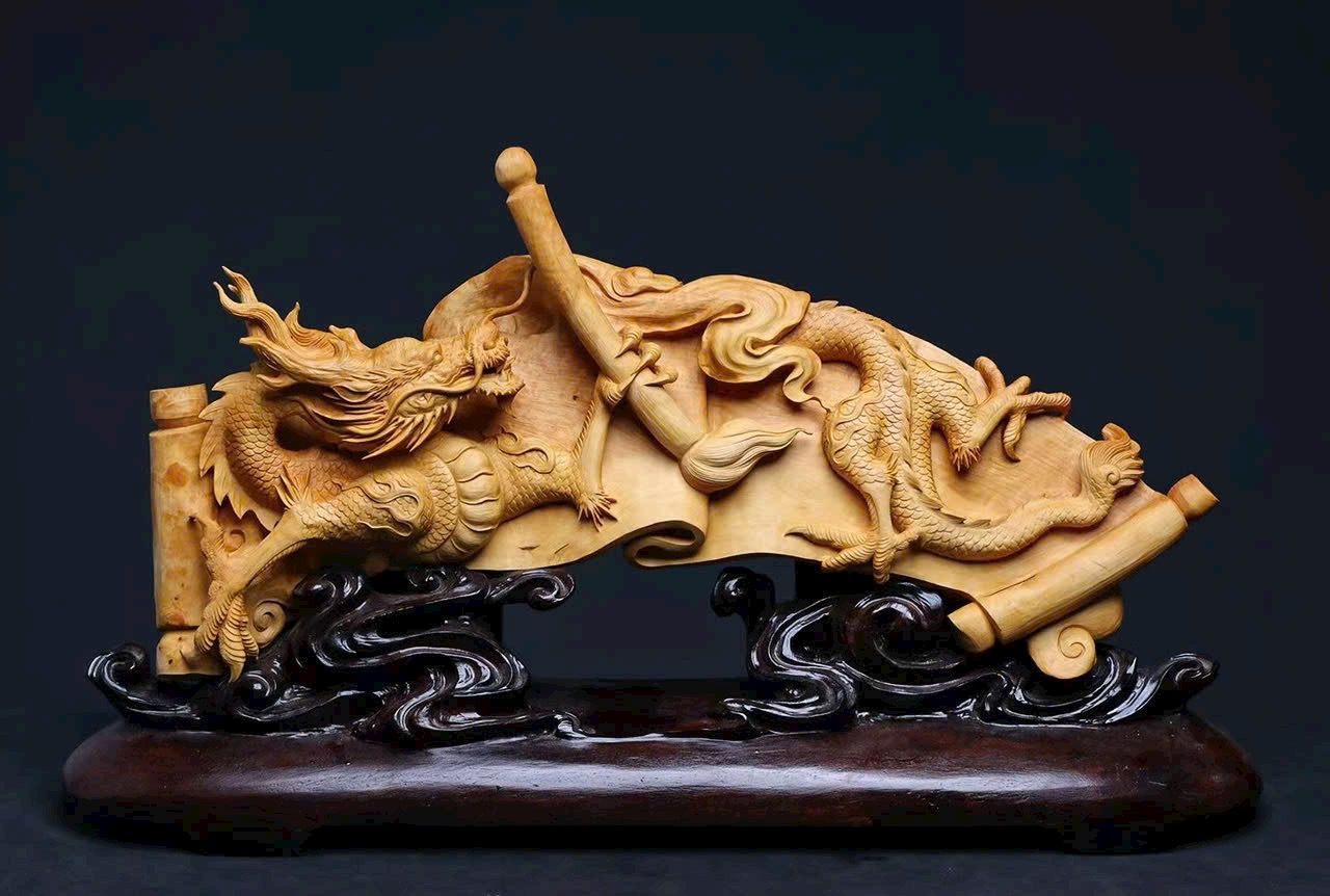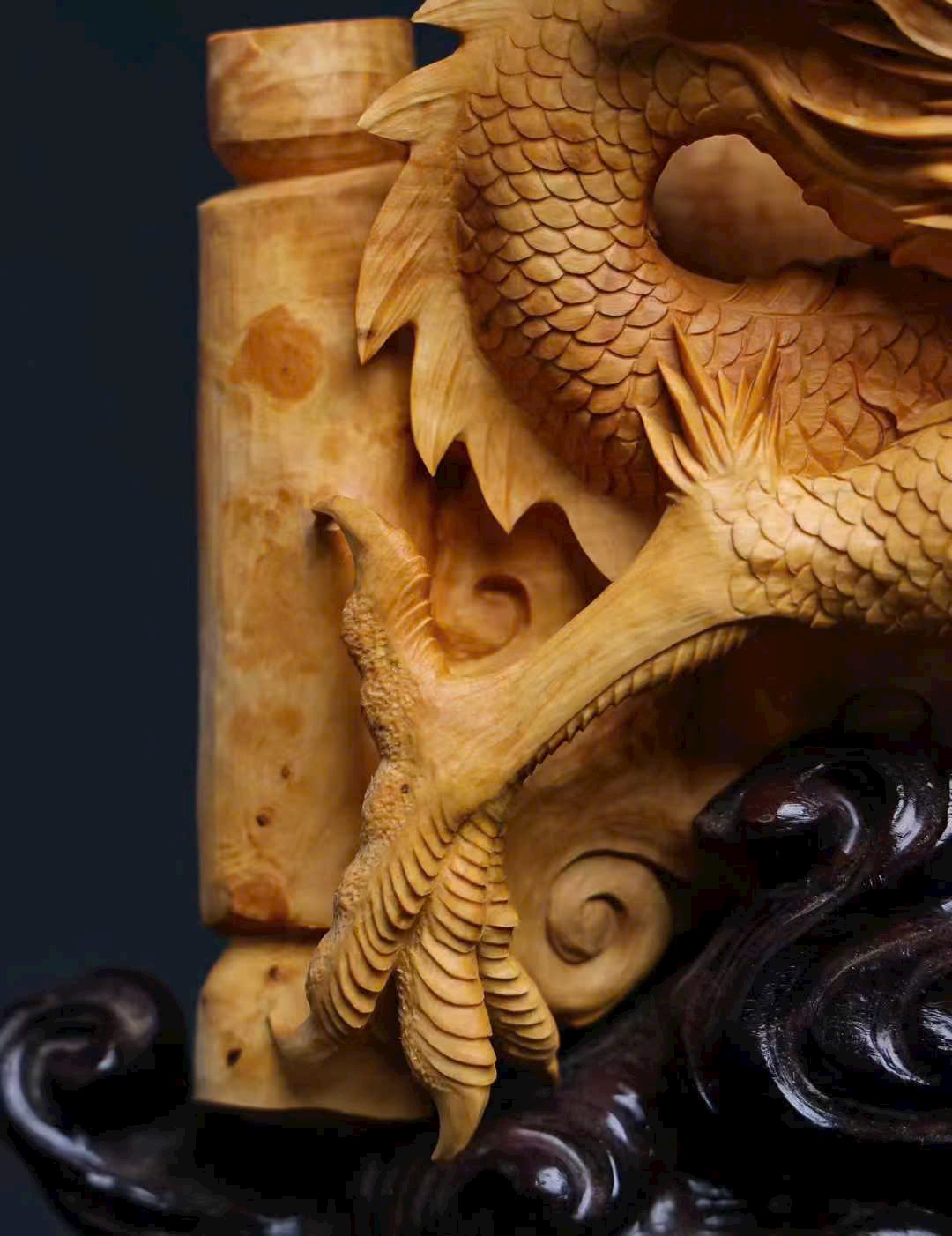 Tác phẩm thủ công từ nguyên khối gỗ hoàng dương, thân rồng uốn lượn linh hoạt, mang ý nghĩa rồng bay bốn biển, công danh thăng tiến. Rồng giữ bút tượng trưng kim bảng đề danh. Toàn bộ chạm khắc tinh xảo, tầng lớp rõ ràng.