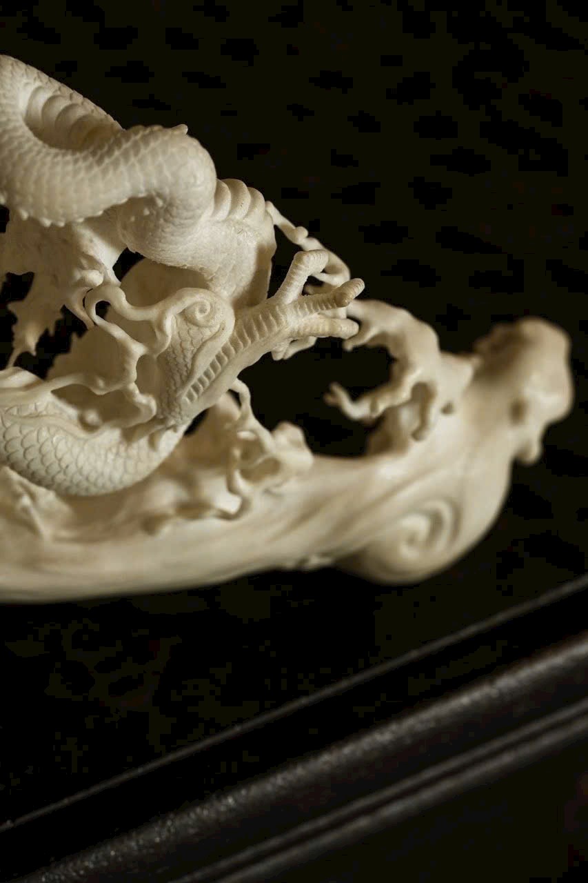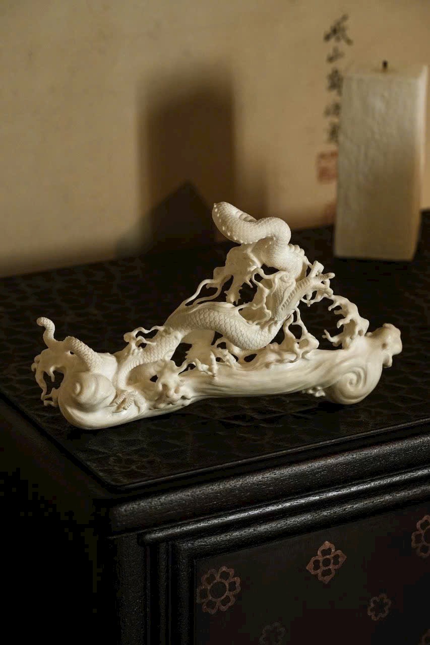 Mặt chính chạm rồng thiêng cưỡi sóng, mắt giận xé mây, râu bay phấp phới, đuôi quét biển, vảy sắc như thép. Đường dao uyển chuyển, chỗ cứng như chẻ đá, chỗ mềm như mực loang, hòa hợp giữa cương và nhu, thể hiện triết lý “rồng ẩn trong sâu, rồng hiện trên đồng” của Kinh Dịch.