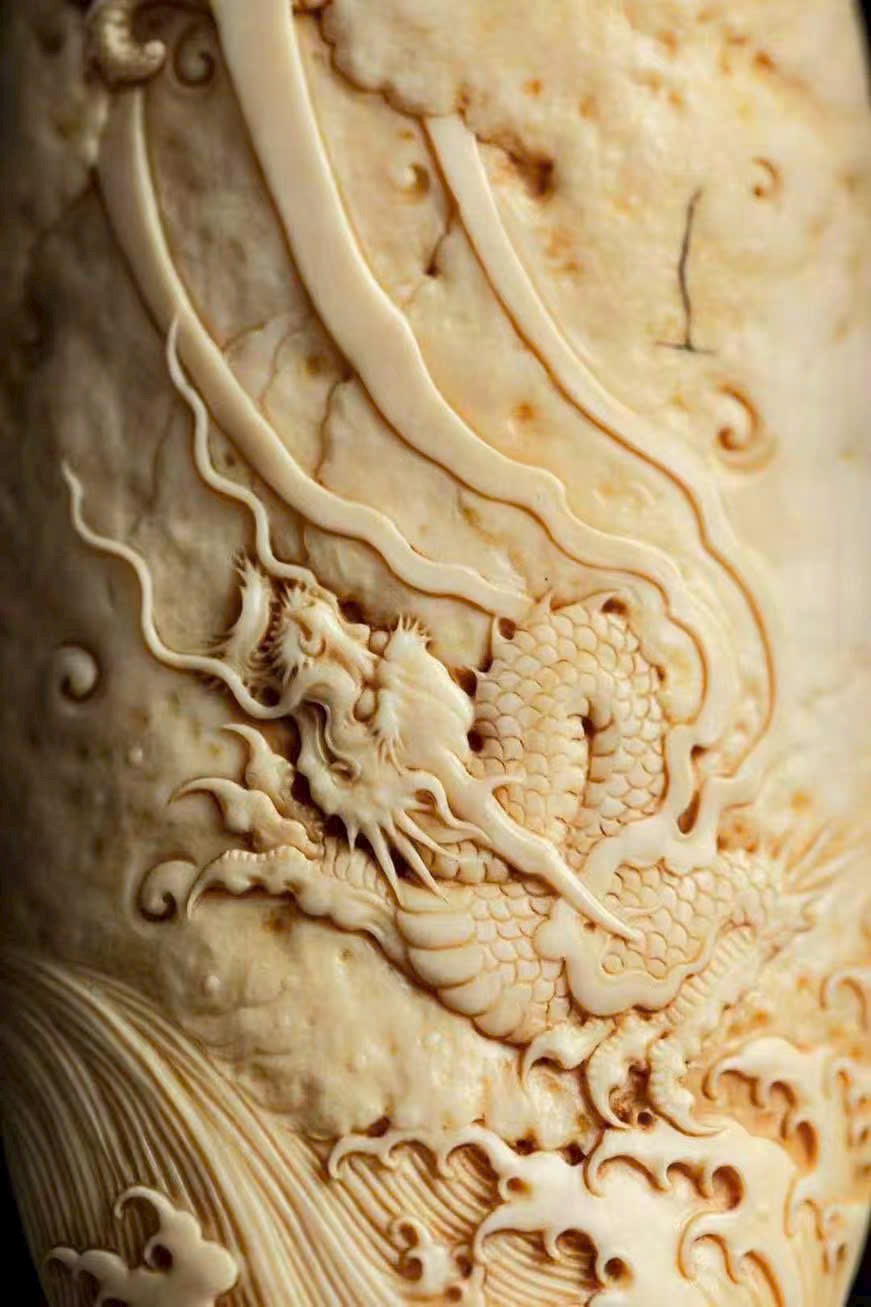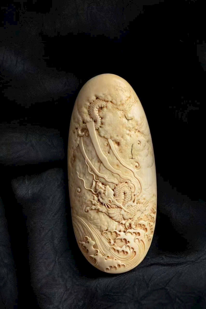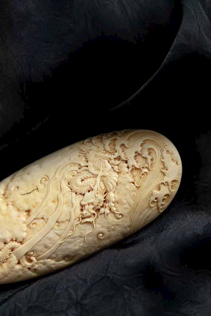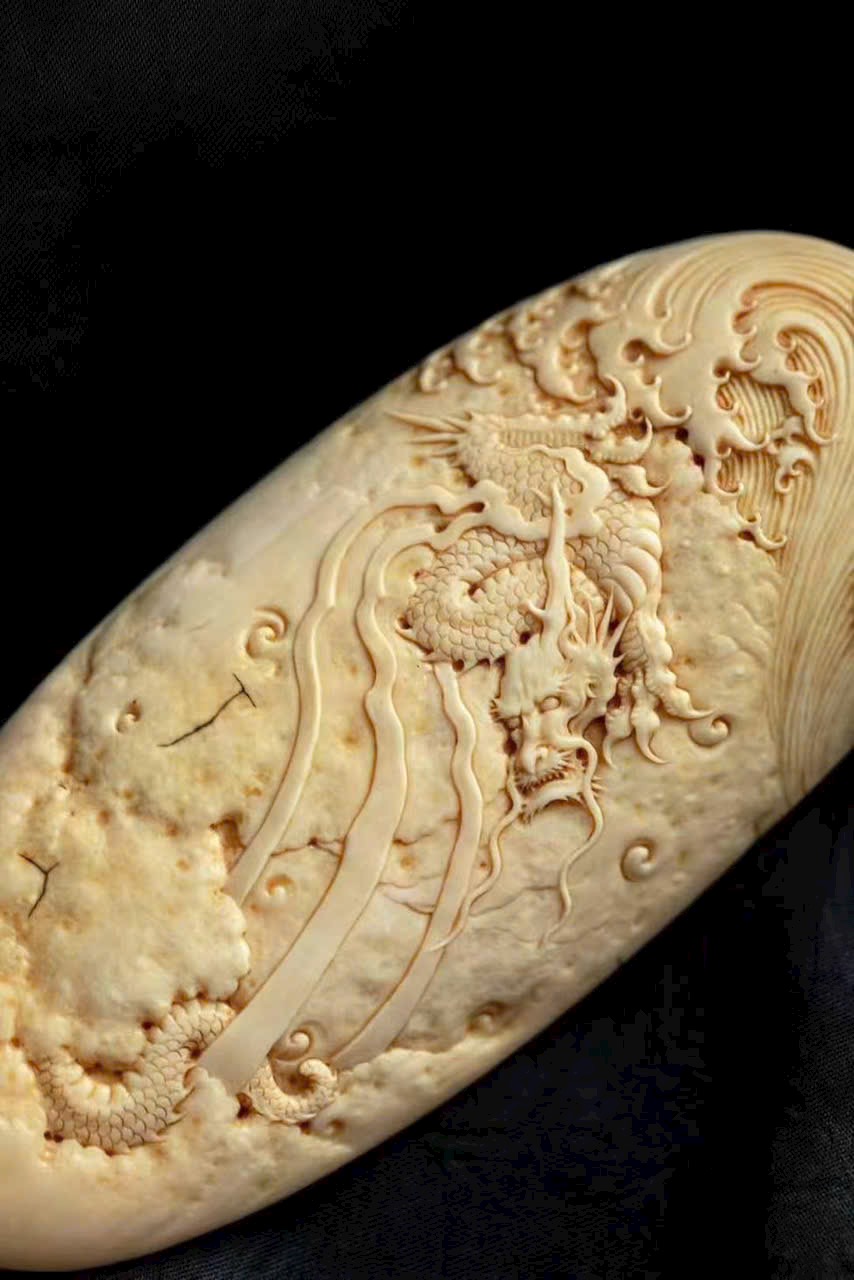 Dùng kỹ pháp chạm nổi nông, khắc hình rồng lành cuộn xoáy bay lên, đứng trên mây, năm móng giương mạnh. Thân rồng ẩn hiện xuyên giữa mây lành, biển mây dâng trào, hư thực xen hòa, khí vận sinh động.