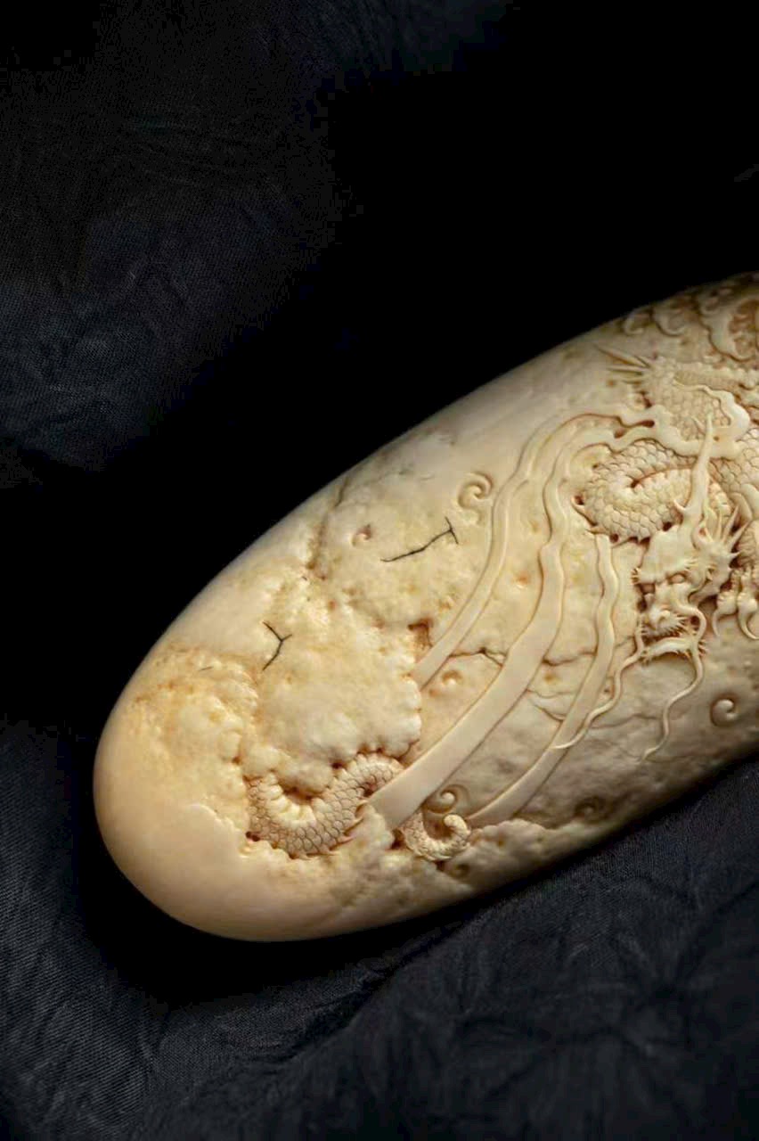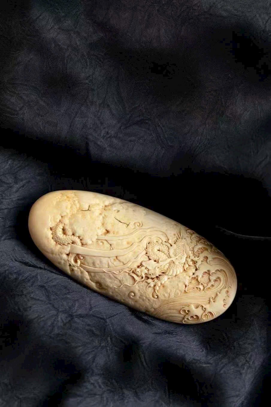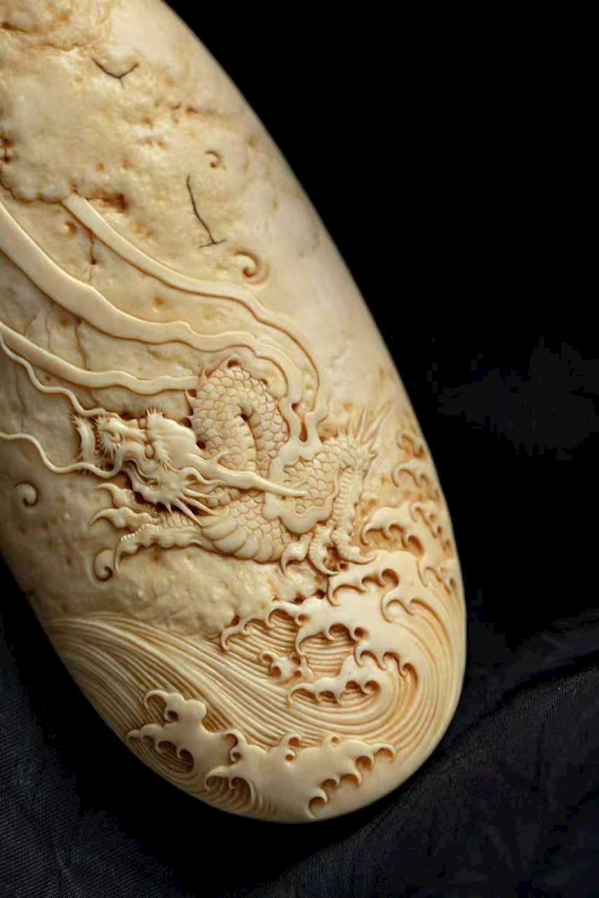 Dùng kỹ pháp chạm nổi nông, khắc hình rồng lành cuộn xoáy bay lên, đứng trên mây, năm móng giương mạnh. Thân rồng ẩn hiện xuyên giữa mây lành, biển mây dâng trào, hư thực xen hòa, khí vận sinh động.