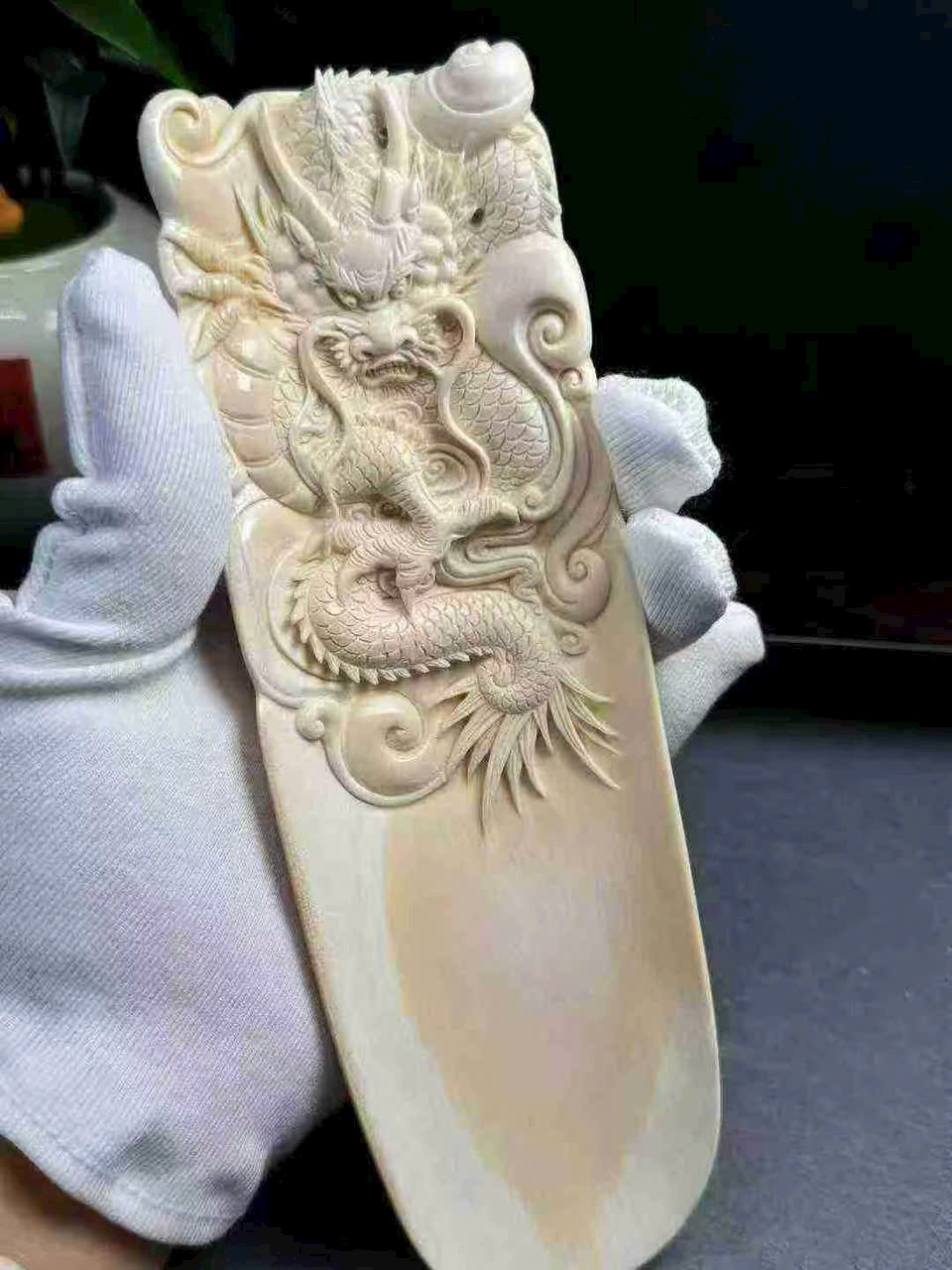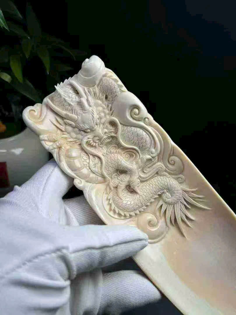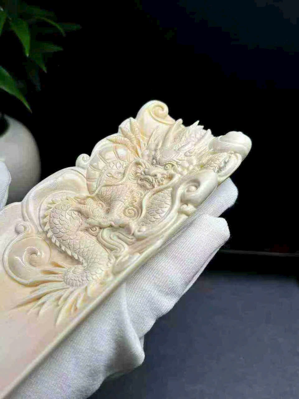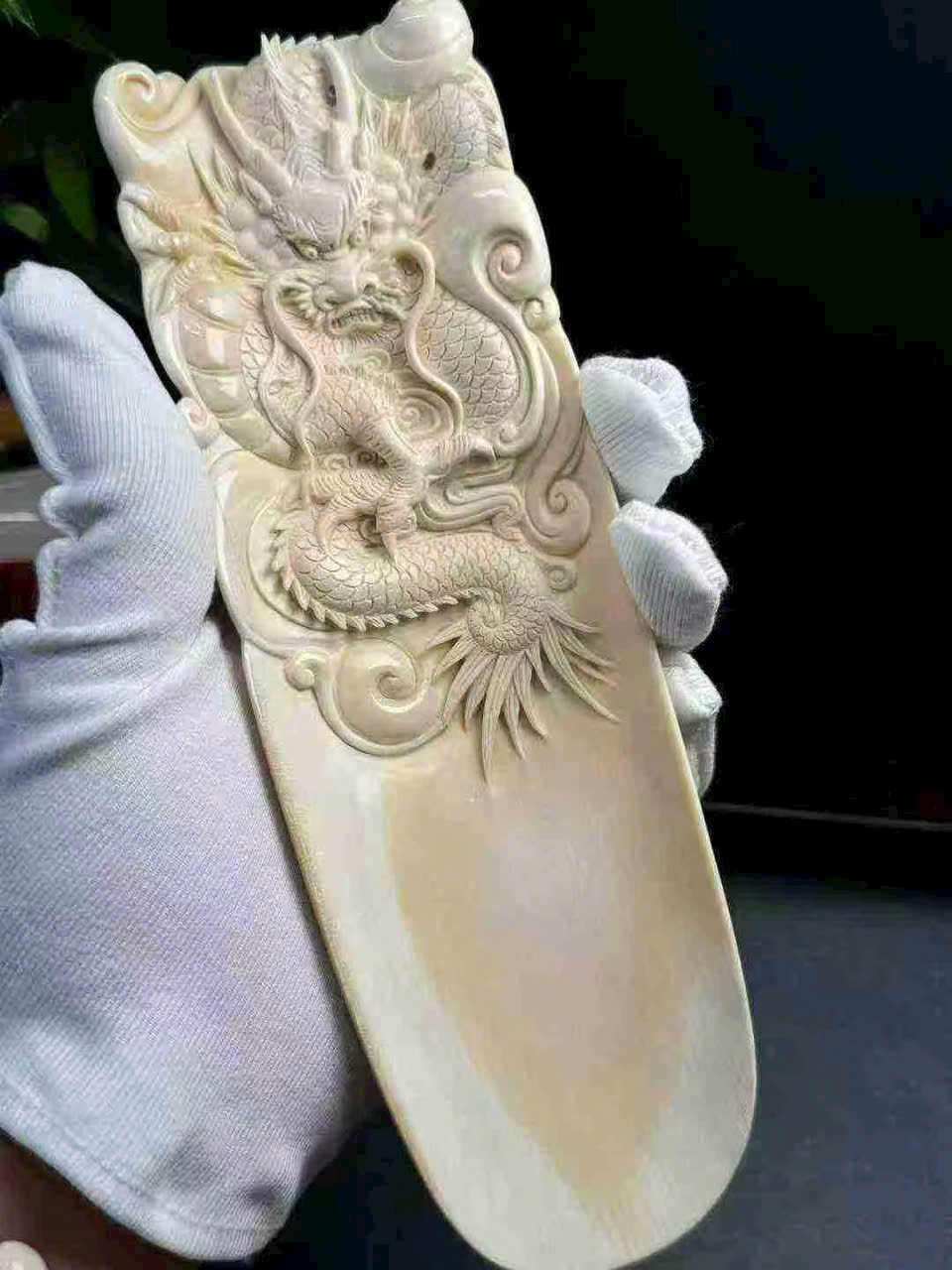 Chất n.gà trong mượt, thanh nhuận; đường đao khoáng đạt, lão luyện. Hình rồng ẩn hiện uyển chuyển, tựa như du ngoạn giữa biển mây, khí thế mạnh mẽ và sinh động. Tác phẩm tinh xảo, tay nghề nổi bật.