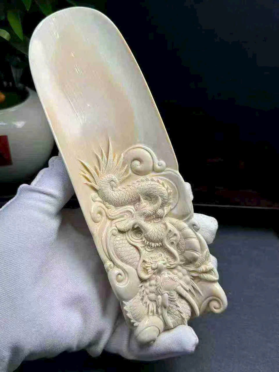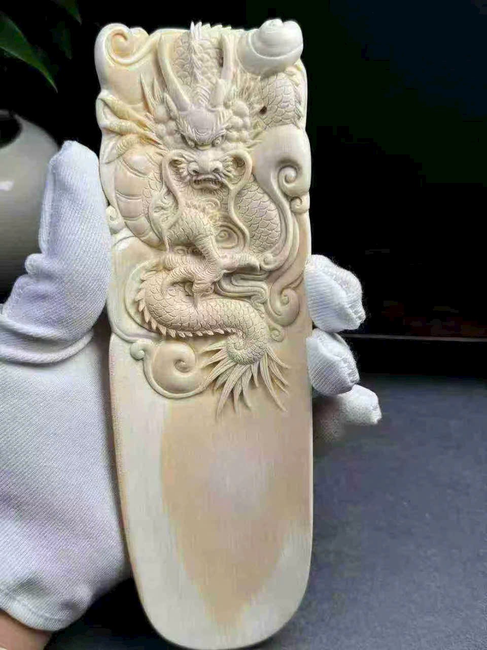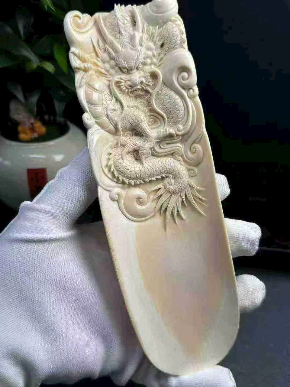Chất n.gà trong mượt, thanh nhuận; đường đao khoáng đạt, lão luyện. Hình rồng ẩn hiện uyển chuyển, tựa như du ngoạn giữa biển mây, khí thế mạnh mẽ và sinh động. Tác phẩm tinh xảo, tay nghề nổi bật.